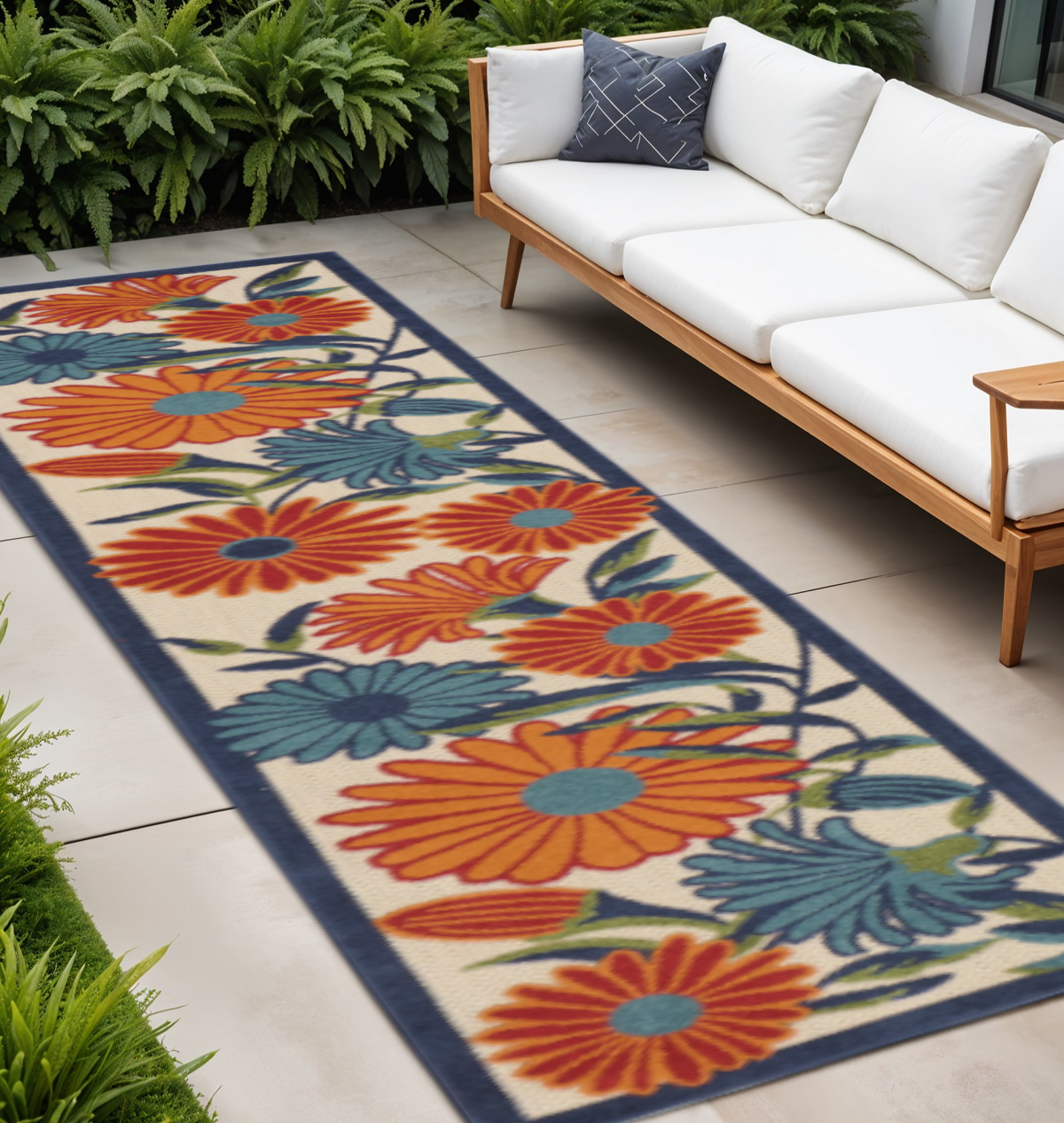floral indoor outdoor runner rug, indoor outdoor runner rug, outdoor runner rug, ivory blue orange floral indoor, orange floral indoor outdoor runner |