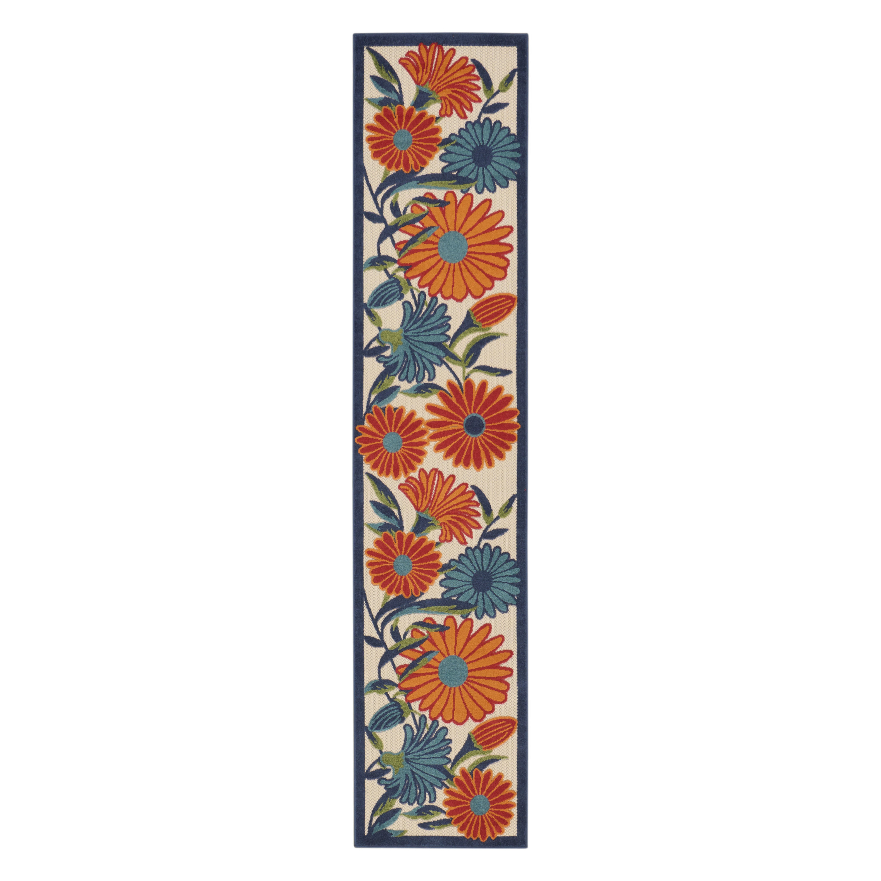 Add great coloration and comfortable texture to your space with this 8-foot ivory blue and orange floral indoor outdoor runner rug. This runner shaped rug features a floral design that will work well both indoors or out. A classic shape marries with good looking design for your living room, hall, bedroom, porch, patio, or poolside. Ideal for outdoor spaces or high traffic areas with kids and pets, this rug is made from heavy duty polypropylene that is stain resistant to help repel water, dirt, and stains. Makes a great way to dress up your patio, porch, or poolside, but also works well as a durable and easy to maintain option in the kitchen, family room, or mudroom. 27-inch h x 96-inch w x 0.25-inch d.