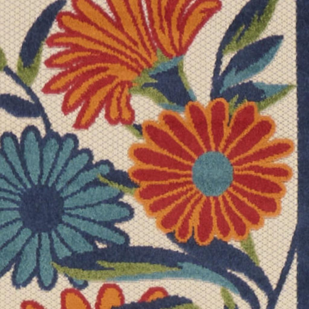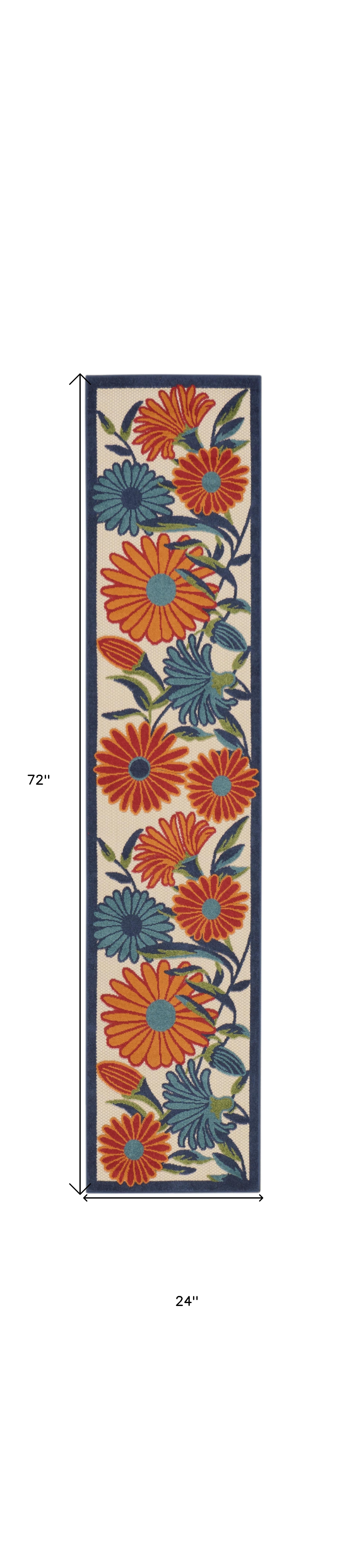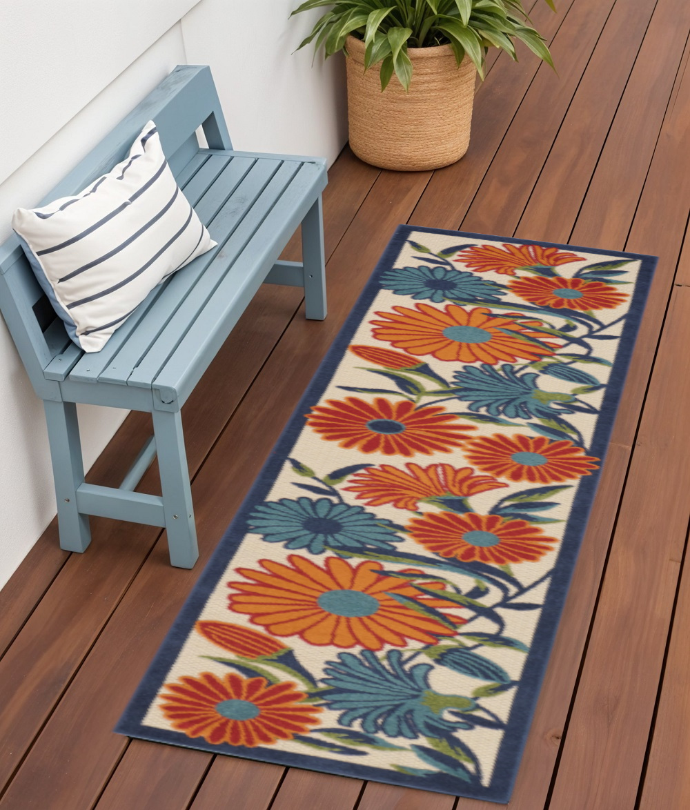 Set an inviting tone in your space with this 6-foot ivory blue and orange floral indoor outdoor runner rug. This runner shaped rug features a floral design that will work well both indoors or out. A classic shape marries with good looking design for your living room, hall, bedroom, porch, patio, or poolside. Ideal for outdoor spaces or high traffic areas with kids and pets, this rug is made from heavy duty polypropylene that is stain resistant to help repel water, dirt, and stains. Versatile in use, durable, and easy to maintain, this rug is an ideal solution to add a decorative and inviting touch to your indoor or outdoor space. 24-inch h x 72-inch w x 0.25-inch d.