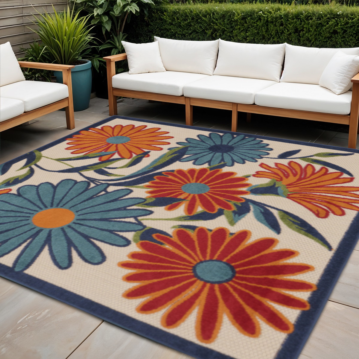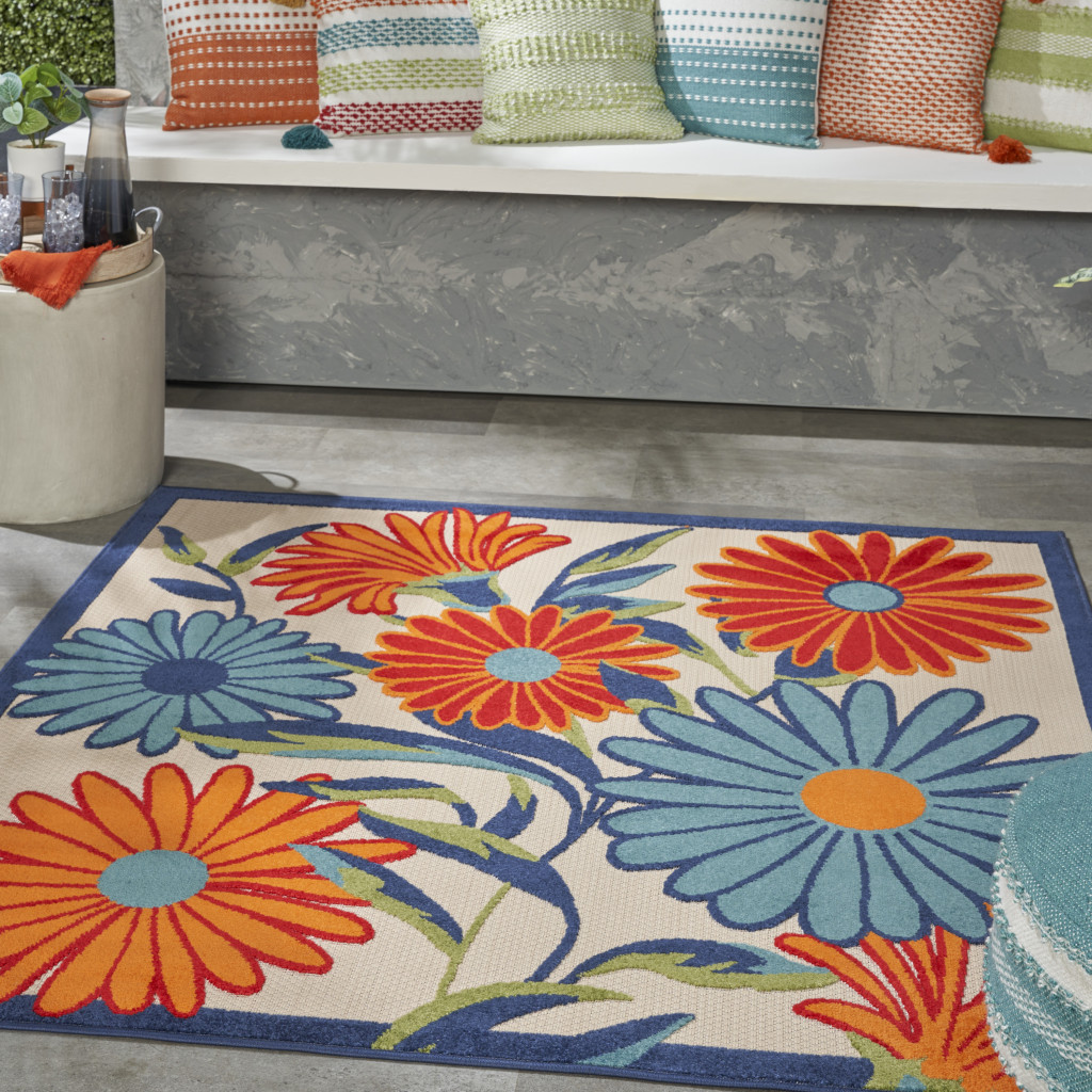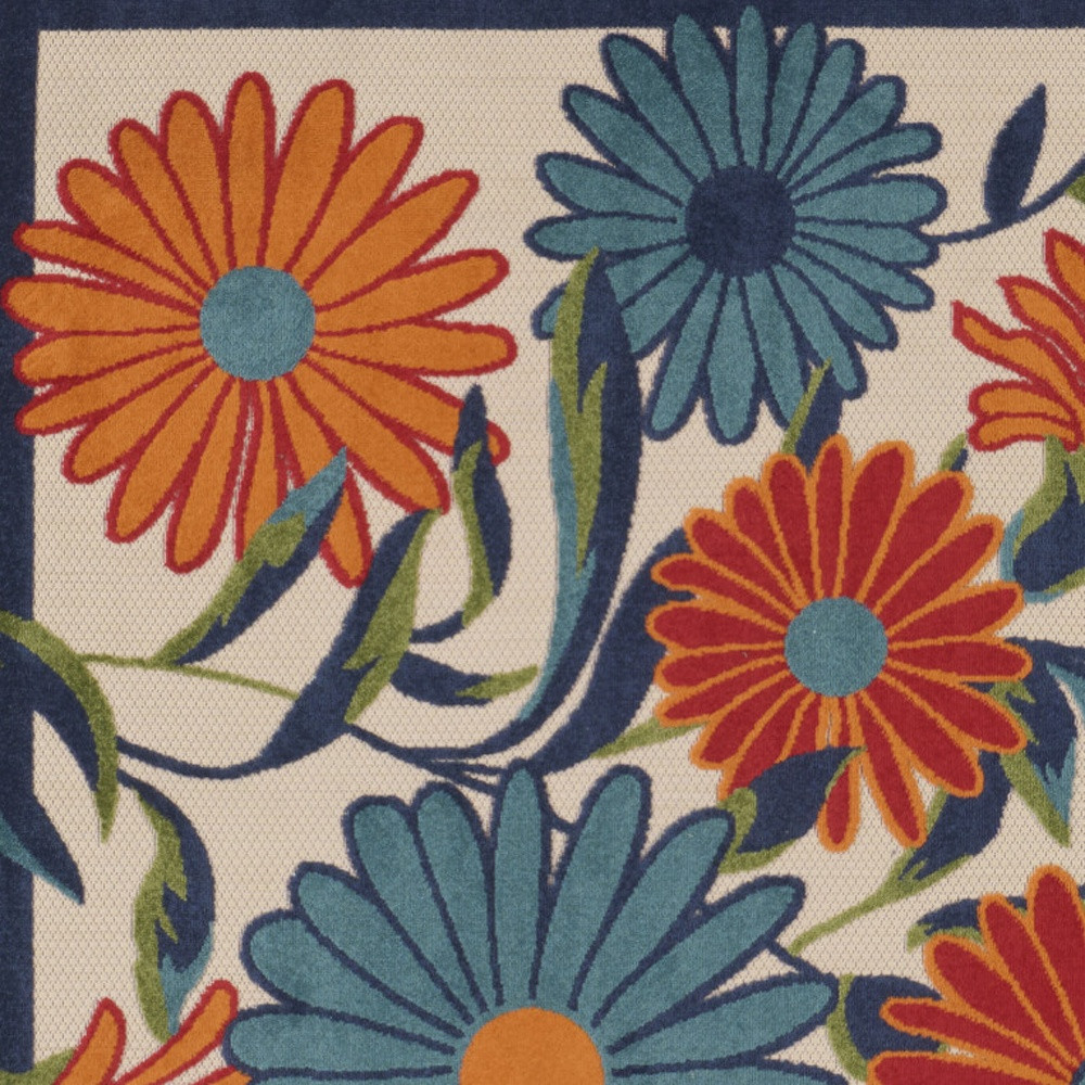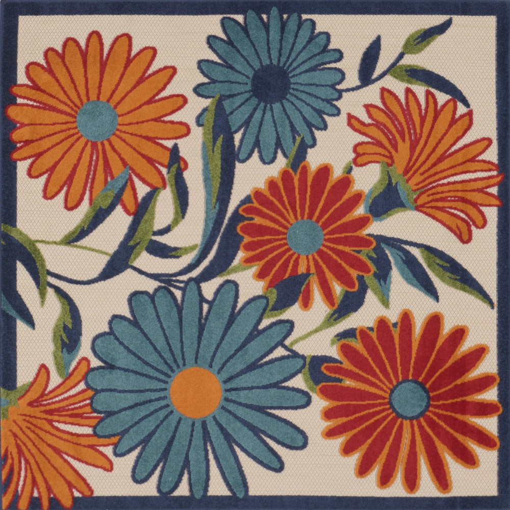 floral indoor outdoor area rug, indoor outdoor area rug, outdoor area rug, blue orange square floral indoor, ivory blue orange square |