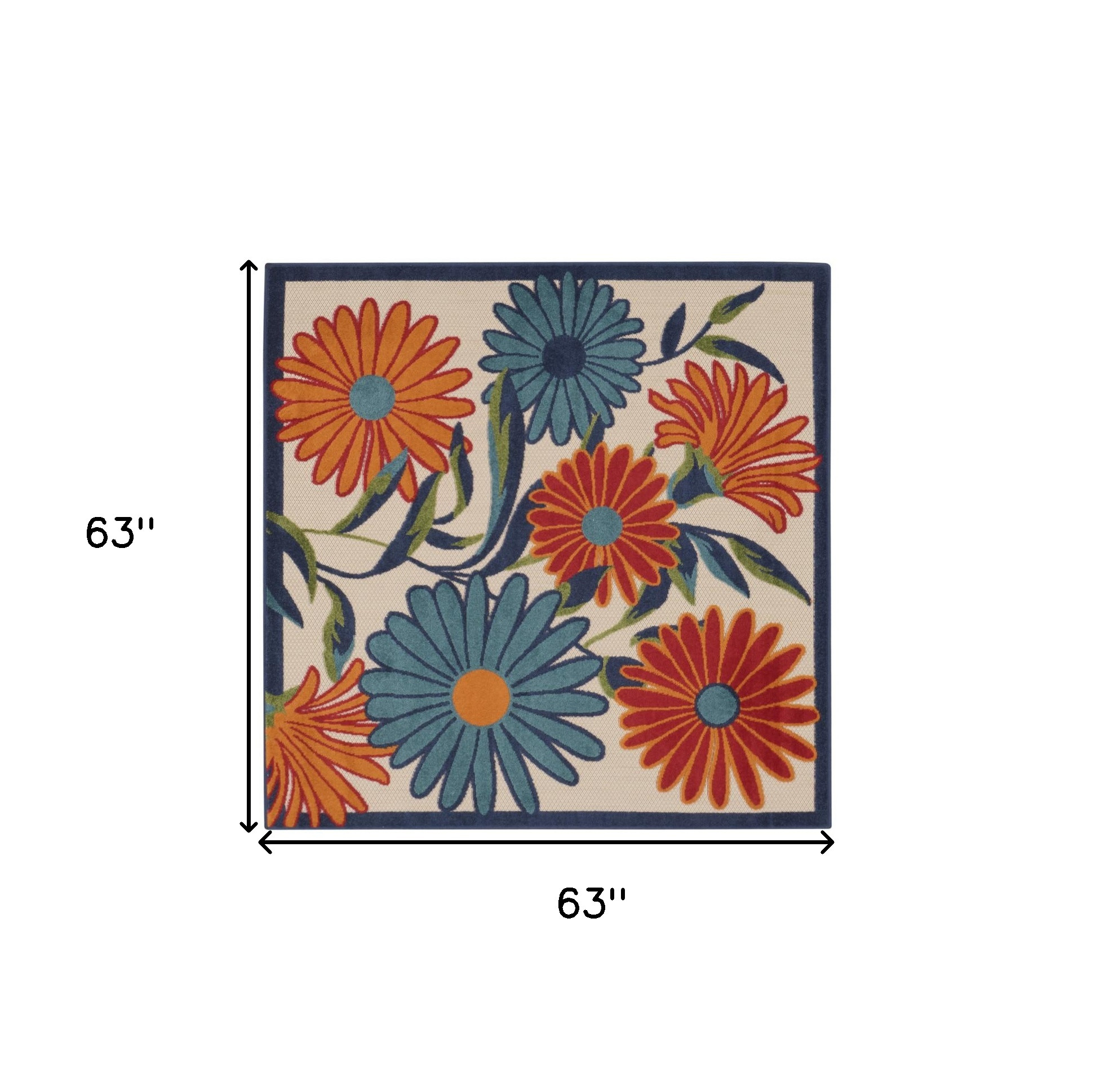 Add great coloration and comfortable texture to your space with this 5-foot ivory blue and orange square floral indoor outdoor area rug. This geometric square shaped rug features a floral pattern in ivory, blue, and orange that combines a good looking print with a unique and updated shape. The mix of shape, color, and design gives this rug refreshing visual interest. Ideal for outdoor spaces or high traffic areas with kids and pets, this rug is made from heavy duty polypropylene that is stain resistant to help repel water, dirt, and stains. Makes a great way to dress up your patio, porch, or poolside, but also works well as a durable and easy to maintain option in the kitchen, family room, or mudroom. 63-inch h x 63-inch w x 0.25-inch d.