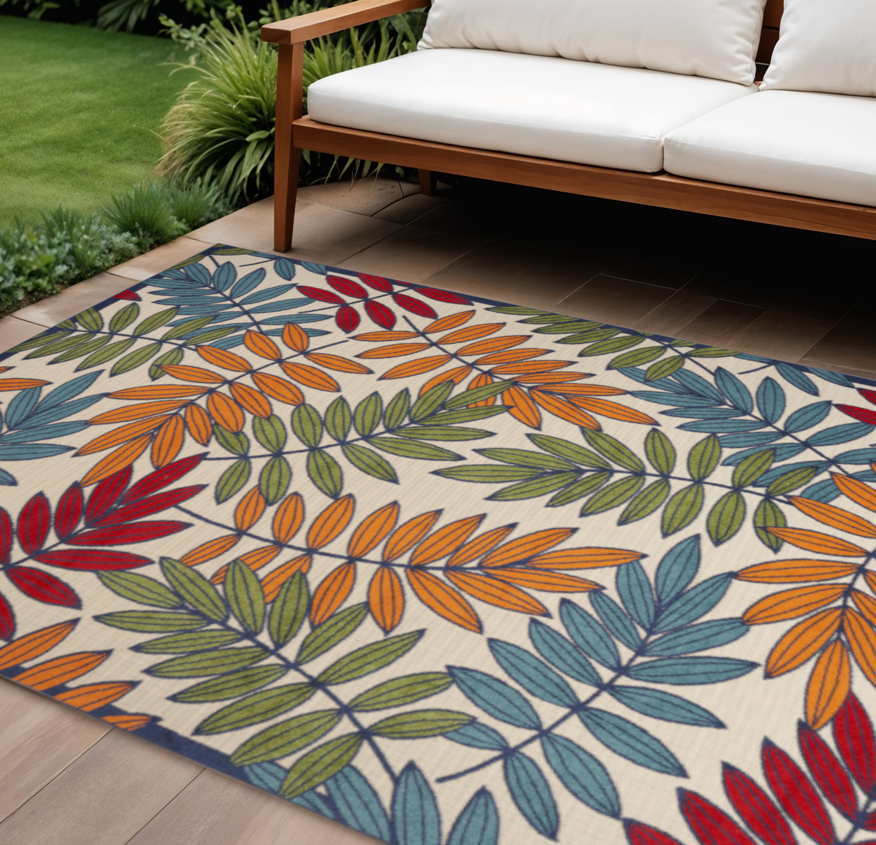 leaf indoor outdoor area rug, indoor outdoor area rug, outdoor area rug, green blue palm leaf indoor, 10' X 14' ivory yellow orange green |