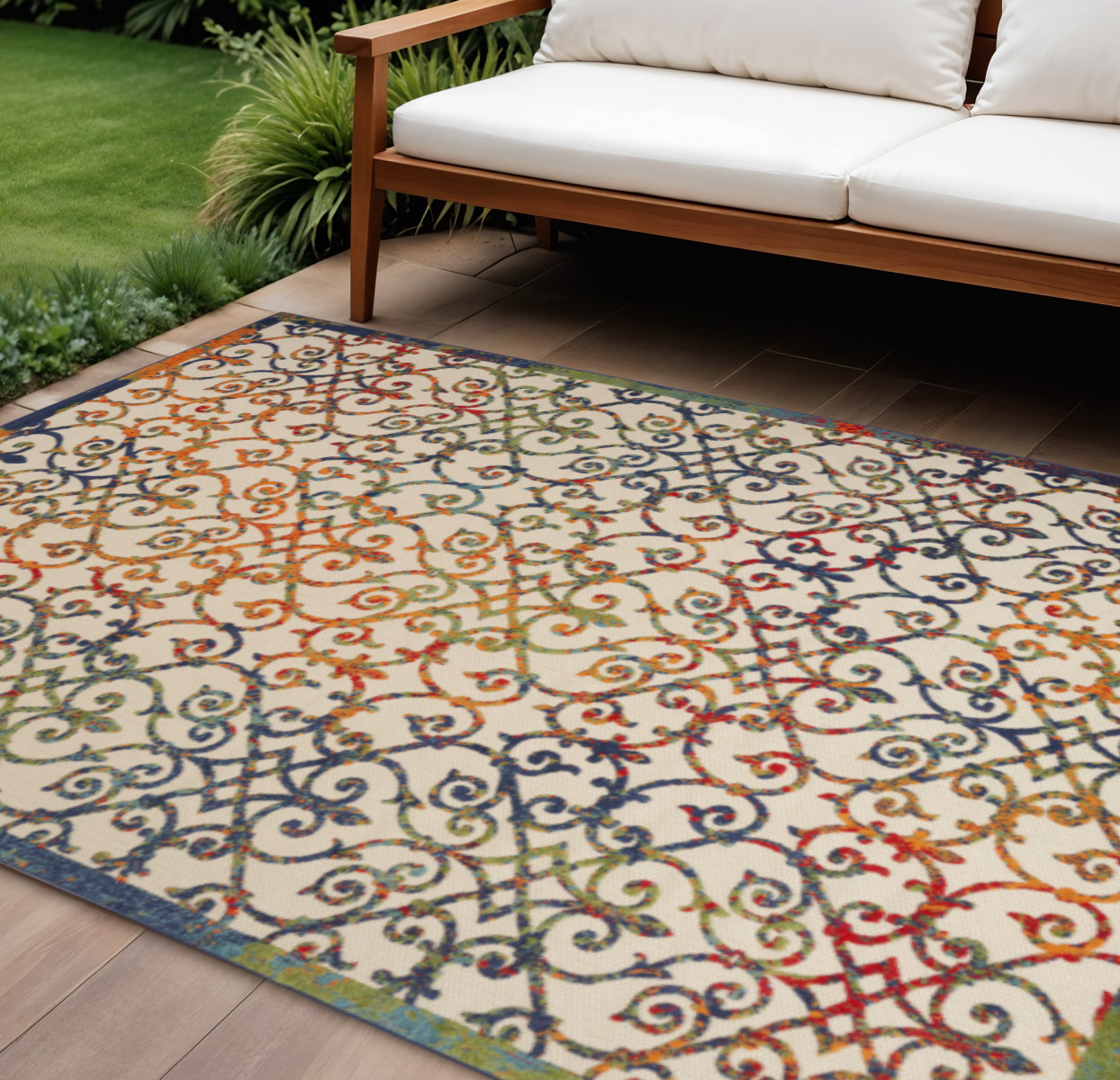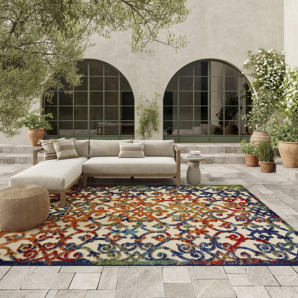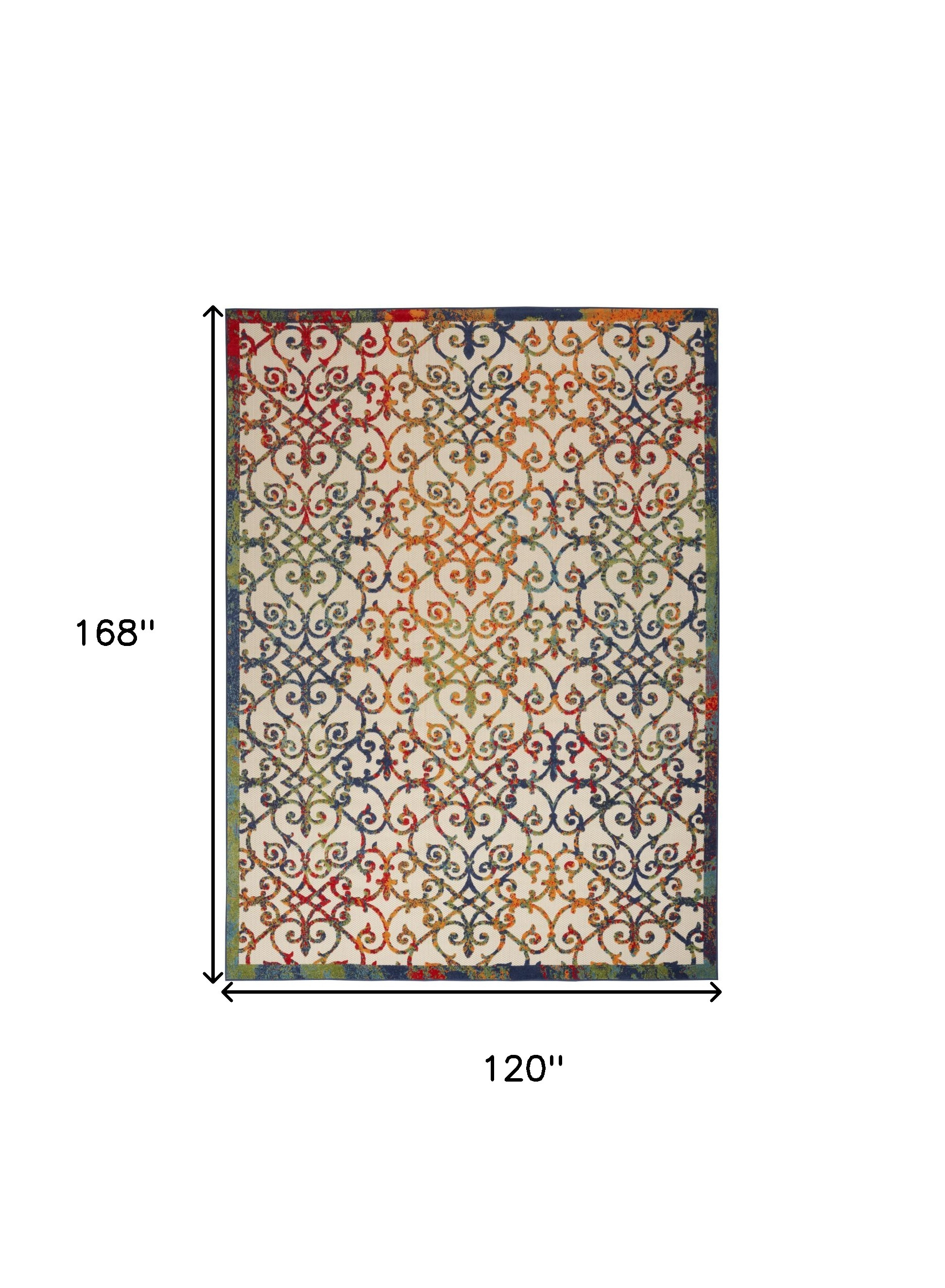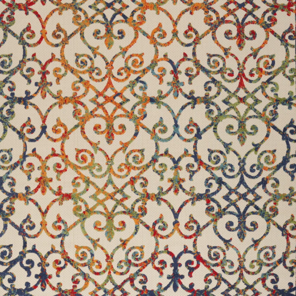 Add great coloration and comfortable texture to your space with this 10-foot x 14-foot ivory blue orange green and red medallion indoor outdoor area rug. This rectangle shaped rug features a medallion design that will work well both indoors or out. A classic shape marries with good looking design for your living room, hall, bedroom, porch, patio, or poolside. Ideal for outdoor spaces or high traffic areas with kids and pets, this rug is made from heavy duty polypropylene that is stain resistant to help repel water, dirt, and stains. Versatile in use, durable, and easy to maintain, this rug is an ideal solution to add a decorative and inviting touch to your indoor or outdoor space. 120-inch h x 168-inch w x 0.25-inch d.