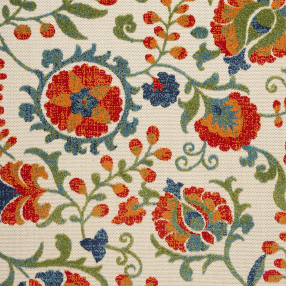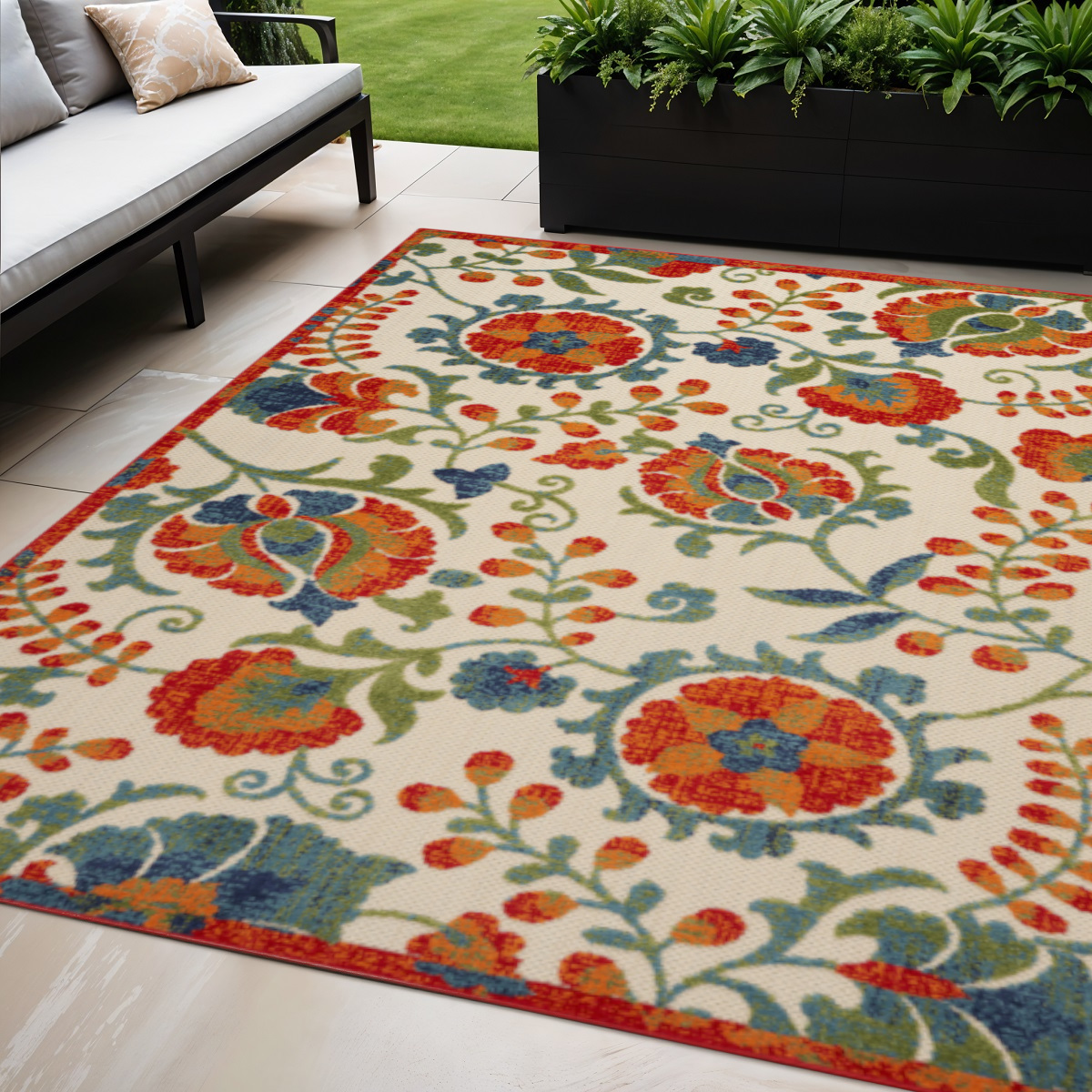 Set an inviting tone in your space with this 5-foot x 8-foot red gold green and teal blue floral indoor outdoor area rug. This rectangle shaped rug features a floral design that will work well both indoors or out. A classic shape marries with good looking design for your living room, hall, bedroom, porch, patio, or poolside. Ideal for outdoor spaces or high traffic areas with kids and pets, this rug is made from heavy duty polypropylene that is stain resistant to help repel water, dirt, and stains. Versatile in use, durable, and easy to maintain, this rug is an ideal solution to add a decorative and inviting touch to your indoor or outdoor space. 63-inch h x 89-inch w x 0.25-inch d.