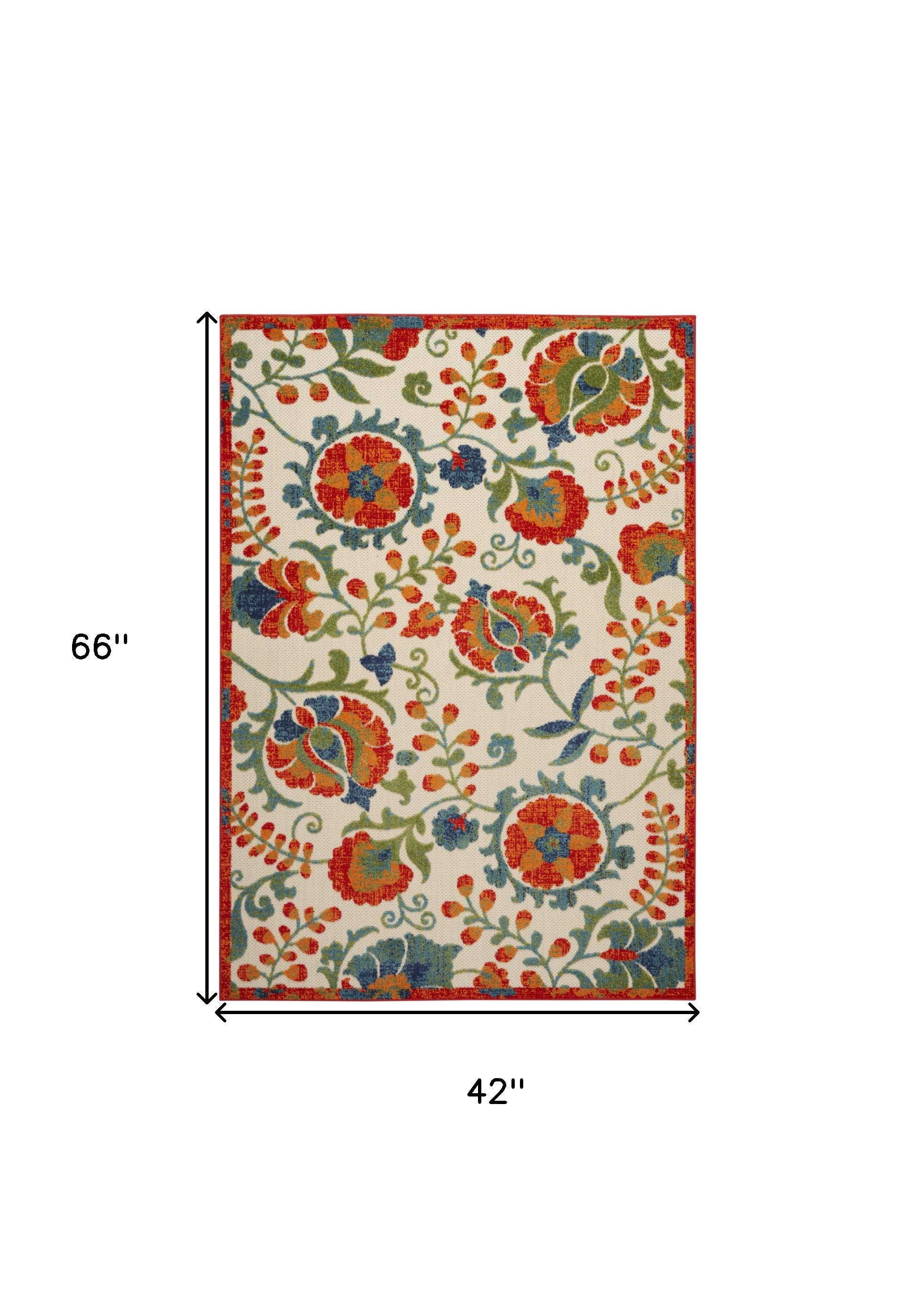 This 4-foot x 6-foot red gold green and teal blue floral indoor outdoor area rug, is a great way to add warmth to a room. This rectangle shaped rug features a floral design that will work well both indoors or out. A classic shape marries with good looking design for your living room, hall, bedroom, porch, patio, or poolside. Ideal for outdoor spaces or high traffic areas with kids and pets, this rug is made from heavy duty polypropylene that is stain resistant to help repel water, dirt, and stains. Versatile in use, durable, and easy to maintain, this rug is an ideal solution to add a decorative and inviting touch to your indoor or outdoor space. 42-inch h x 66-inch w x 0.25-inch d.