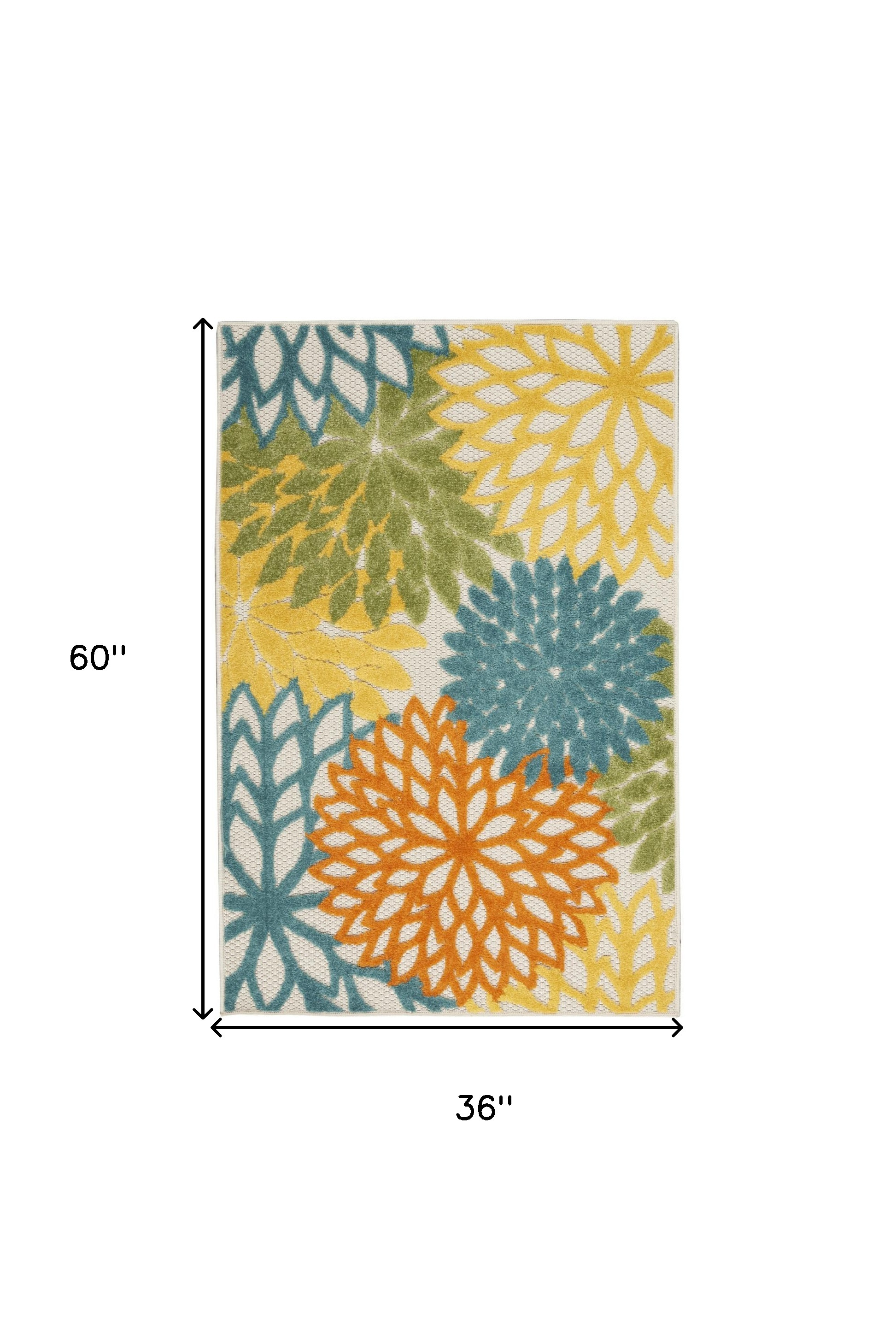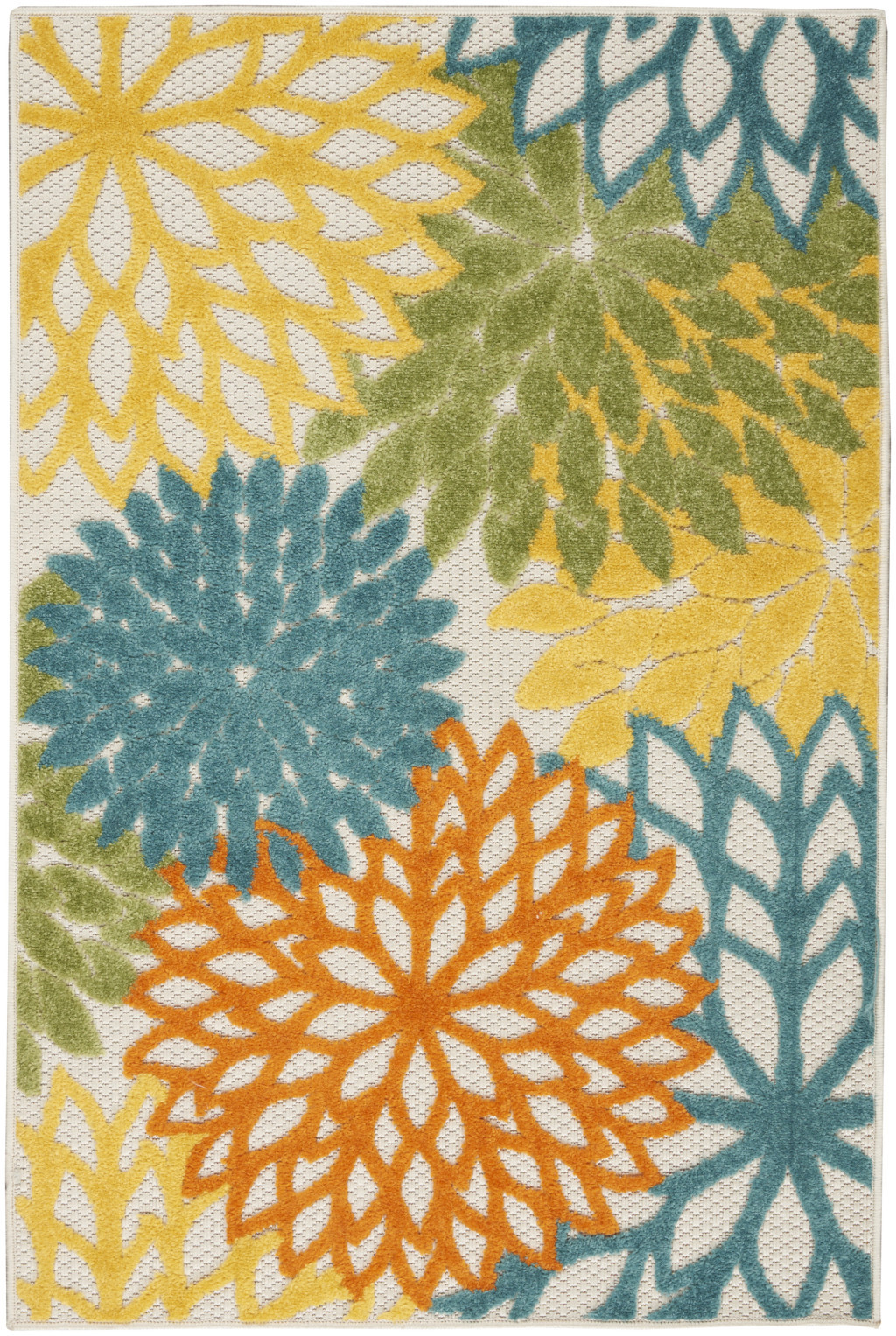 Add some artistry to your room with this 3-foot x 5-foot turquoise yellow orange and blue floral indoor outdoor area rug. This rectangle shaped rug features a floral design that will work well both indoors or out. A classic shape marries with good looking design for your living room, hall, bedroom, porch, patio, or poolside. Ideal for outdoor spaces or high traffic areas with kids and pets, this rug is made from heavy duty polypropylene that is stain resistant to help repel water, dirt, and stains. Versatile in use, durable, and easy to maintain, this rug is an ideal solution to add a decorative and inviting touch to your indoor or outdoor space. 36-inch h x 60-inch w x 0.25-inch d.