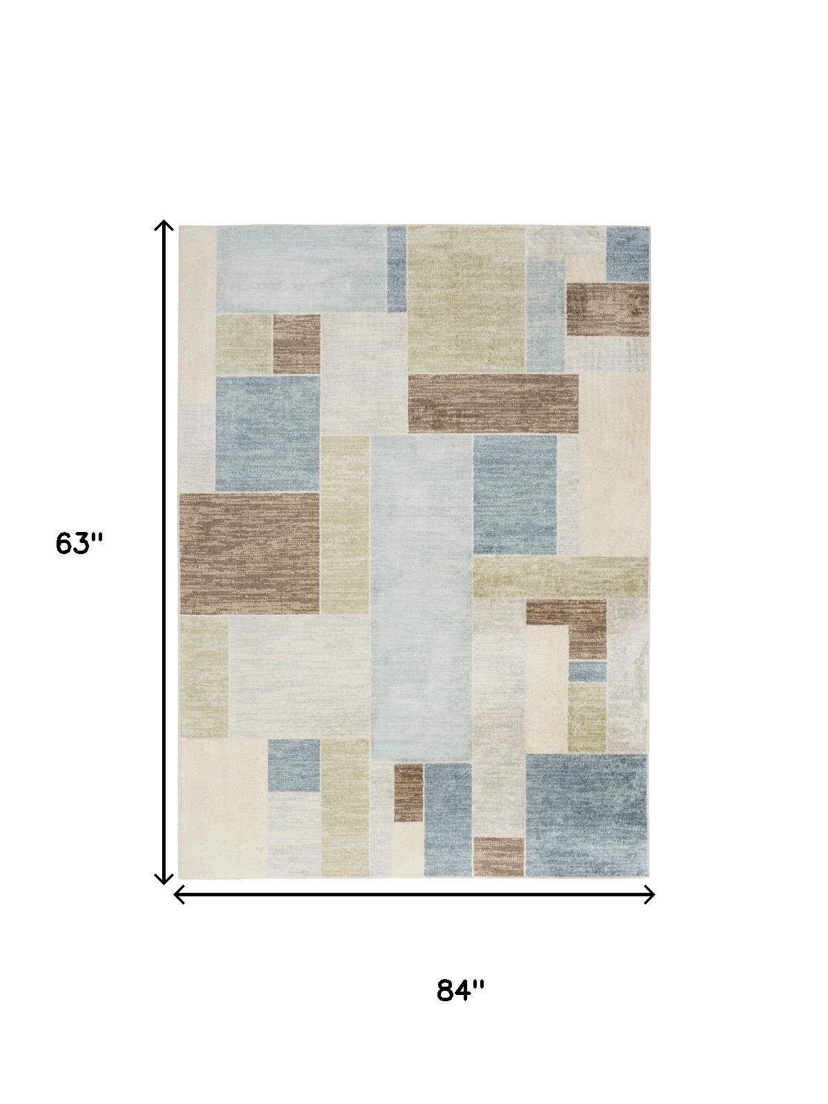 Set an inviting tone in your space with this 5-foot x 7-foot blue brown and tan geometric washable area rug. Ideal for spaces with kids and pets, this rug is stain resistant to help repel dirt and spilled liquids. Built to last, this rug crafted from polyester fibers is known for its durability and long lasting appeal. Rugs are a great way to showcase your style, hide imperfections, warm your home and reduce noise. This larger sized, modern styled rug is ready to create a focal point or statement piece in your room. 63-inch h x 84-inch w x 0.25-inch d.