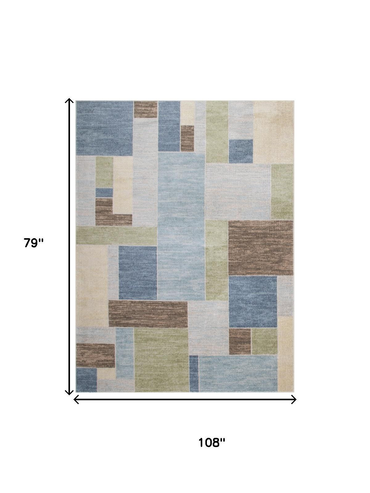 Set an inviting tone in your space with this 7-foot x 9-foot blue brown and tan geometric washable area rug. Ideal for spaces with kids and pets, this rug is stain resistant to help repel dirt and spilled liquids. Built to last, this rug crafted from polyester fibers is known for its durability and long lasting appeal. Rugs are a great way to showcase your style, hide imperfections, warm your home and reduce noise. This larger sized, modern styled rug is ready to create a focal point or statement piece in your room. 79-inch h x 108-inch w x 0.25-inch d.