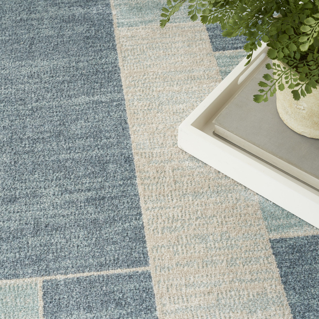 This 7-foot x 9-foot blue and ivory geometric power loom washable area rug, is a great way to add warmth to a room. This rectangle shaped rug features a geometric design in blue and ivory to give it visual interest. A classic shape marries with good looking design for your space place this area rug against a hardwood or tile floor and it will enliven your living space with style and sophistication. 79-inch H x 108-inch W x 0.25-inch D