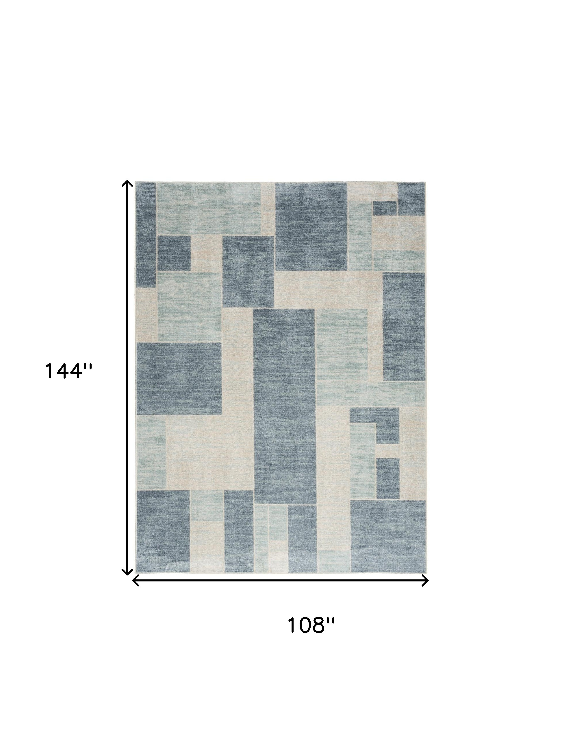 This 9-foot x 12-foot blue and ivory geometric washable area rug, is a great way to add warmth to a room. Ideal for spaces with kids and pets, this rug is stain resistant to help repel dirt and spilled liquids. Built to last, this rug crafted from polyester fibers is known for its durability and long lasting appeal. Rugs are a great way to showcase your style, hide imperfections, warm your home and reduce noise. This larger sized, modern styled rug is ready to create a focal point or statement piece in your room. 108-inch h x 144-inch w x 0.25-inch d.