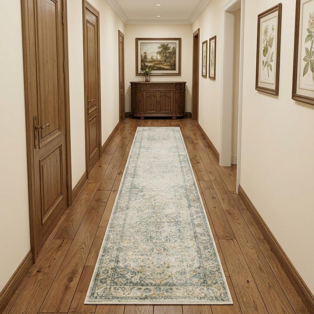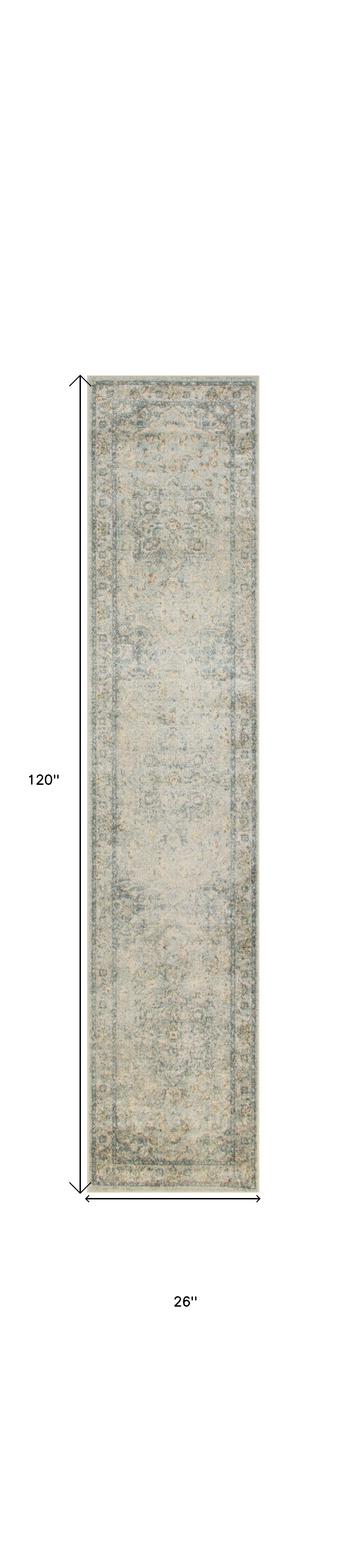 Add great coloration and comfortable texture to your space with this 10-foot blue and ivory floral medallion distressed washable runner rug. Built to last, this rug crafted from polyester fibers is known for its durability and long lasting appeal. Rugs are a great way to showcase your style, hide imperfections, warm your home and reduce noise. This rectangular shaped rug features a abstract design that will add a functional and decorative accent to your space. This traditional style runner makes a great accent for the hallway, in front of cabinets, in the laundry room, or any other space you need a narrow and long rug. 26-inch h x 120-inch w x 0.25-inch d.