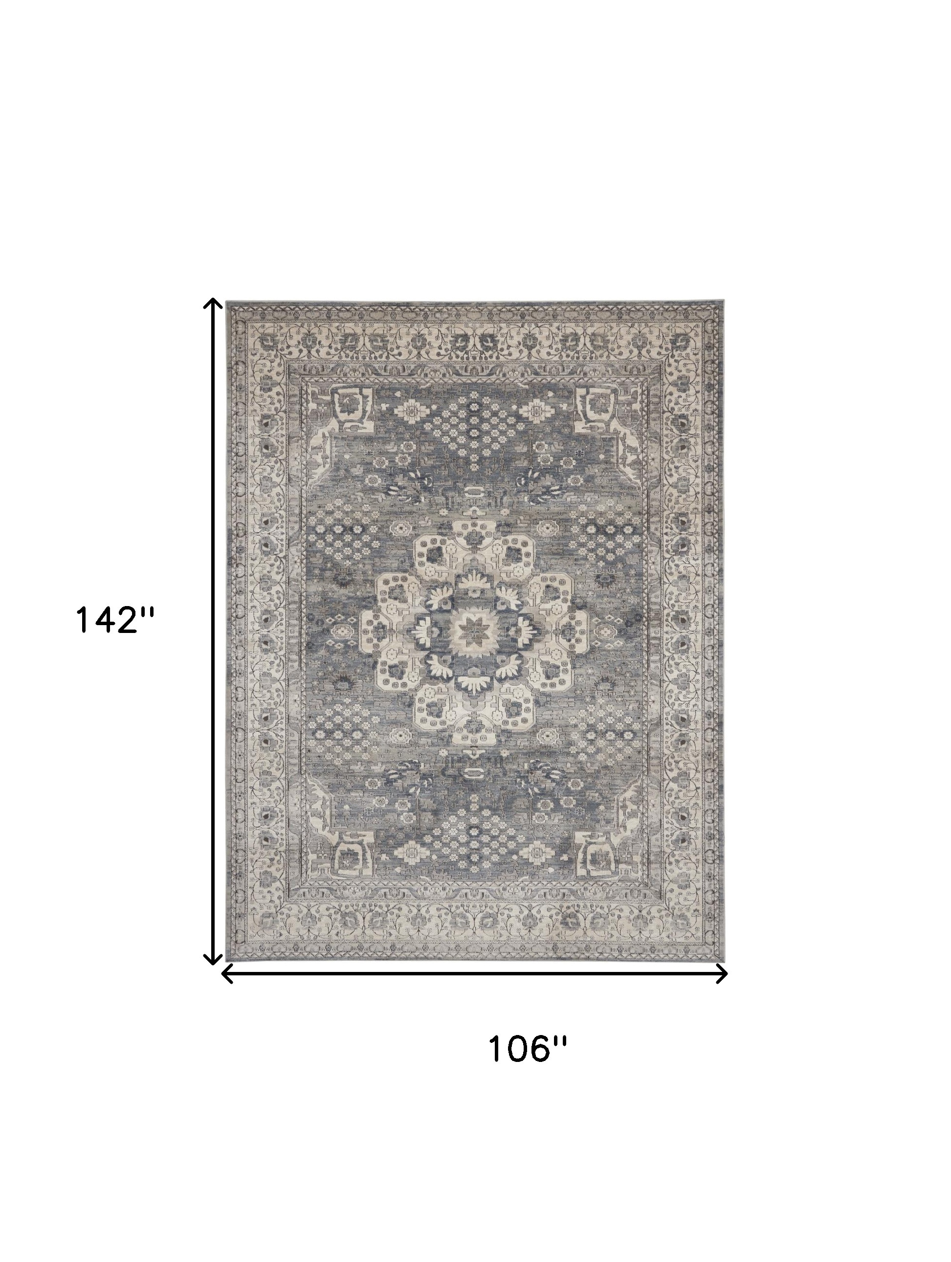 Add great coloration and comfortable texture to your space with this 9-foot x 12-foot gray and ivory medallion power loom area rug. This rectangle shaped rug features a medallion design in gray and ivory to give it visual interest. A classic shape marries with good looking design for your space place this area rug against a hardwood or tile floor and it will enliven your living space with style and sophistication. 106-inch H x 142-inch W x 0.32-inch D