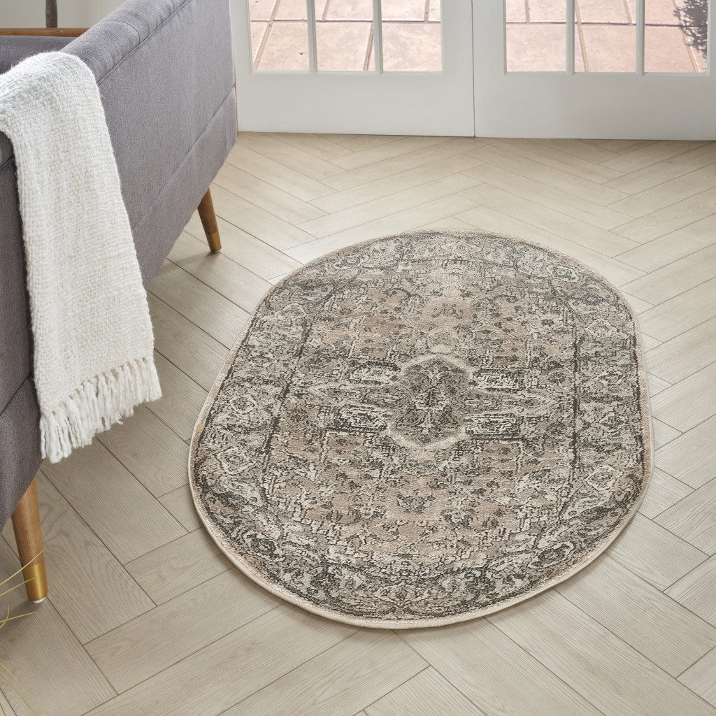 Add some artistry to your room with this 3-foot x 5-foot beige medallion power loom area rug. This oval shaped rug features a medallion design in beige to give it visual interest. A classic shape marries with good looking design for your space the coloring of this rug adds a delightfully neutral tone to your home and will easily match with most any decor. Place this area rug against a hardwood or tile floor and it will enliven your living space with style and sophistication. 36-inch H x 60-inch W x 0.32-inch D