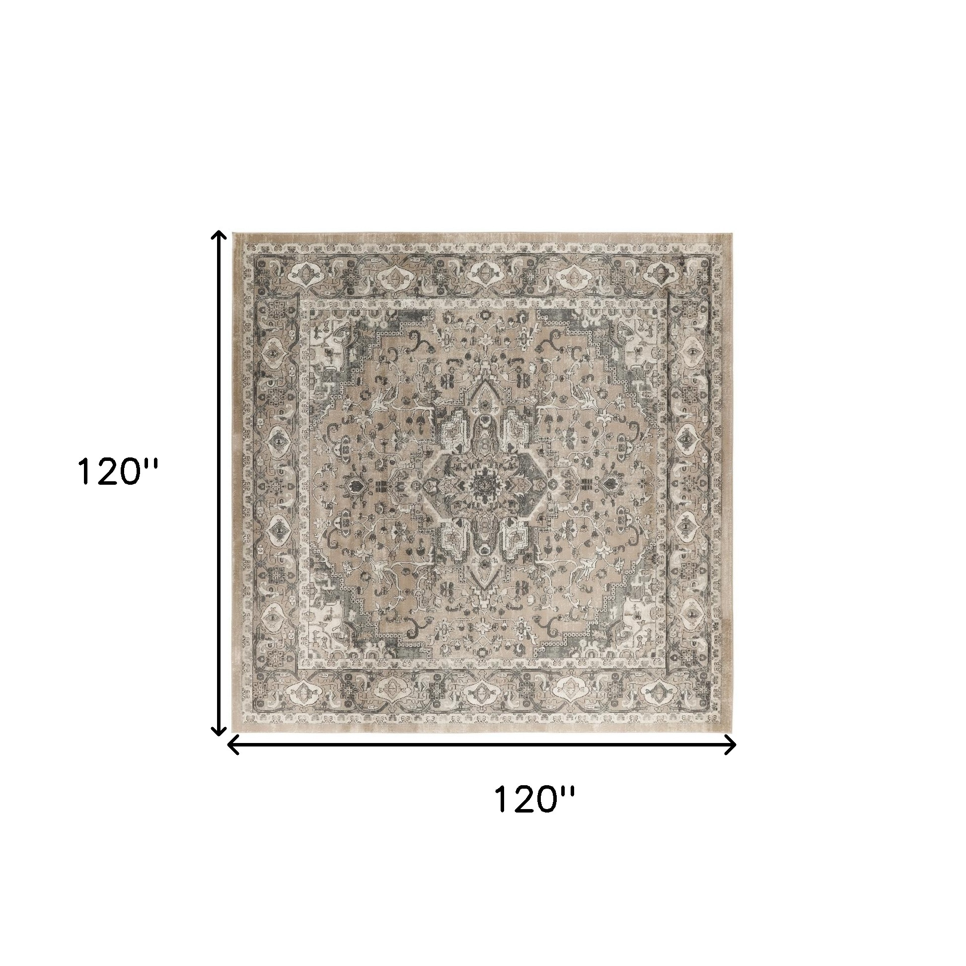 This 10-foot beige and gray square medallion power loom distressed area rug, is a great way to add warmth to a room. This geometric square shaped rug features a medallion pattern in beige and gray that combines a good looking print with a unique and updated shape. The mix of shape, color, and design gives this rug refreshing visual interest. Area rugs help to give warmth and sense of home to your space. 120-inch H x 120-inch W x 0.32-inch D
