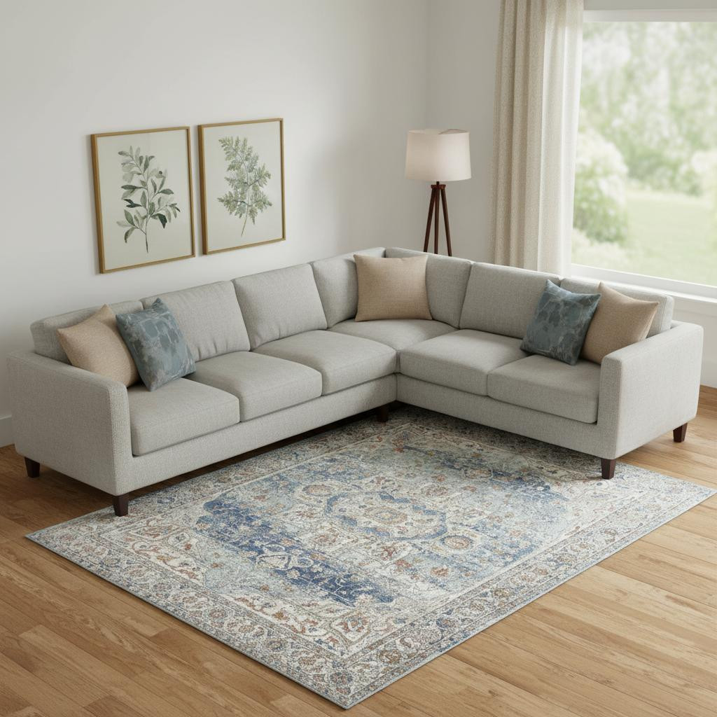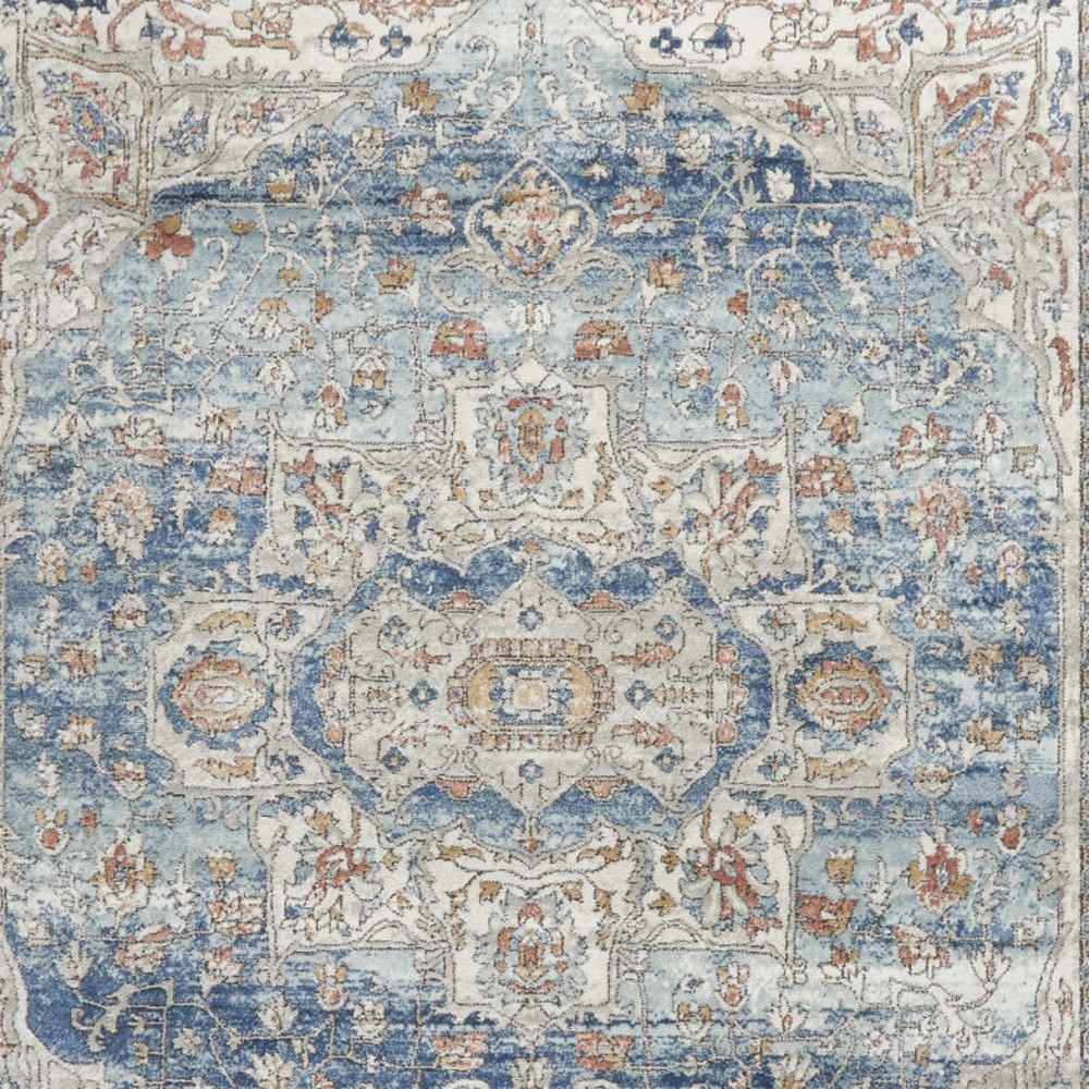 Set an inviting tone in your space with this 8-foot x 10-foot blue and ivory medallion distressed area rug. Built to last, this rug crafted from polypropylene and polyester fibers is known for its durability and long lasting appeal. Rugs are a great way to showcase your style, hide imperfections, warm your home and reduce noise. This larger sized, transitional styled rug is ready to create a focal point or statement piece in your room. 94-inch h x 118-inch w x 0.32-inch d.