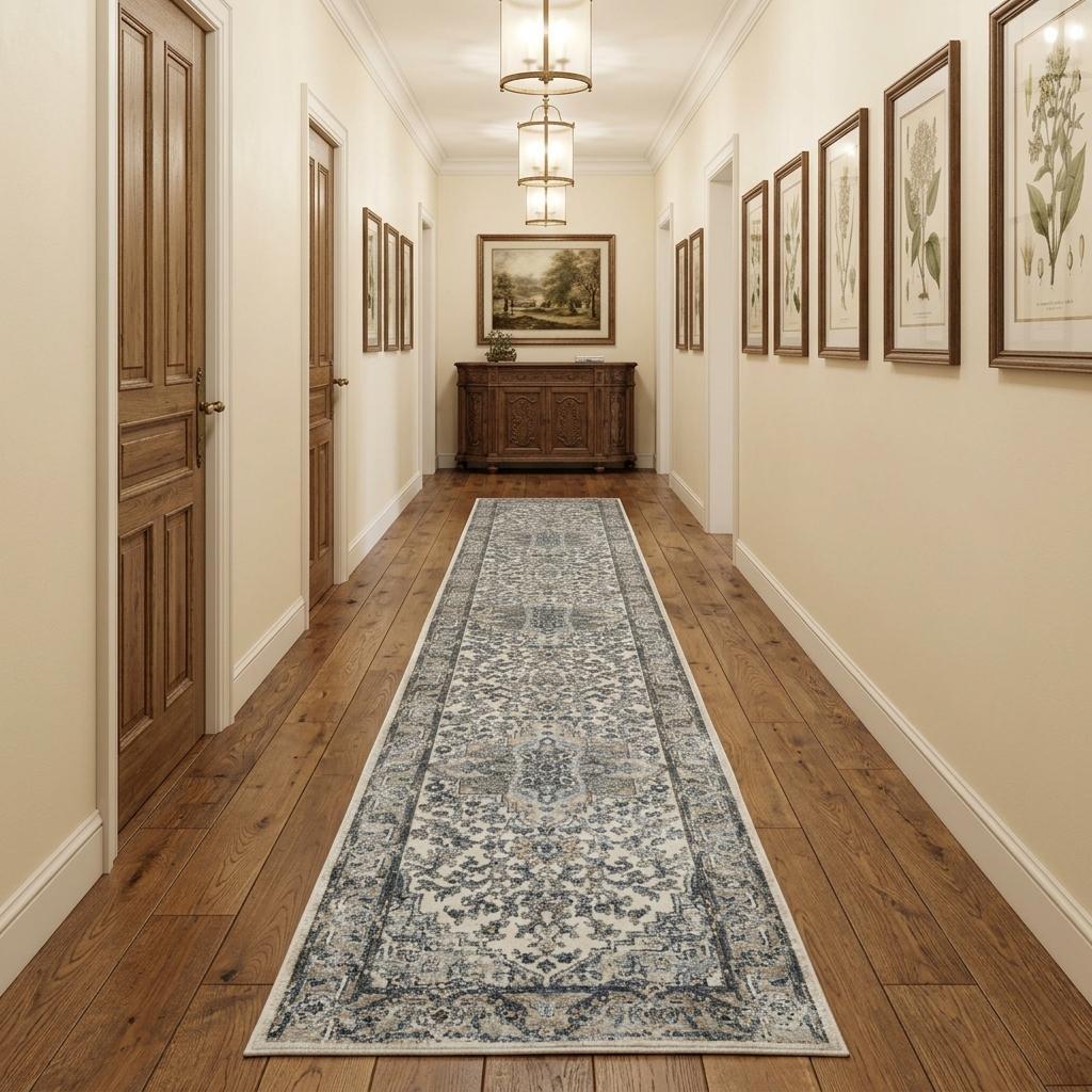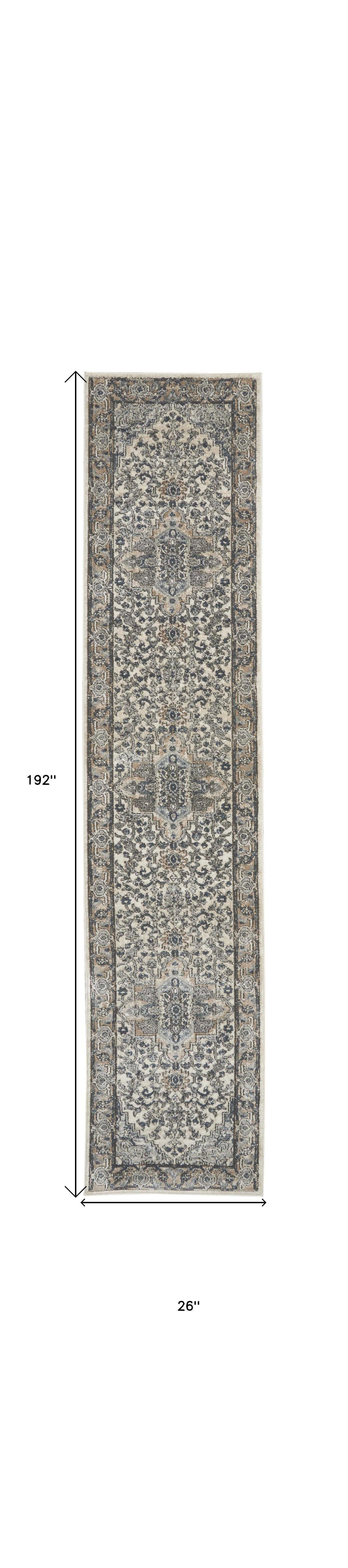 Add great coloration and comfortable texture to your space with this 16-foot gray and ivory medallion distressed runner rug. Built to last, this rug crafted from polypropylene and polyester fibers is known for its durability and long lasting appeal. Rugs are a great way to showcase your style, hide imperfections, warm your home and reduce noise. This rectangular shaped rug features a abstract design that will add a functional and decorative accent to your space. This traditional style runner makes a great accent for the hallway, in front of cabinets, in the laundry room, or any other space you need a narrow and long rug. 26-inch h x 192-inch w x 0.32-inch d.