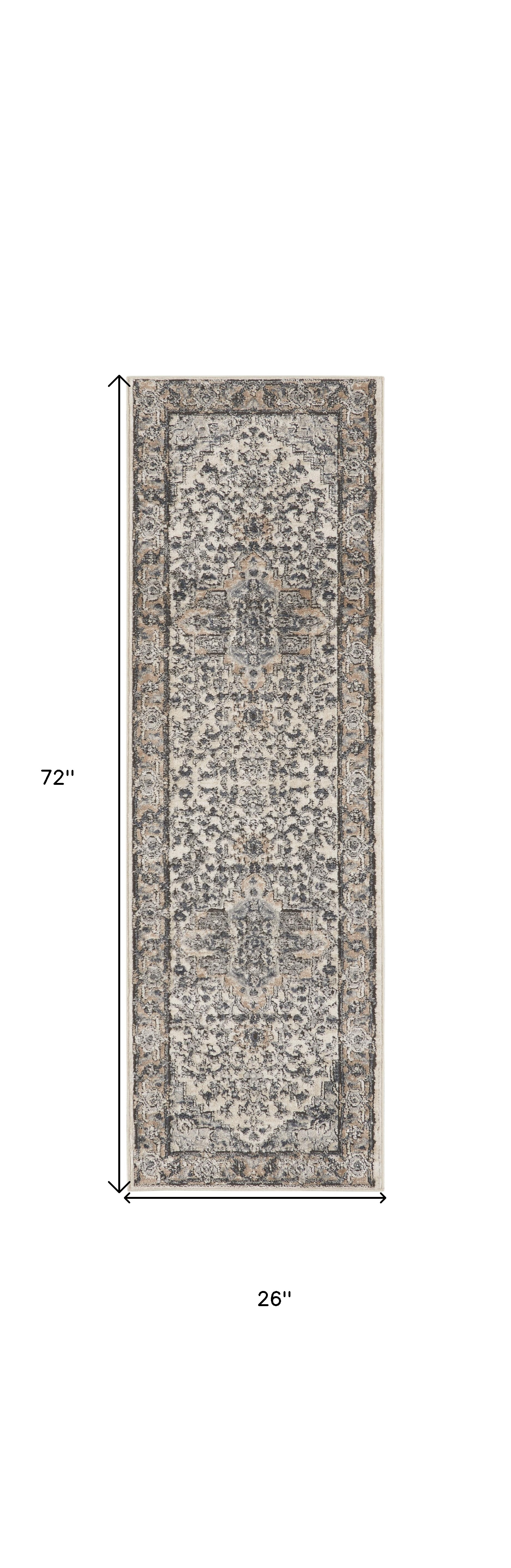 Add great coloration and comfortable texture to your space with this 6-foot gray and ivory medallion distressed runner rug. Built to last, this rug crafted from polypropylene and polyester fibers is known for its durability and long lasting appeal. Rugs are a great way to showcase your style, hide imperfections, warm your home and reduce noise. This rectangular shaped rug features a abstract design that will add a functional and decorative accent to your space. This traditional style runner makes a great accent for the hallway, in front of cabinets, in the laundry room, or any other space you need a narrow and long rug. 26-inch h x 72-inch w x 0.32-inch d.