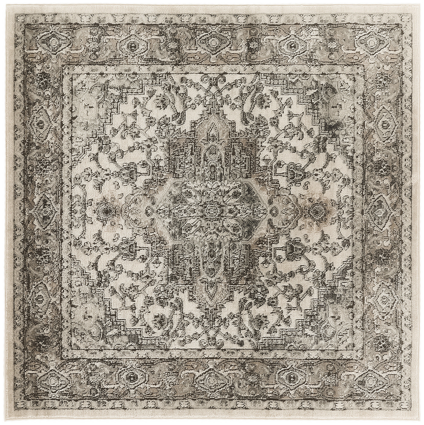 Add great coloration and comfortable texture to your space with this 4-foot gray and ivory square medallion power loom distressed area rug. This geometric square shaped rug features a medallion pattern in gray and ivory that combines a good looking print with a unique and updated shape. The mix of shape, color, and design gives this rug refreshing visual interest. Area rugs help to give warmth and sense of home to your space. 48-inch H x 48-inch W x 0.32-inch D