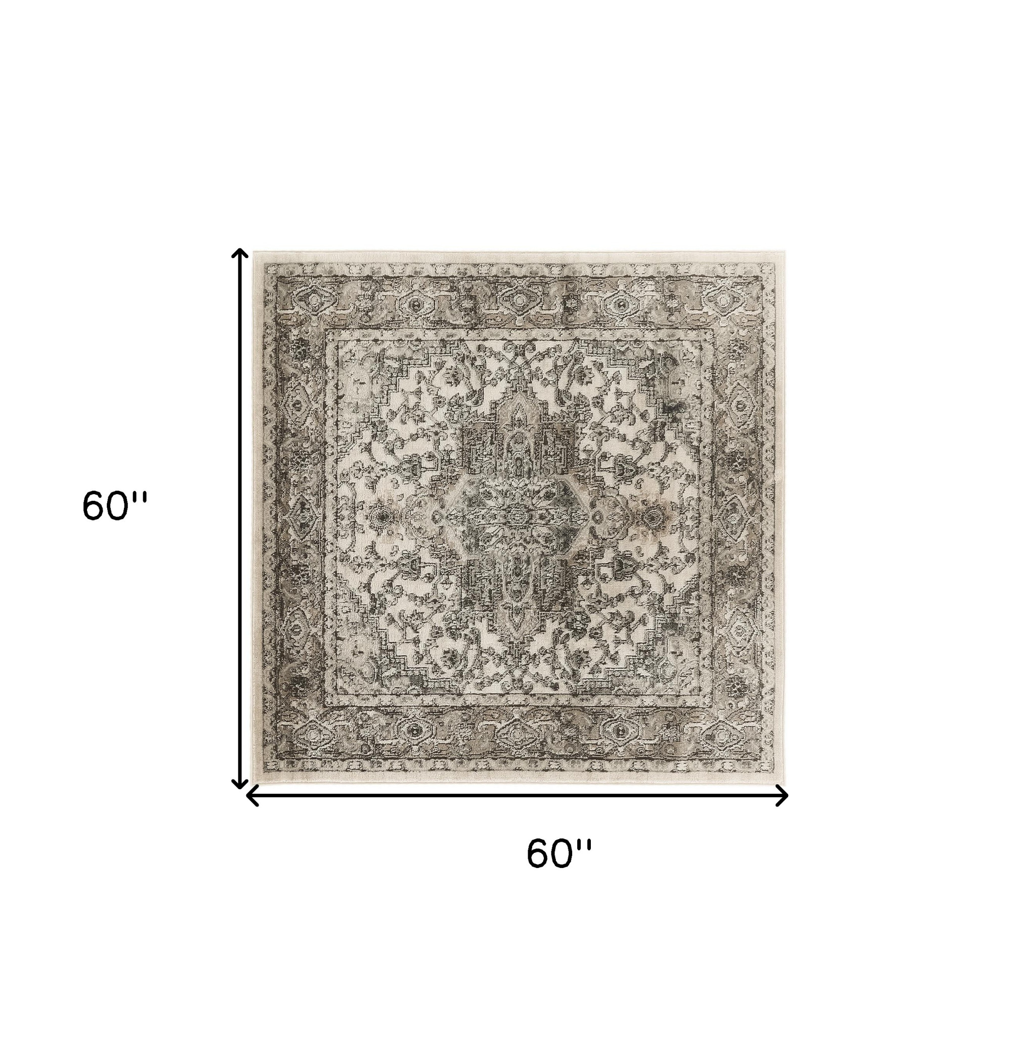 This 5-foot gray and ivory square medallion power loom distressed area rug, is a great way to add warmth to a room. This geometric square shaped rug features a medallion pattern in gray and ivory that combines a good looking print with a unique and updated shape. The mix of shape, color, and design gives this rug refreshing visual interest. Place this area rug against a hardwood or tile floor and it will enliven your living space with style and sophistication. 60-inch H x 60-inch W x 0.32-inch D