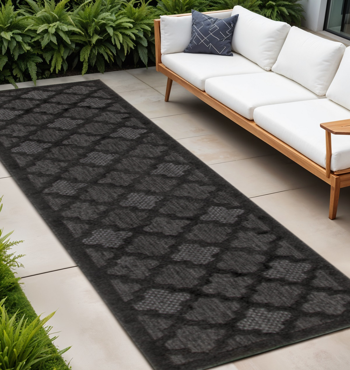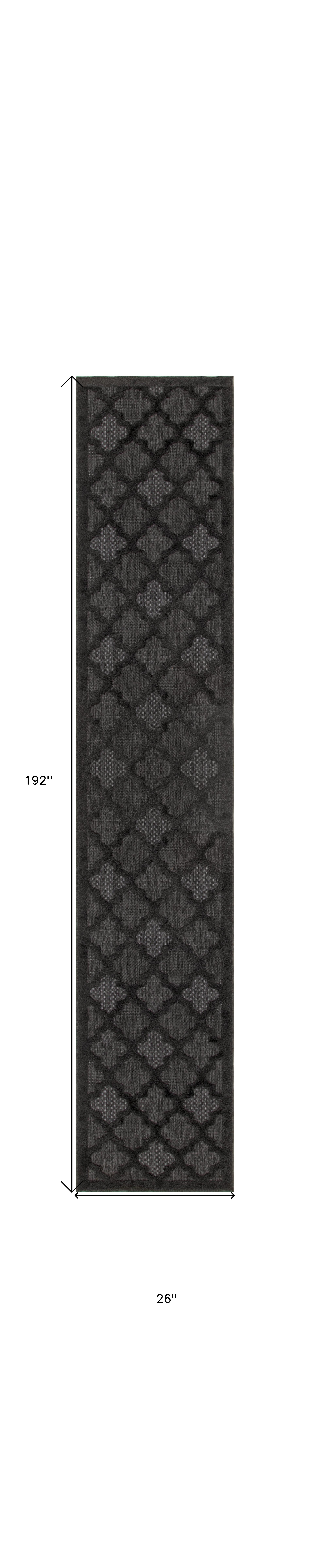 Set an inviting tone in your space with this 16-foot charcoal and black trellis indoor outdoor runner rug. This runner shaped rug features a trellis design that will work well both indoors or out. A classic shape marries with good looking design for your living room, hall, bedroom, porch, patio, or poolside. Versatile in use, durable, and easy to maintain, this rug is an ideal solution to add a decorative and inviting touch to your indoor or outdoor space. 26-inch h x 192-inch w x 0.3-inch d.