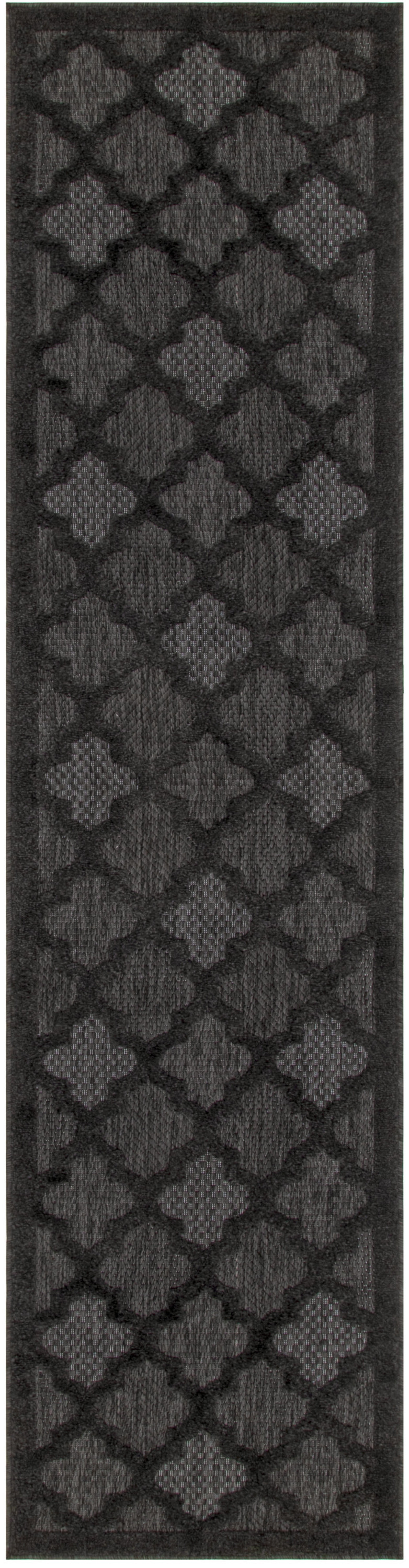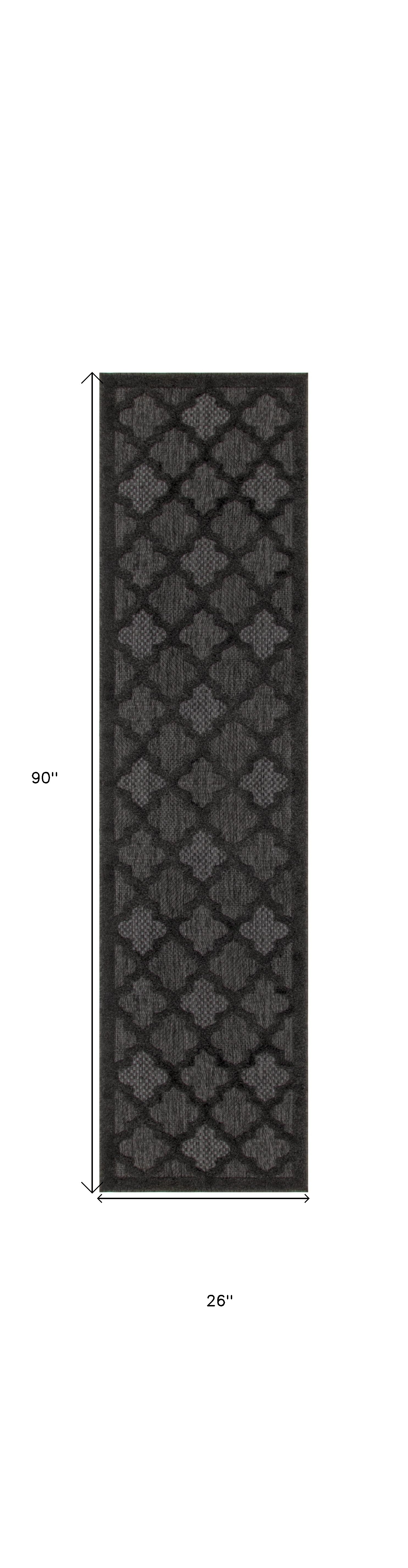 Add great coloration and comfortable texture to your space with this 8-foot charcoal and black trellis indoor outdoor runner rug. This runner shaped rug features a trellis design that will work well both indoors or out. A classic shape marries with good looking design for your living room, hall, bedroom, porch, patio, or poolside. Versatile in use, durable, and easy to maintain, this rug is an ideal solution to add a decorative and inviting touch to your indoor or outdoor space. 26-inch h x 90-inch w x 0.3-inch d.