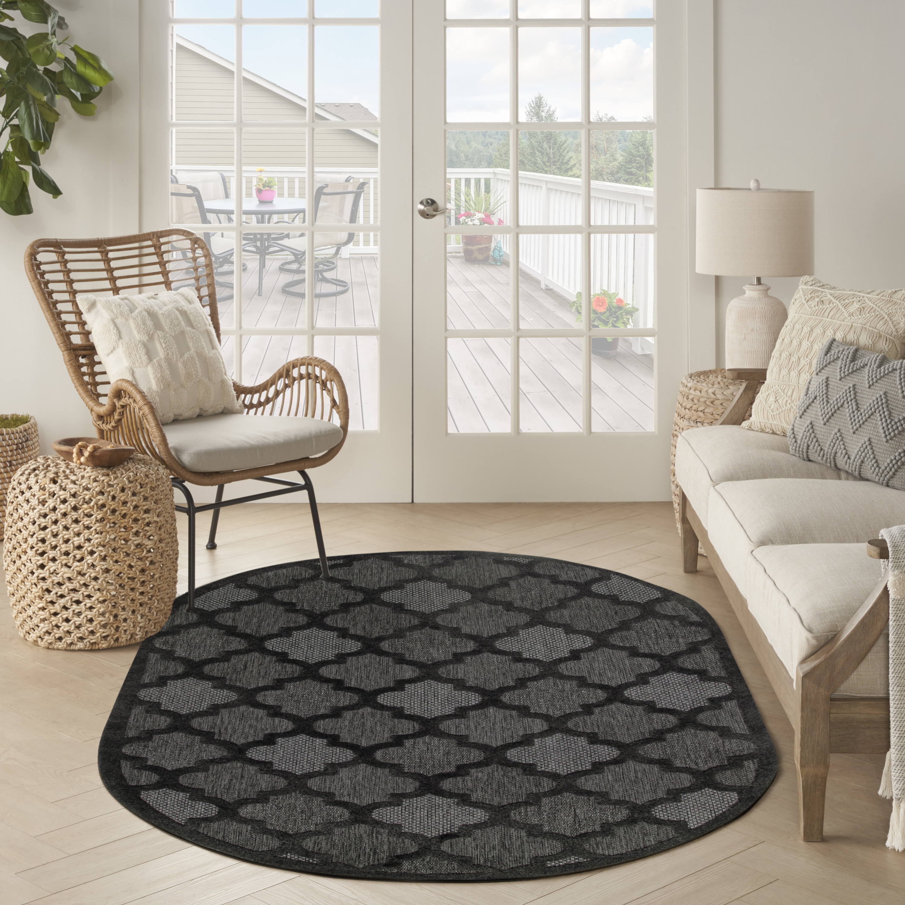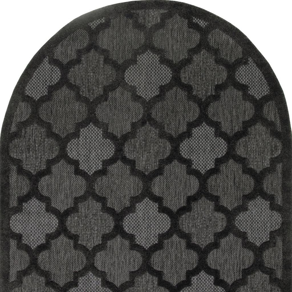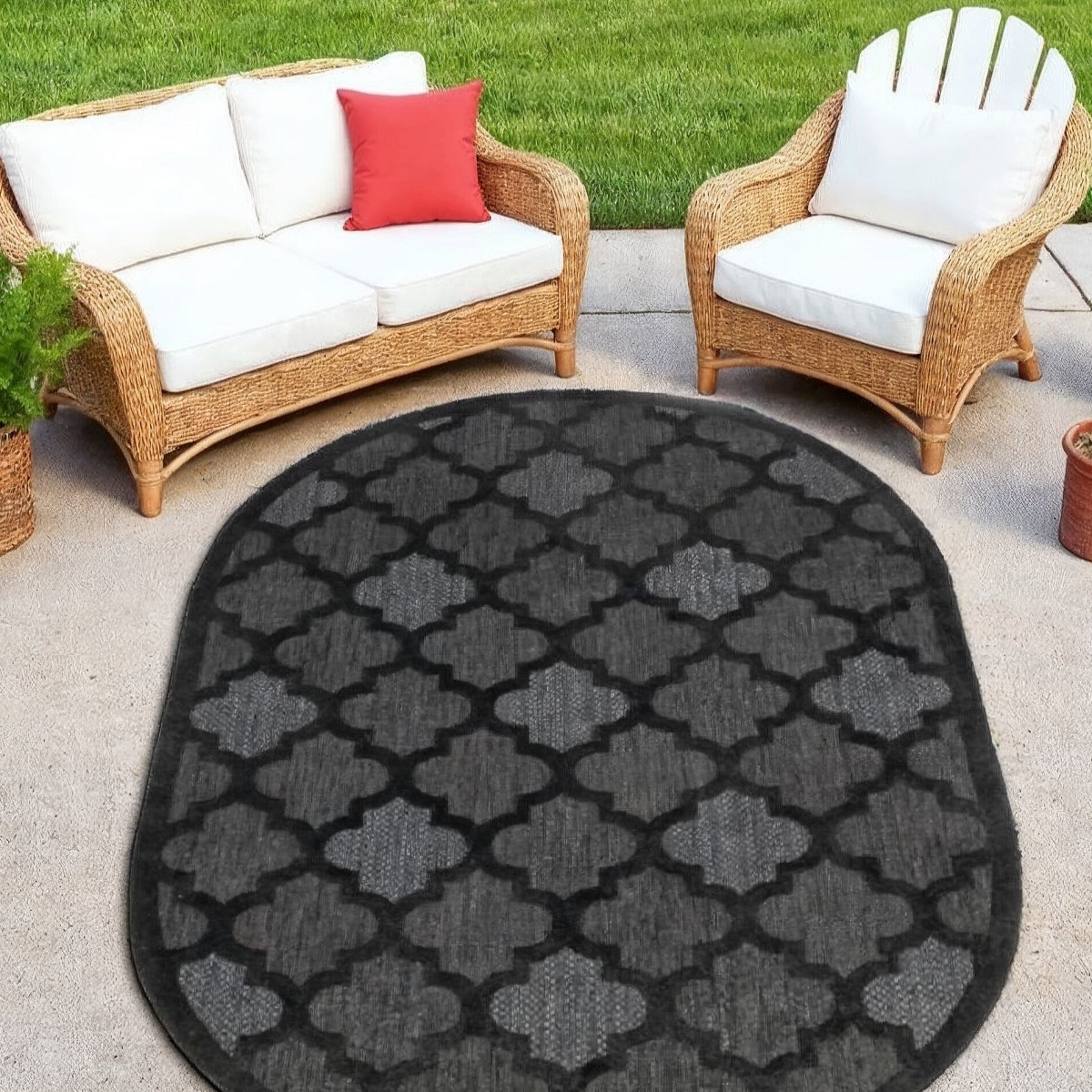 Add some artistry to your room with this 6-foot x 9-foot charcoal and black trellis indoor outdoor area rug. This oval shaped rug features a trellis design that will work well both indoors or out. A classic shape marries with good looking design for your living room, hall, bedroom, porch, patio, or poolside. Versatile in use, durable, and easy to maintain, this rug is an ideal solution to add a decorative and inviting touch to your indoor or outdoor space. 72-inch h x 108-inch w x 0.3-inch d.
