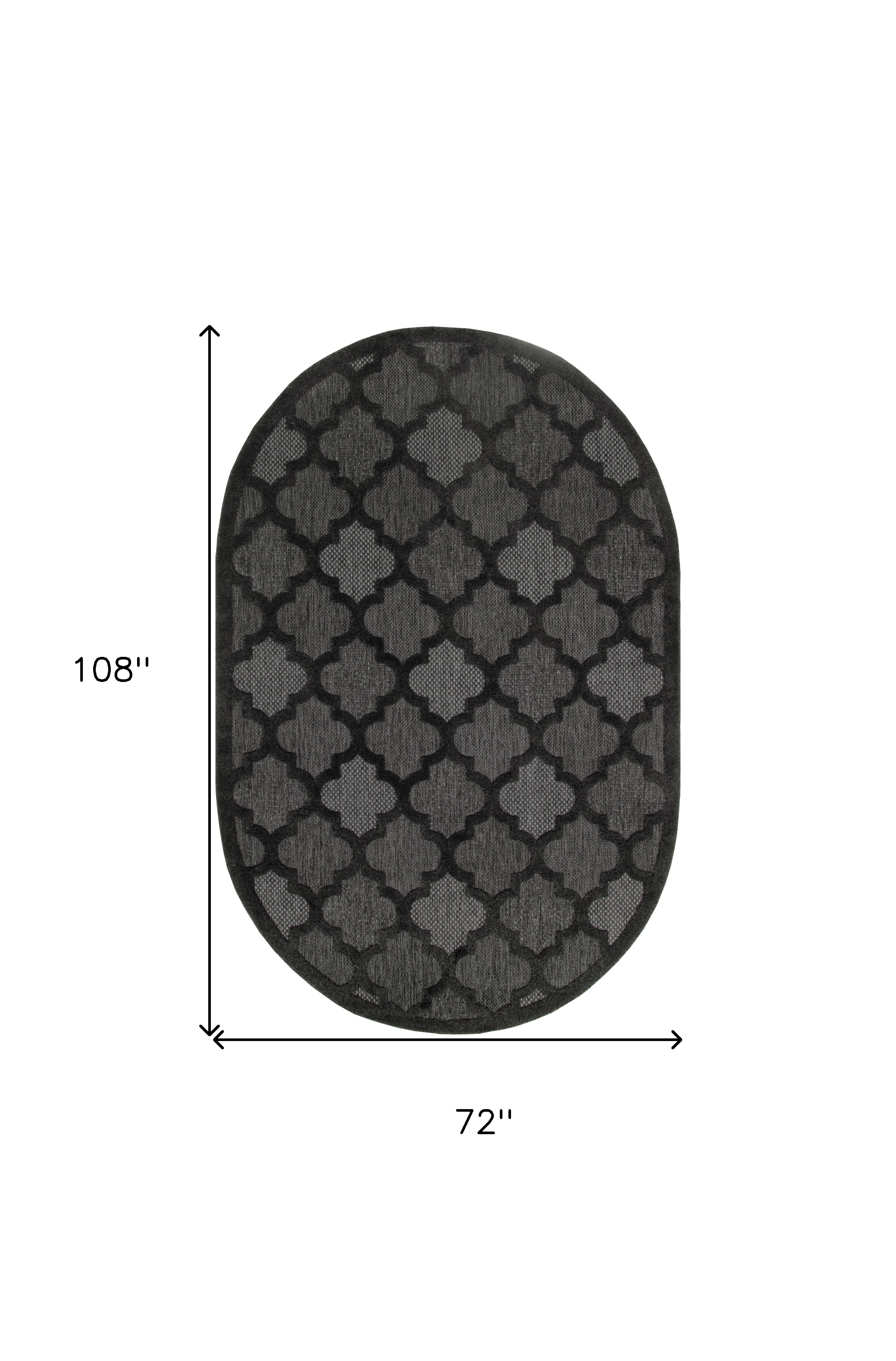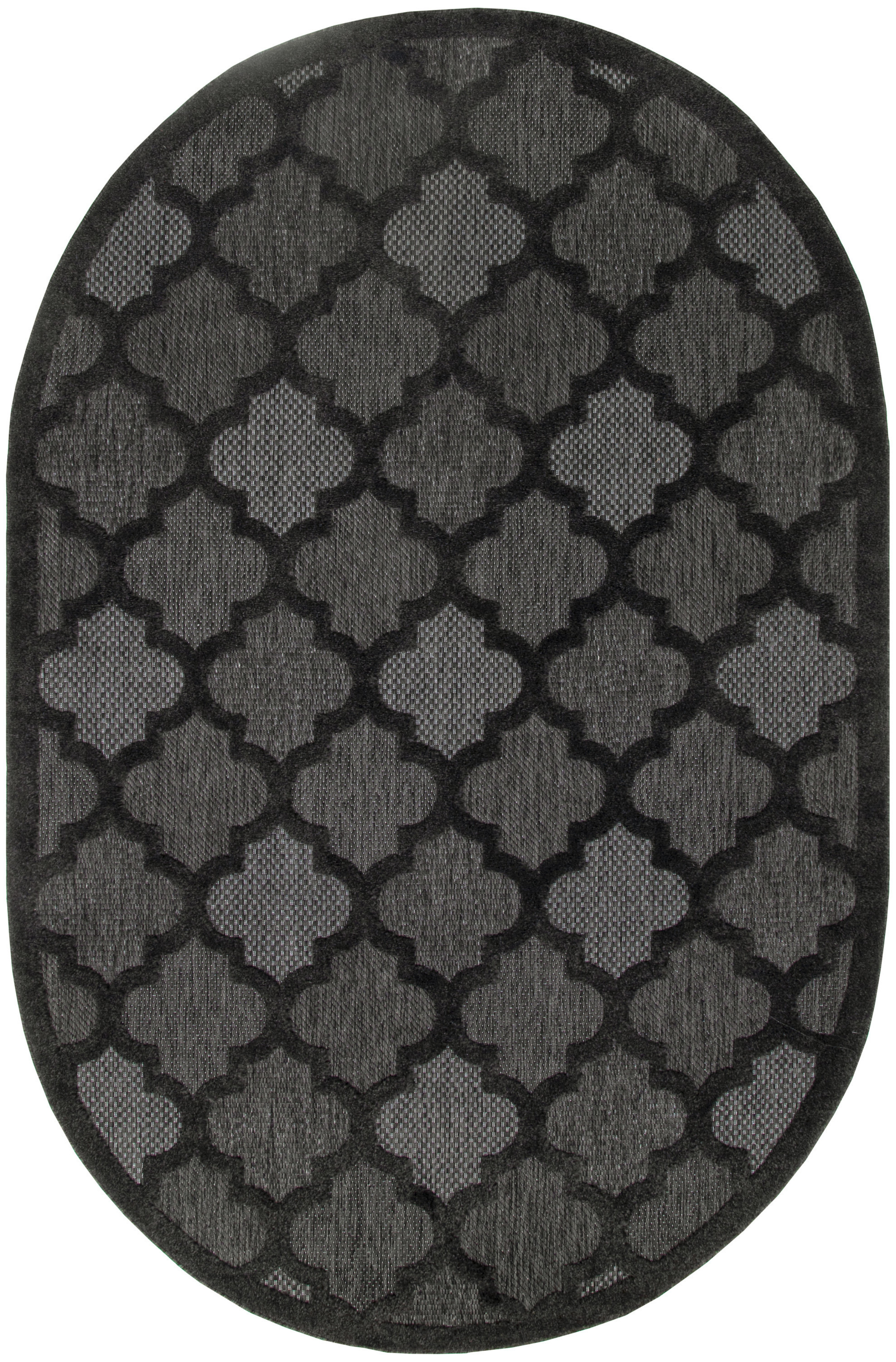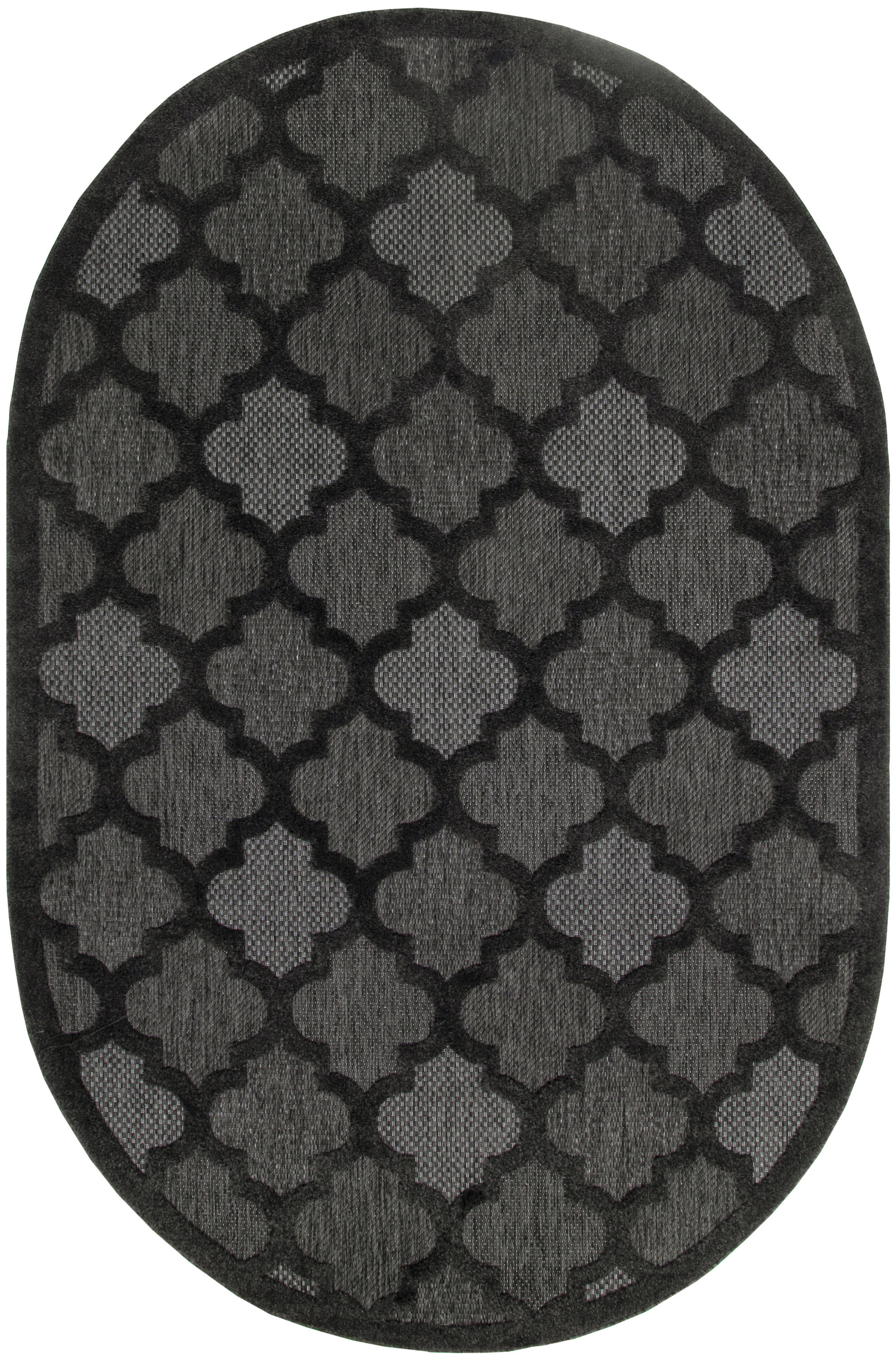 Add some artistry to your room with this 6-foot x 9-foot charcoal and black trellis indoor outdoor area rug. This oval shaped rug features a trellis design that will work well both indoors or out. A classic shape marries with good looking design for your living room, hall, bedroom, porch, patio, or poolside. Versatile in use, durable, and easy to maintain, this rug is an ideal solution to add a decorative and inviting touch to your indoor or outdoor space. 72-inch h x 108-inch w x 0.3-inch d.