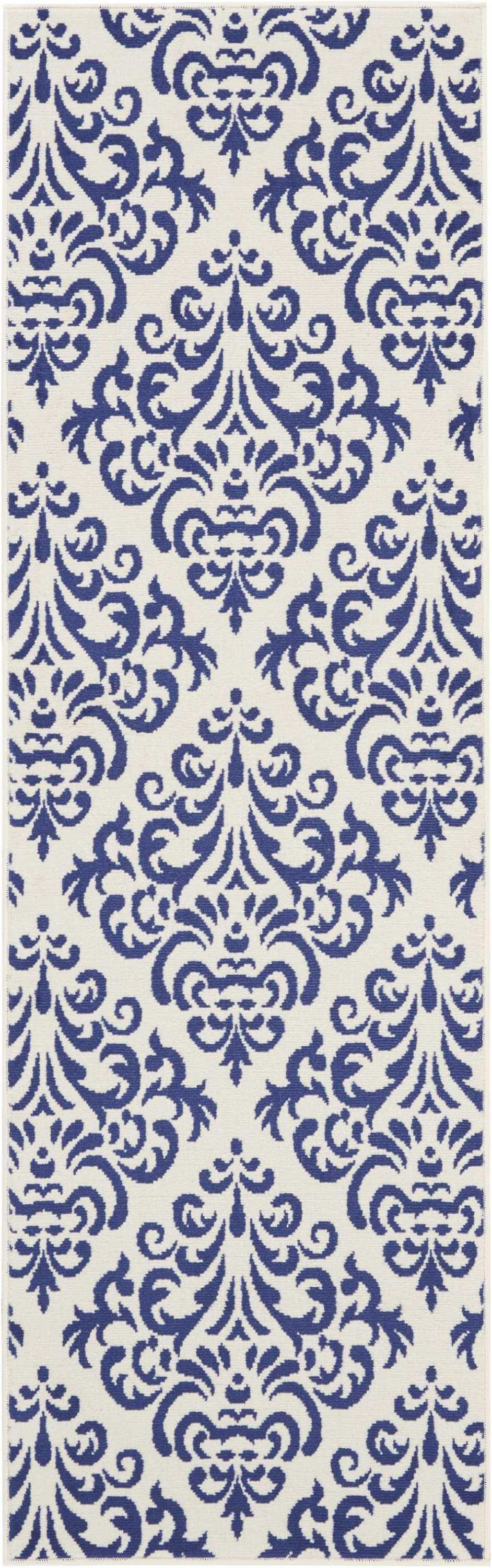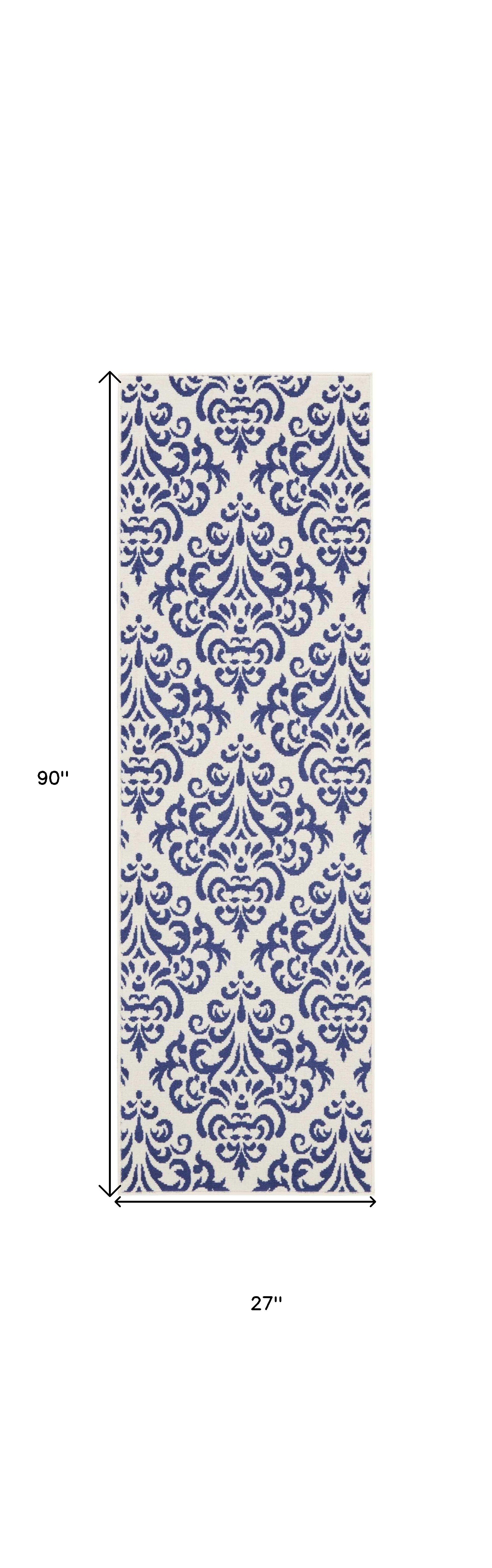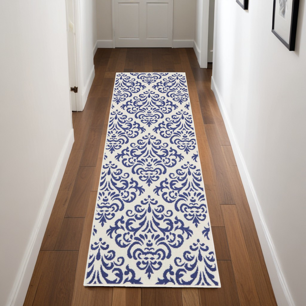 Add great coloration and comfortable texture to your space with this 8-foot blue and white damask runner rug. Built to last, this rug crafted from polypropylene fibers is known for its durability and long lasting appeal. Rugs are a great way to showcase your style, hide imperfections, warm your home and reduce noise. This rectangular shaped rug features a abstract design that will add a functional and decorative accent to your space. This transitional style runner makes a great accent for the hallway, in front of cabinets, in the laundry room, or any other space you need a narrow and long rug. 27-inch h x 90-inch w x 0.5-inch d.