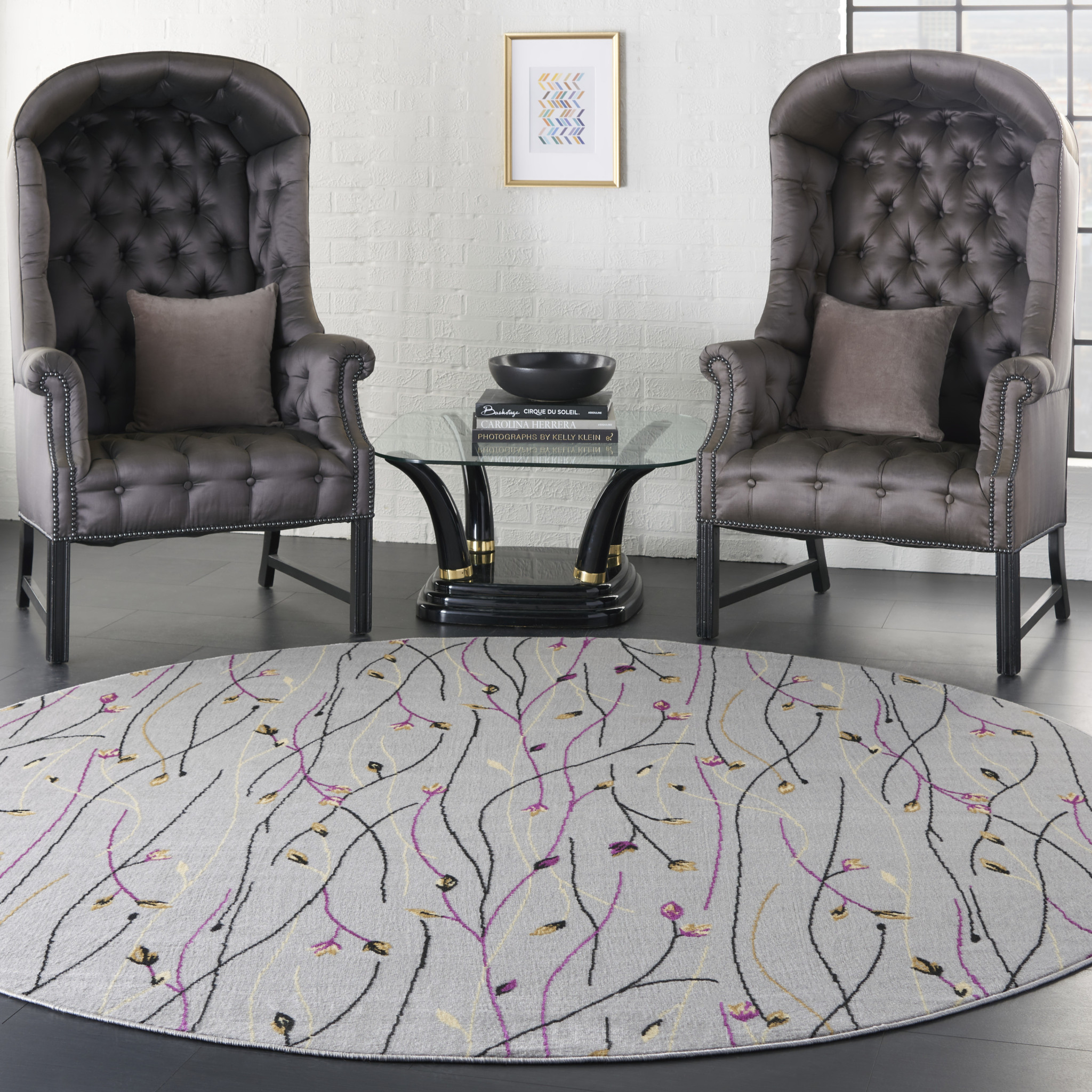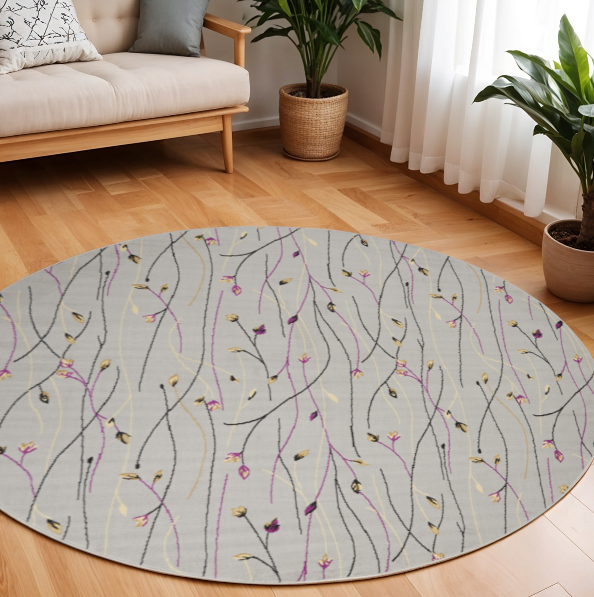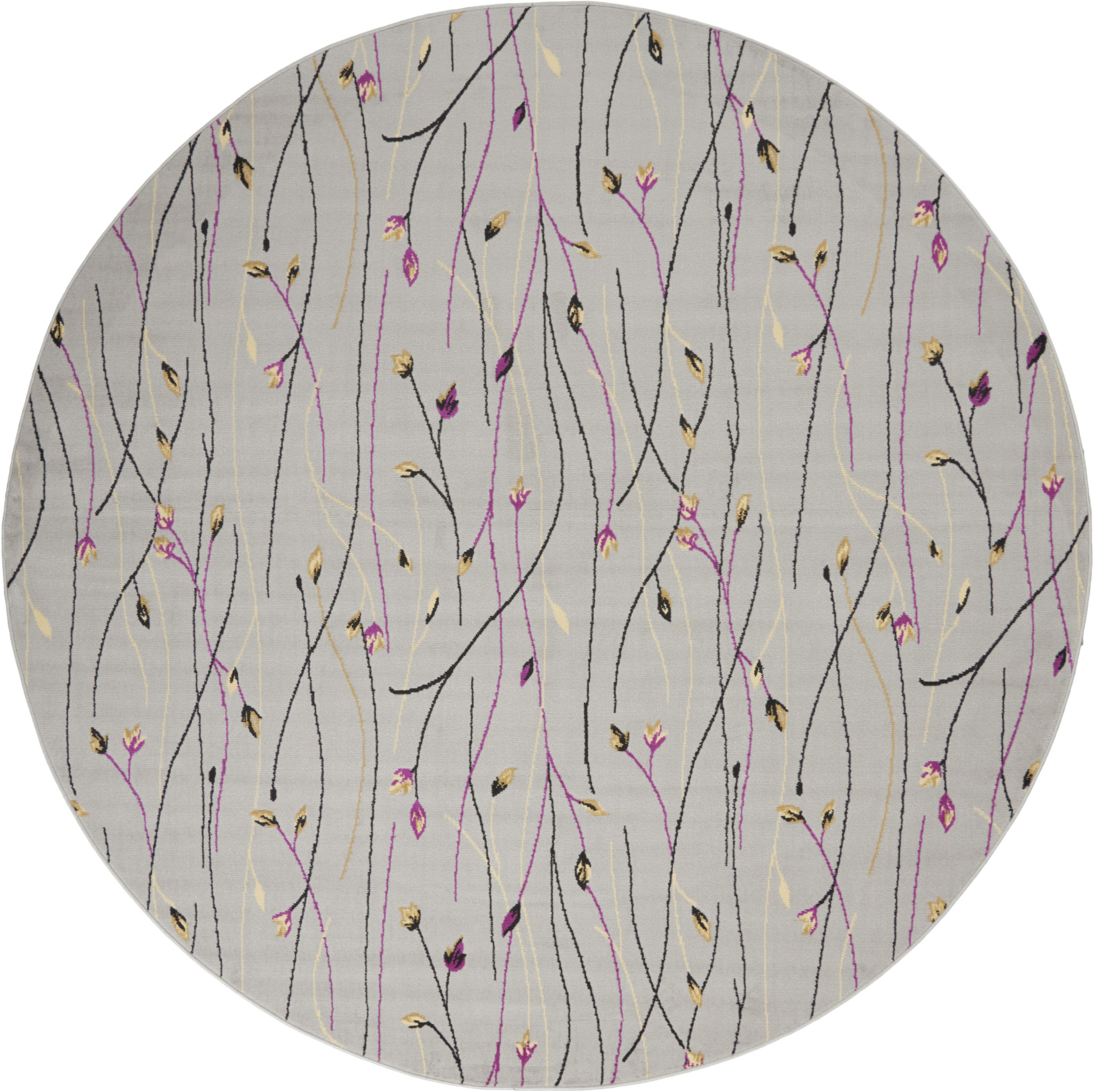 Set an inviting tone in your space with this 8-foot gray and pink round floral power loom area rug. This geometric round shaped rug features a floral pattern in gray and pink that combines a good looking print with a unique and updated shape. The mix of shape, color, and design gives this rug refreshing visual interest. Area rugs help to give warmth and sense of home to your space. 96-inch H x 96-inch W x 0.5-inch D
