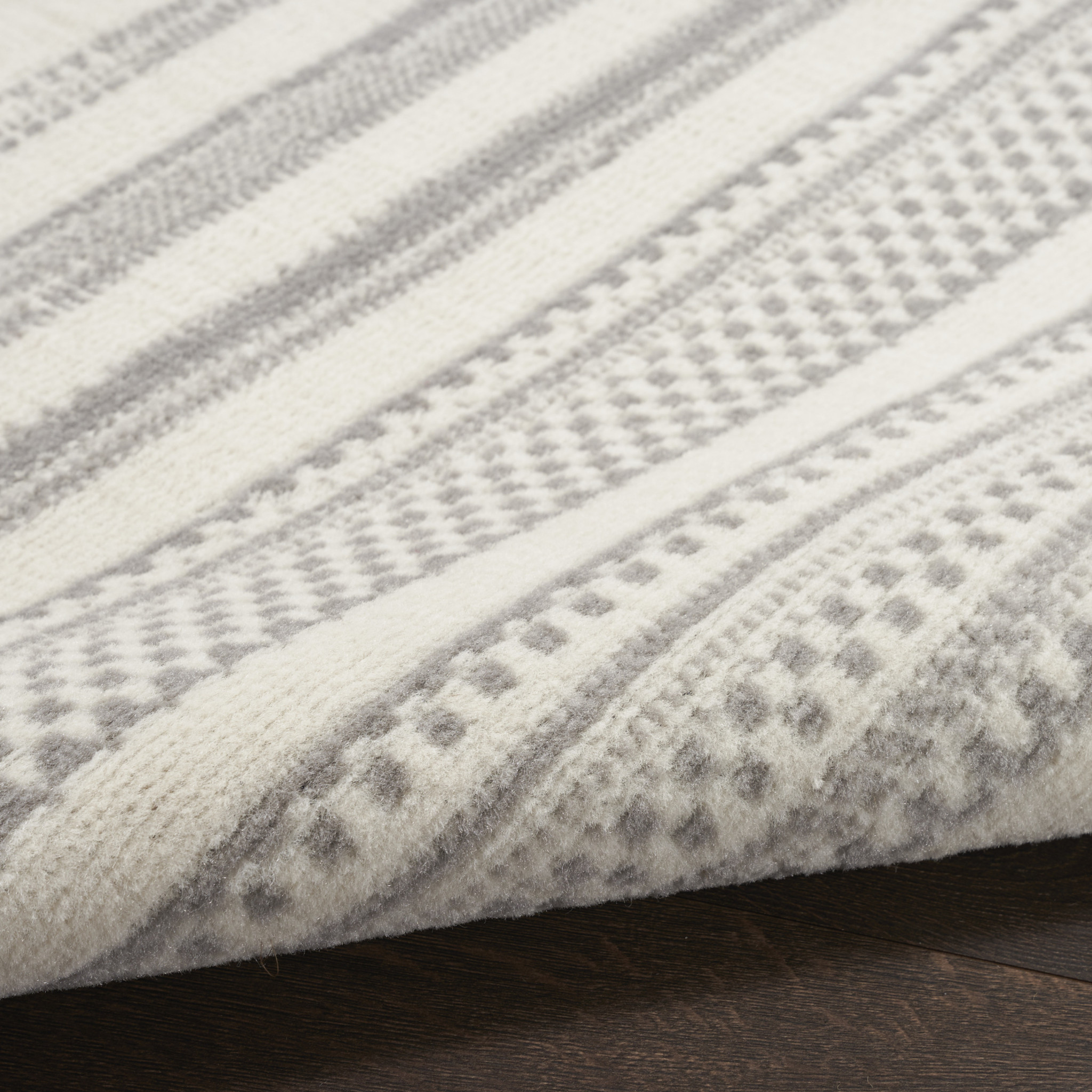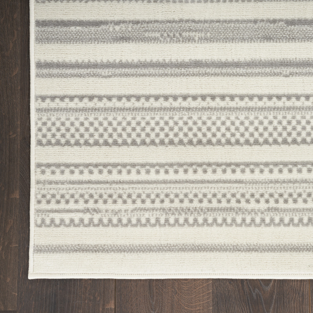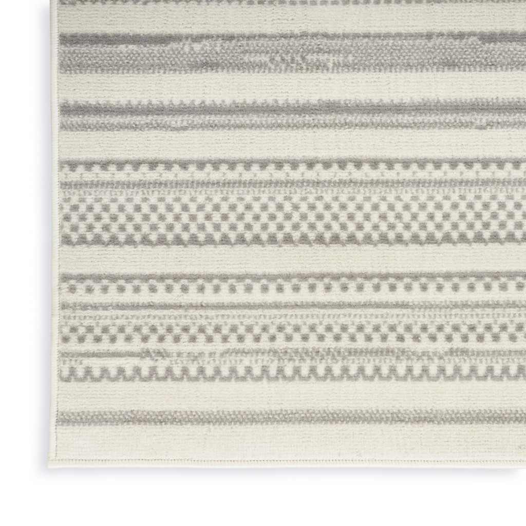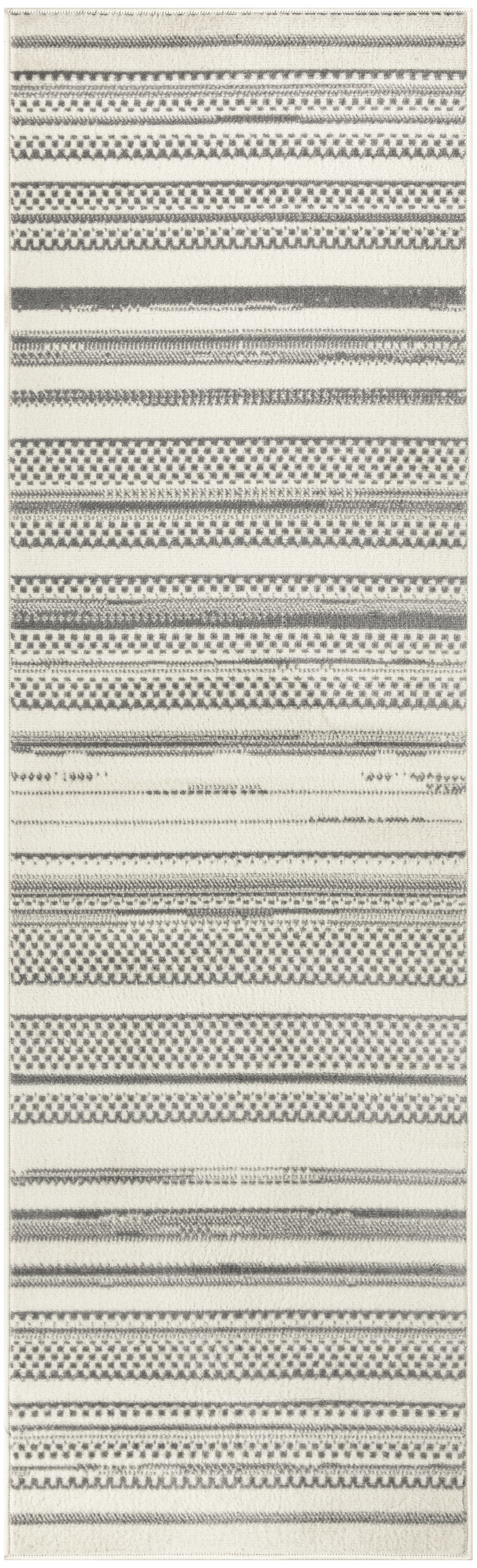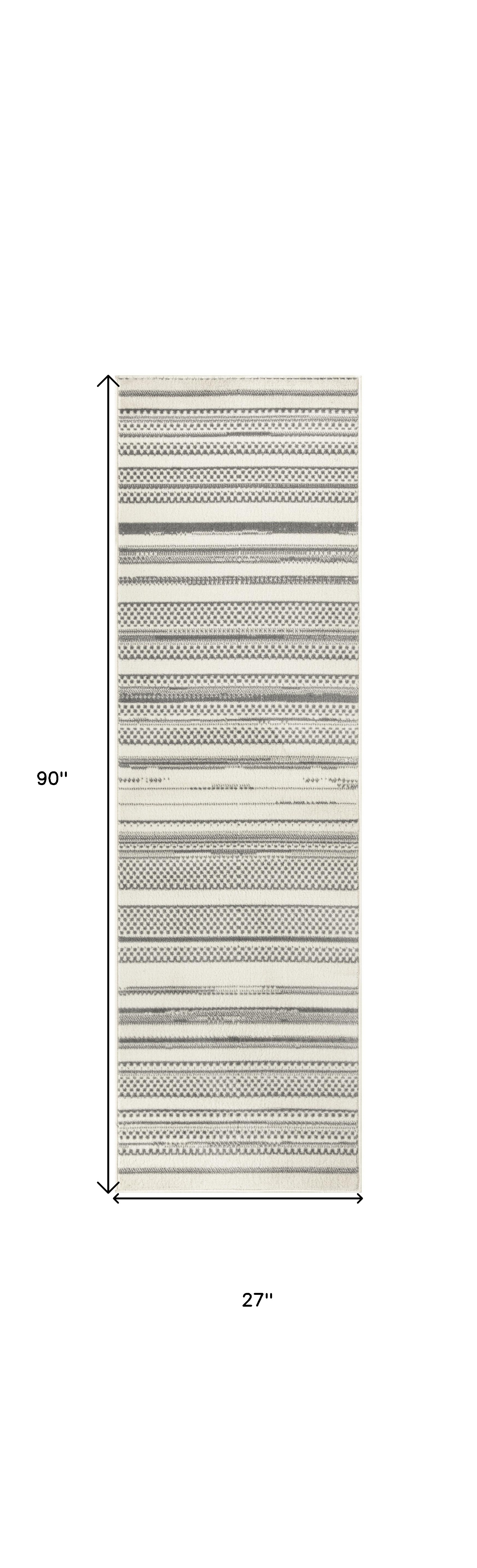 This 8-foot gray and ivory striped distressed runner rug, is a great way to add warmth to a room. Built to last, this rug crafted from polypropylene fibers is known for its durability and long lasting appeal. Rugs are a great way to showcase your style, hide imperfections, warm your home and reduce noise. This rectangular shaped rug features a abstract design that will add a functional and decorative accent to your space. This modern style runner makes a great accent for the hallway, in front of cabinets, in the laundry room, or any other space you need a narrow and long rug. 27-inch h x 90-inch w x 0.5-inch d.