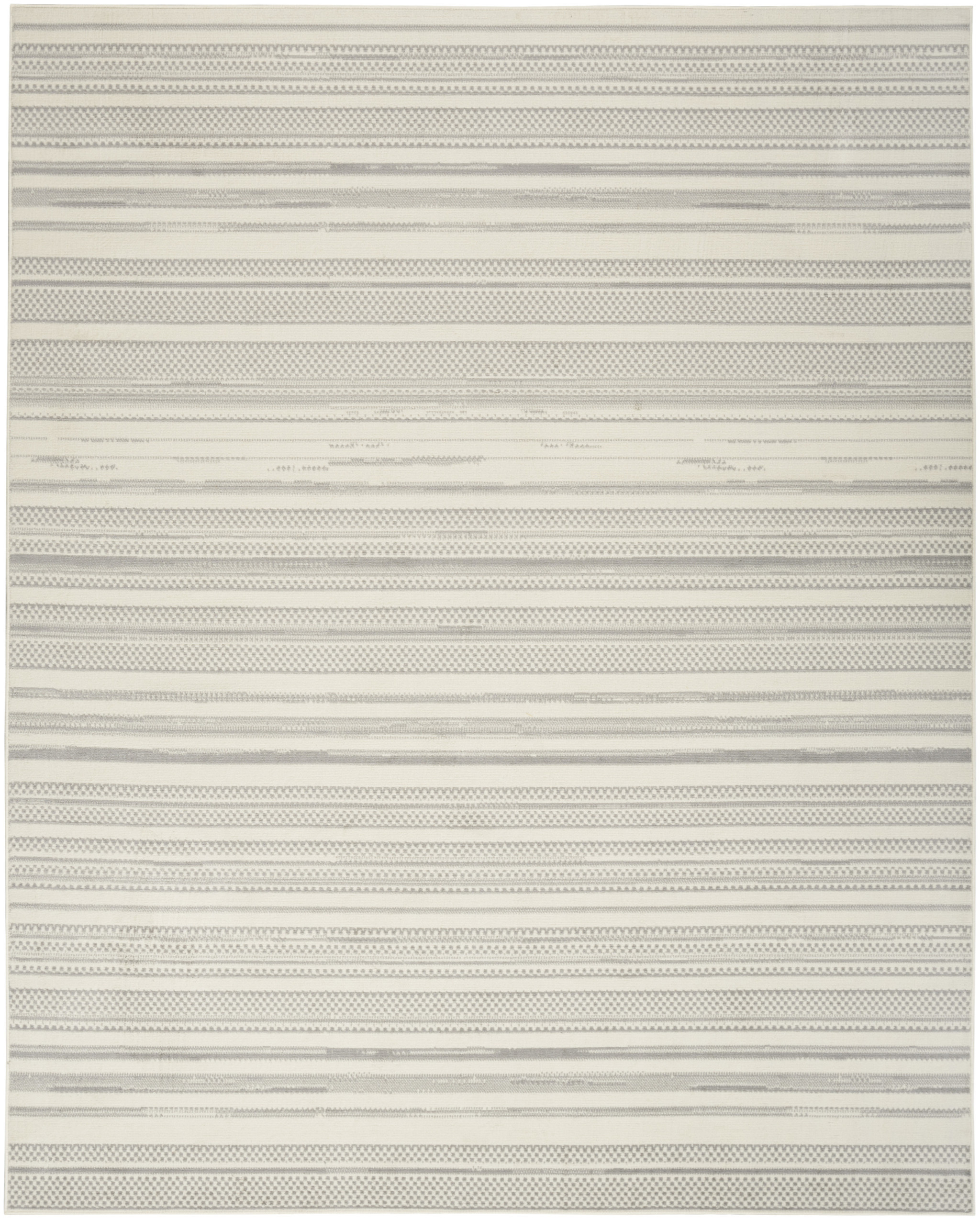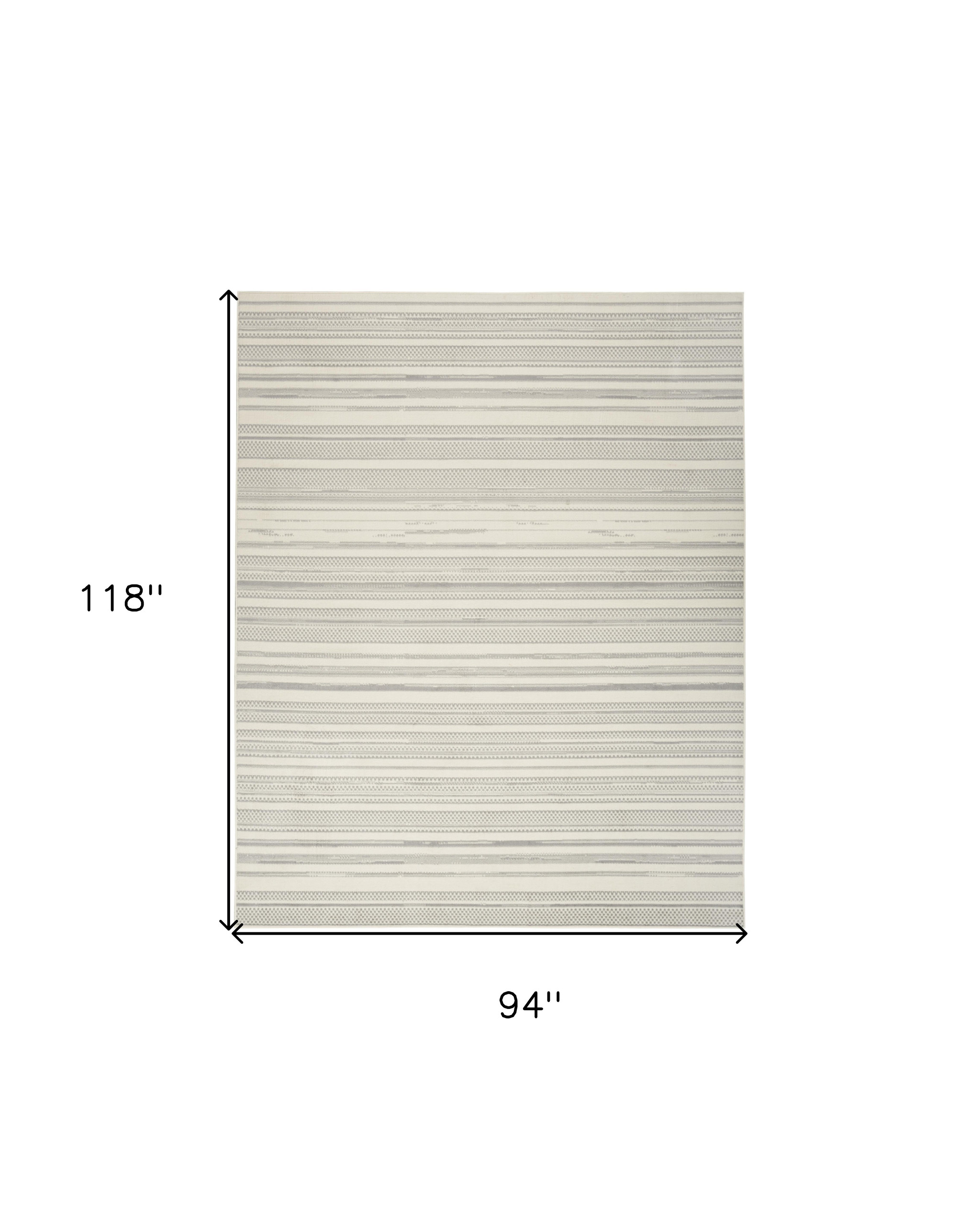Add some artistry to your room with this 8-foot x 10-foot gray and ivory striped power loom area rug. This rectangle shaped rug features a striped design in gray and ivory to give it visual interest. A classic shape marries with good looking design for your space place this area rug against a hardwood or tile floor and it will enliven your living space with style and sophistication. 94-inch H x 118-inch W x 0.5-inch D