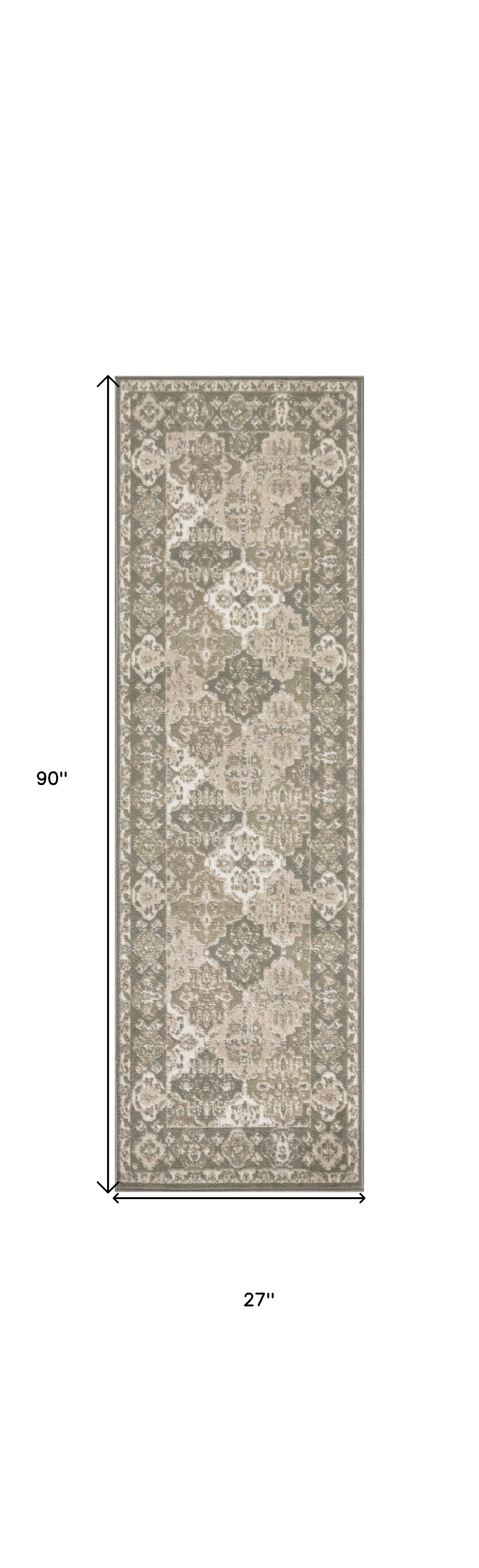 This 8-foot green and ivory medallion distressed runner rug, is a great way to add warmth to a room. Built to last, this rug crafted from polypropylene fibers is known for its durability and long lasting appeal. Rugs are a great way to showcase your style, hide imperfections, warm your home and reduce noise. This rectangular shaped rug features a abstract design that will add a functional and decorative accent to your space. This traditional style runner makes a great accent for the hallway, in front of cabinets, in the laundry room, or any other space you need a narrow and long rug. 27-inch h x 90-inch w x 0.5-inch d.