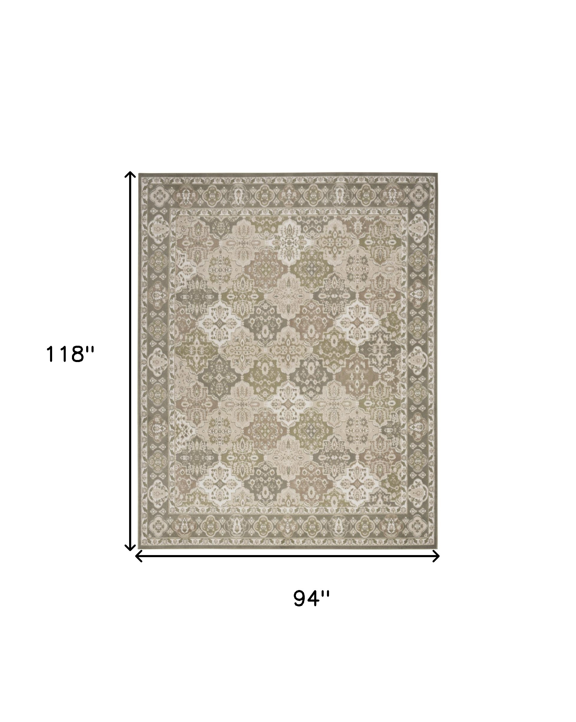 This 8-foot x 10-foot green and ivory medallion power loom distressed area rug, is a great way to add warmth to a room. This rectangle shaped rug features a medallion design in green and ivory to give it visual interest. A classic shape marries with good looking design for your space area rugs help to give warmth and sense of home to your space. 94-inch H x 118-inch W x 0.5-inch D