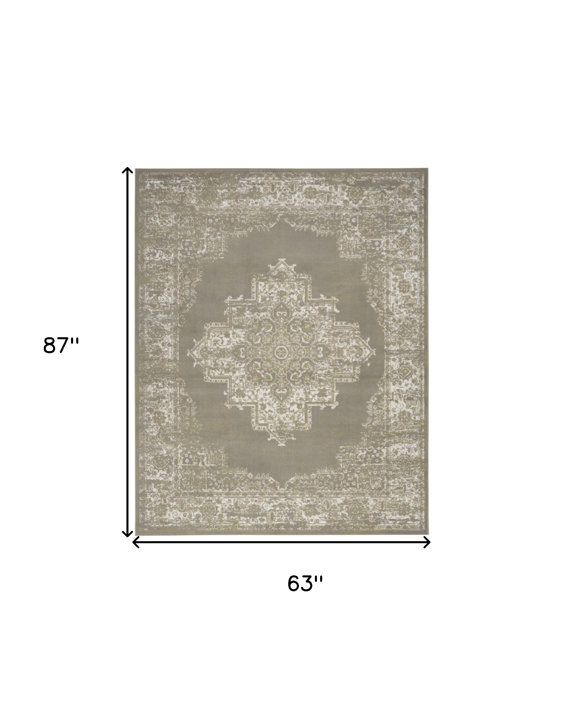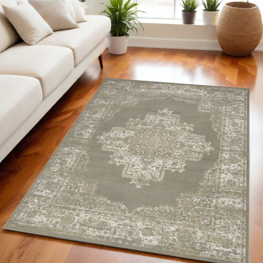 Add some artistry to your room with this 5-foot x 7-foot green and ivory medallion power loom distressed area rug. This rectangle shaped rug features a medallion design in green and ivory to give it visual interest. A classic shape marries with good looking design for your space place this area rug against a hardwood or tile floor and it will enliven your living space with style and sophistication. 63-inch H x 87-inch W x 0.5-inch D