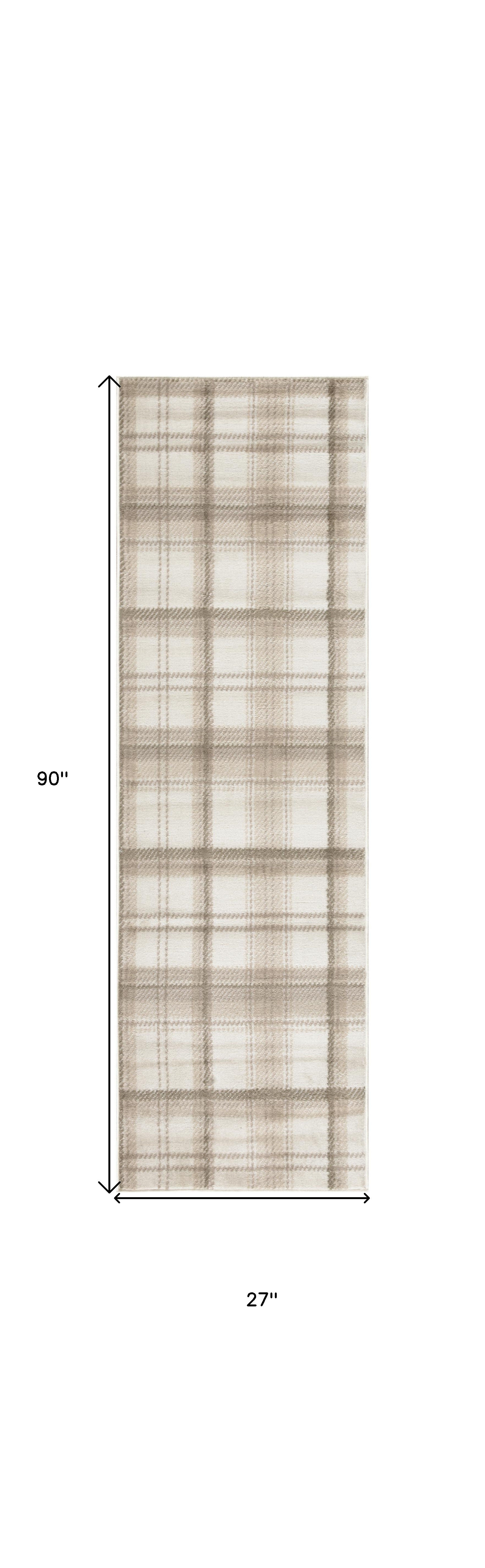 Set an inviting tone in your space with this 8-foot beige and ivory plaid runner rug. Built to last, this rug crafted from polypropylene fibers is known for its durability and long lasting appeal. Rugs are a great way to showcase your style, hide imperfections, warm your home and reduce noise. This rectangular shaped rug features a abstract design that will add a functional and decorative accent to your space. This contemporary style runner makes a great accent for the hallway, in front of cabinets, in the laundry room, or any other space you need a narrow and long rug. 27-inch h x 90-inch w x 0.5-inch d.