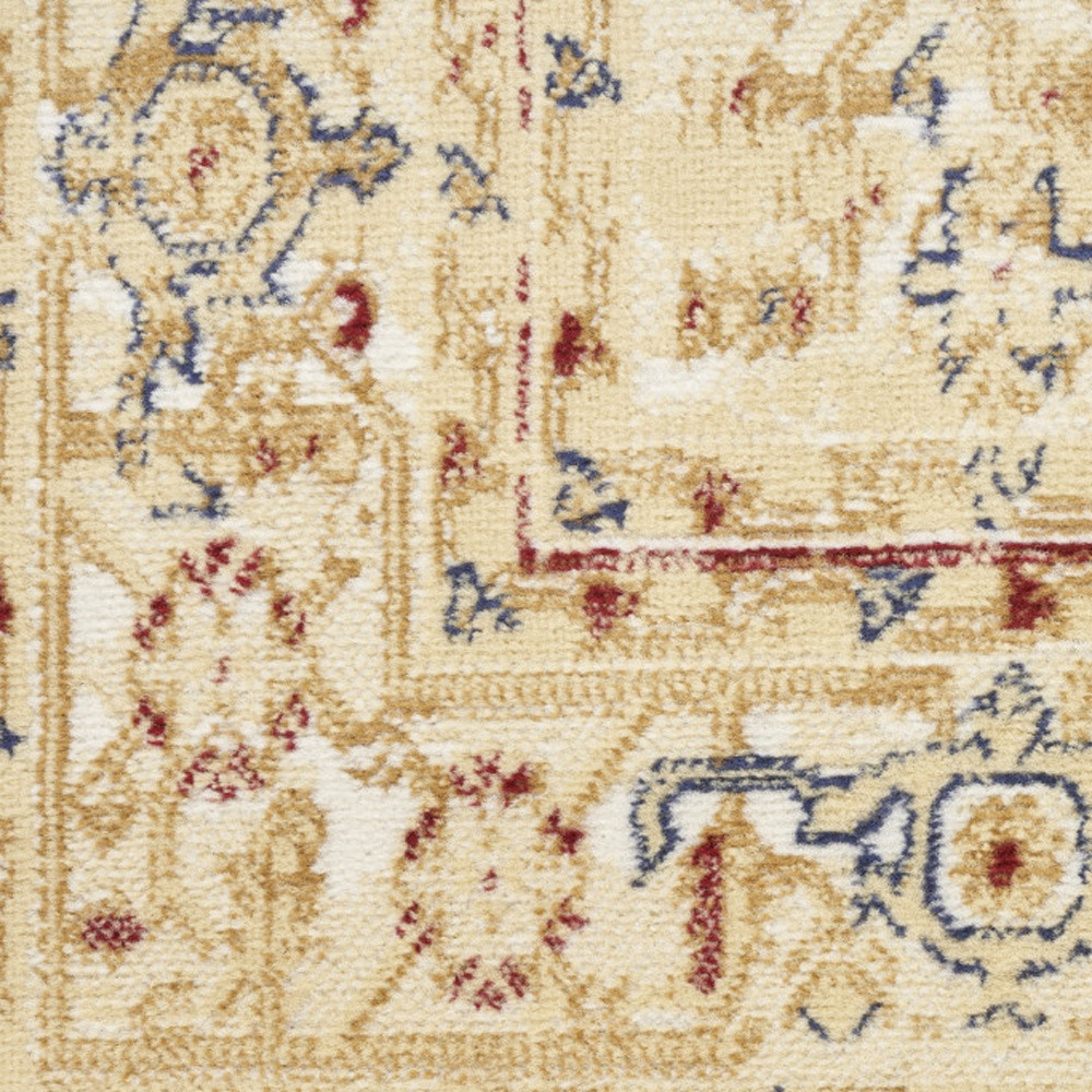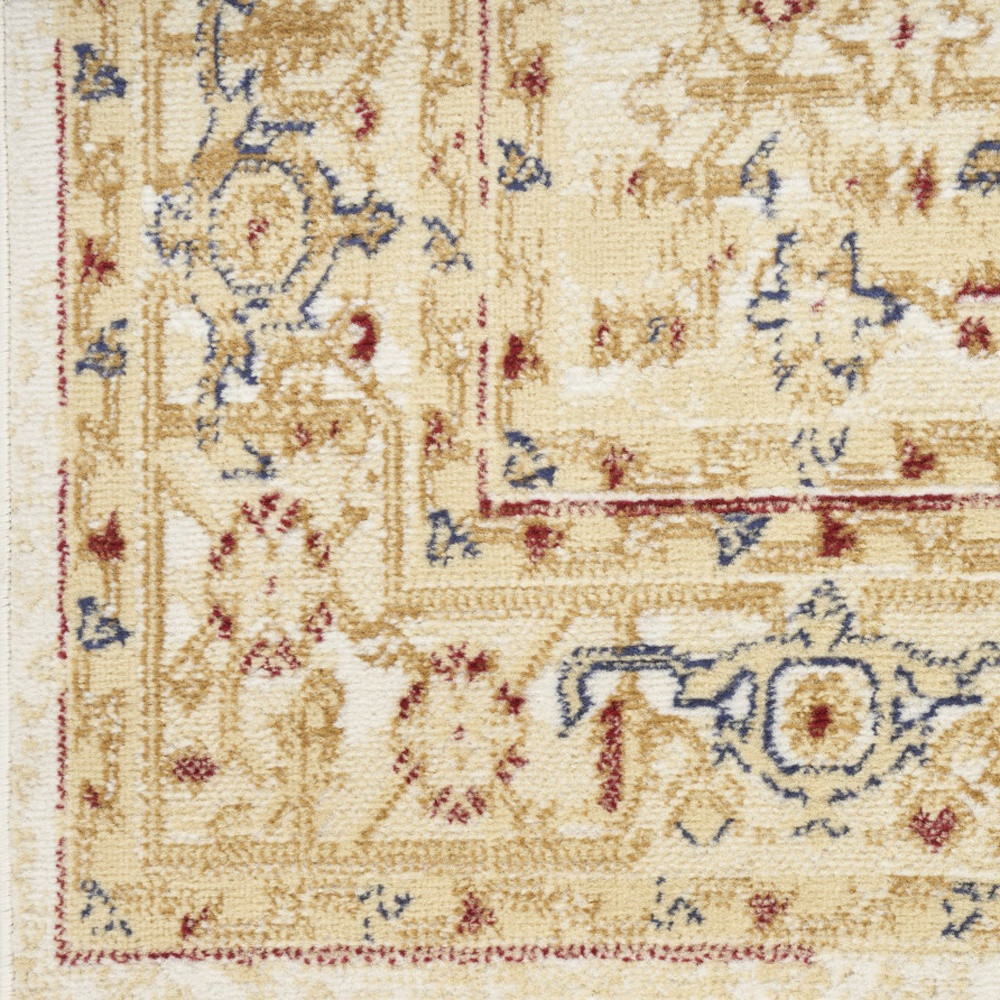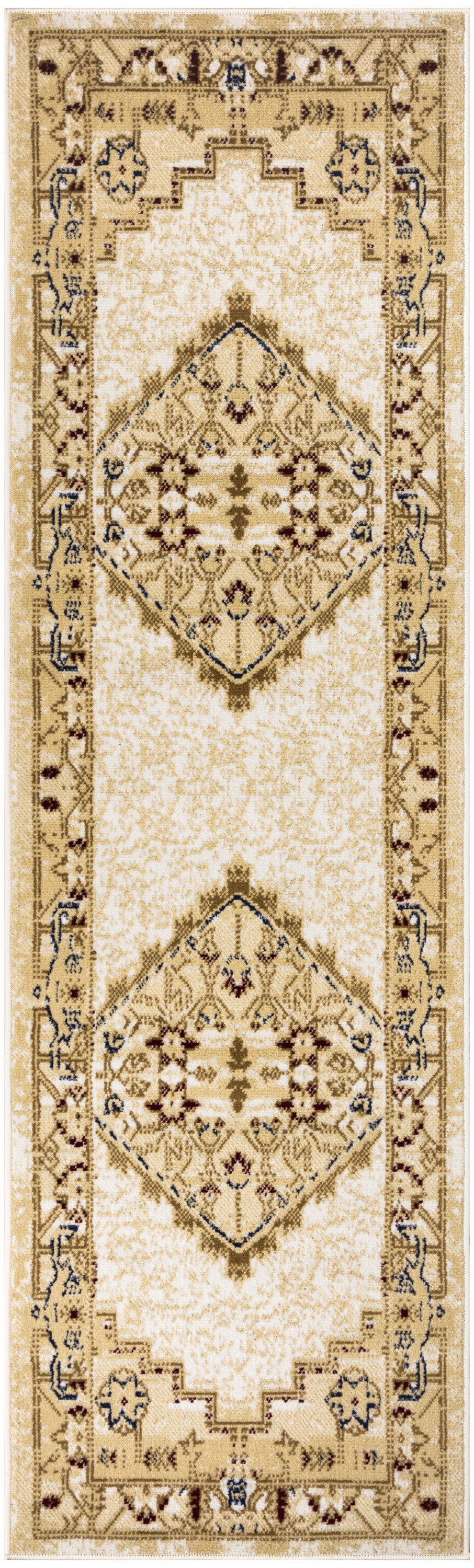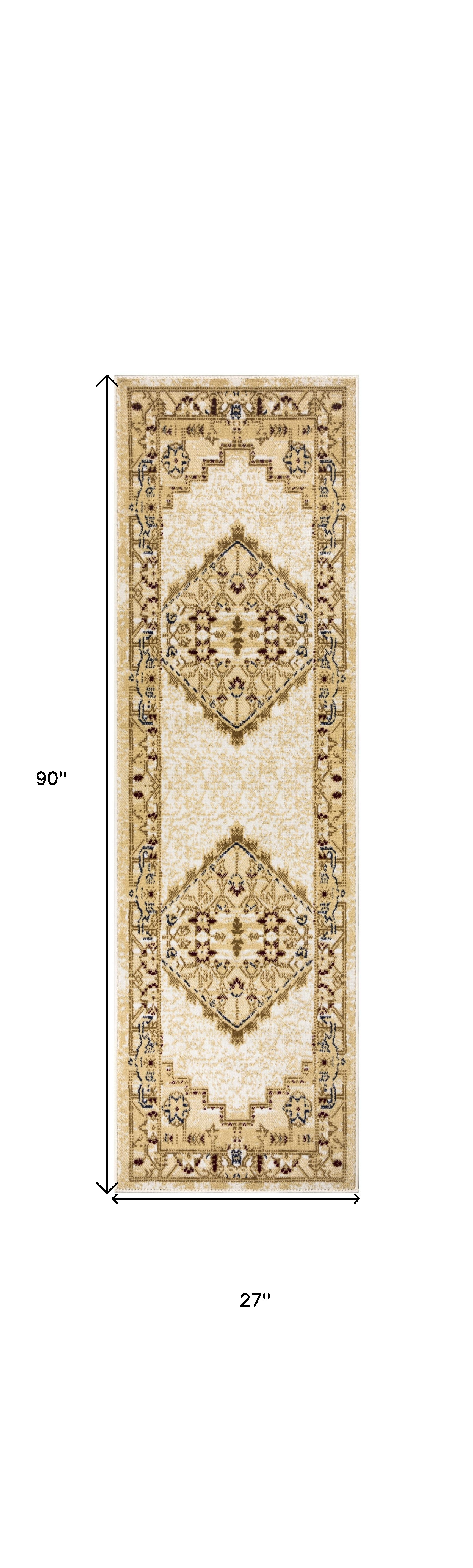 Set an inviting tone in your space with this 8-foot beige and ivory medallion distressed runner rug. Built to last, this rug crafted from polypropylene fibers is known for its durability and long lasting appeal. Rugs are a great way to showcase your style, hide imperfections, warm your home and reduce noise. This rectangular shaped rug features a abstract design that will add a functional and decorative accent to your space. This traditional style runner makes a great accent for the hallway, in front of cabinets, in the laundry room, or any other space you need a narrow and long rug. 27-inch h x 90-inch w x 0.5-inch d.