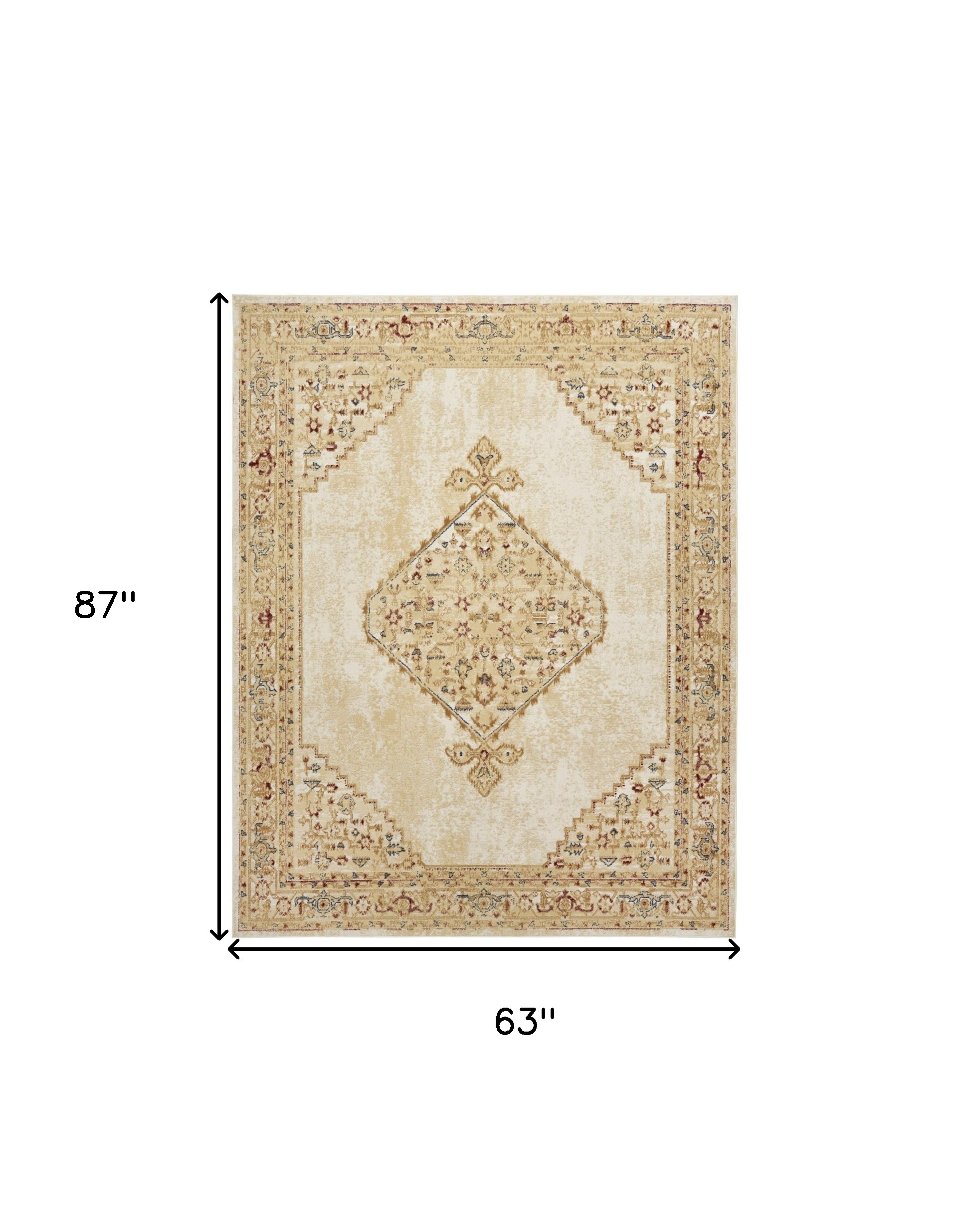 This 5-foot x 7-foot beige and ivory medallion power loom distressed area rug, is a great way to add warmth to a room. This rectangle shaped rug features a medallion design in beige and ivory to give it visual interest. A classic shape marries with good looking design for your space place this area rug against a hardwood or tile floor and it will enliven your living space with style and sophistication. 63-inch H x 87-inch W x 0.5-inch D