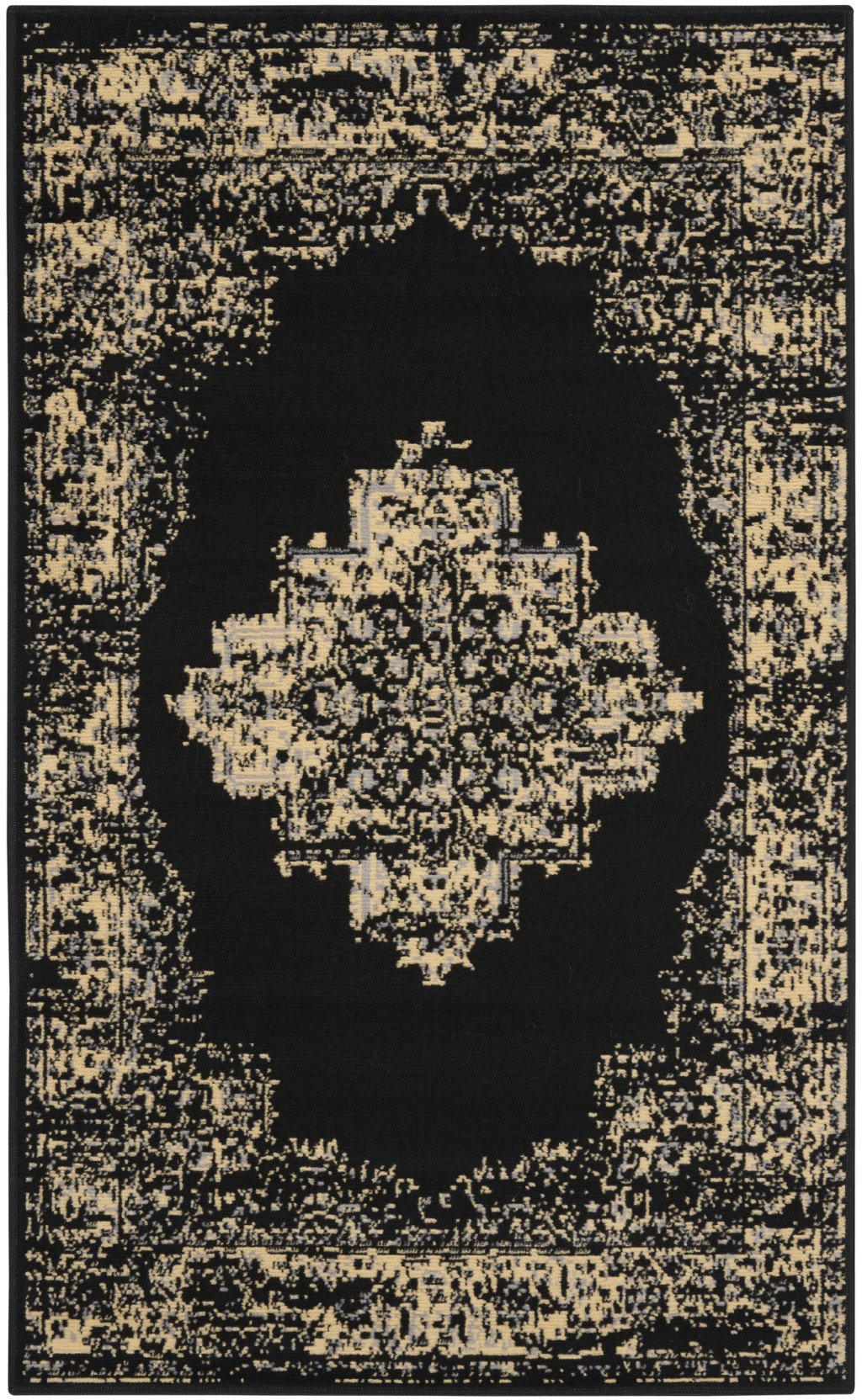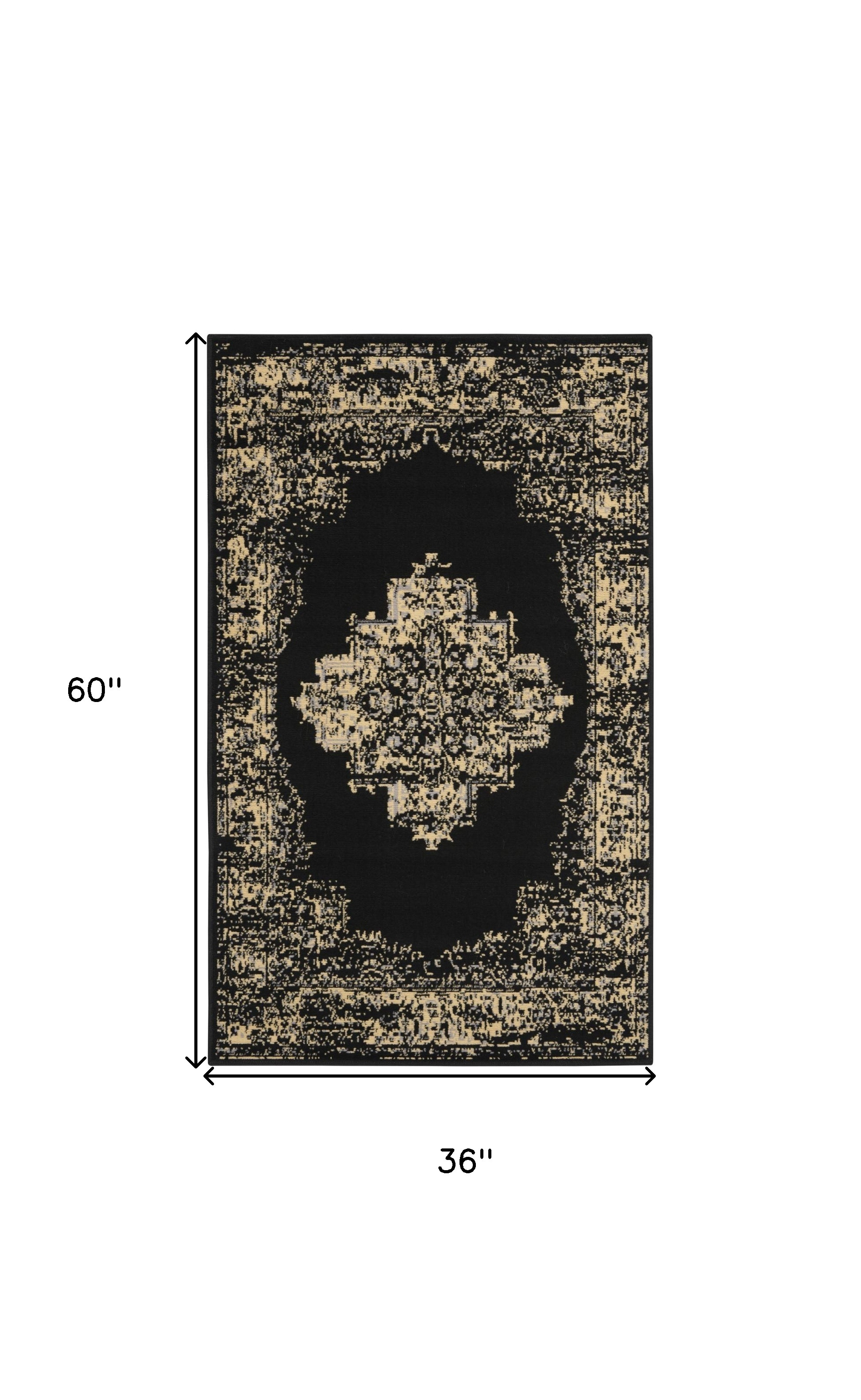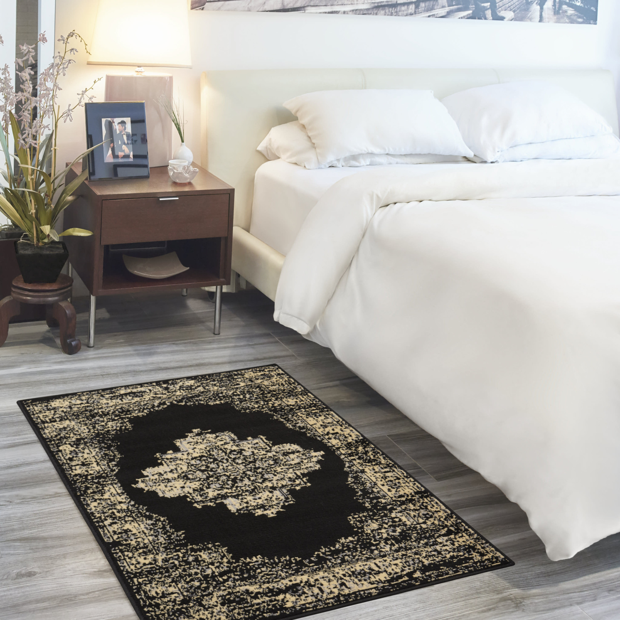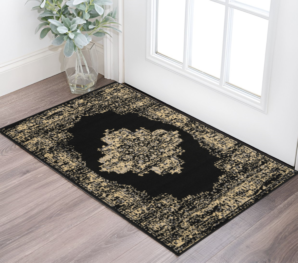 Add great coloration and comfortable texture to your space with this 3-foot x 5-foot tan and black medallion distressed non skid area rug. Ideal for spaces with kids and pets, this rug is stain resistant to help repel dirt and spilled liquids. Built to last, this rug crafted from polypropylene fibers is known for its durability and long lasting appeal. Rugs are a great way to showcase your style, hide imperfections, warm your home and reduce noise. This smaller sized, transitional styled rug is just what you need for your walkway, bedside, in front of door, cabinet, refrigerator, or chair. 36-inch h x 60-inch w x 0.5-inch d