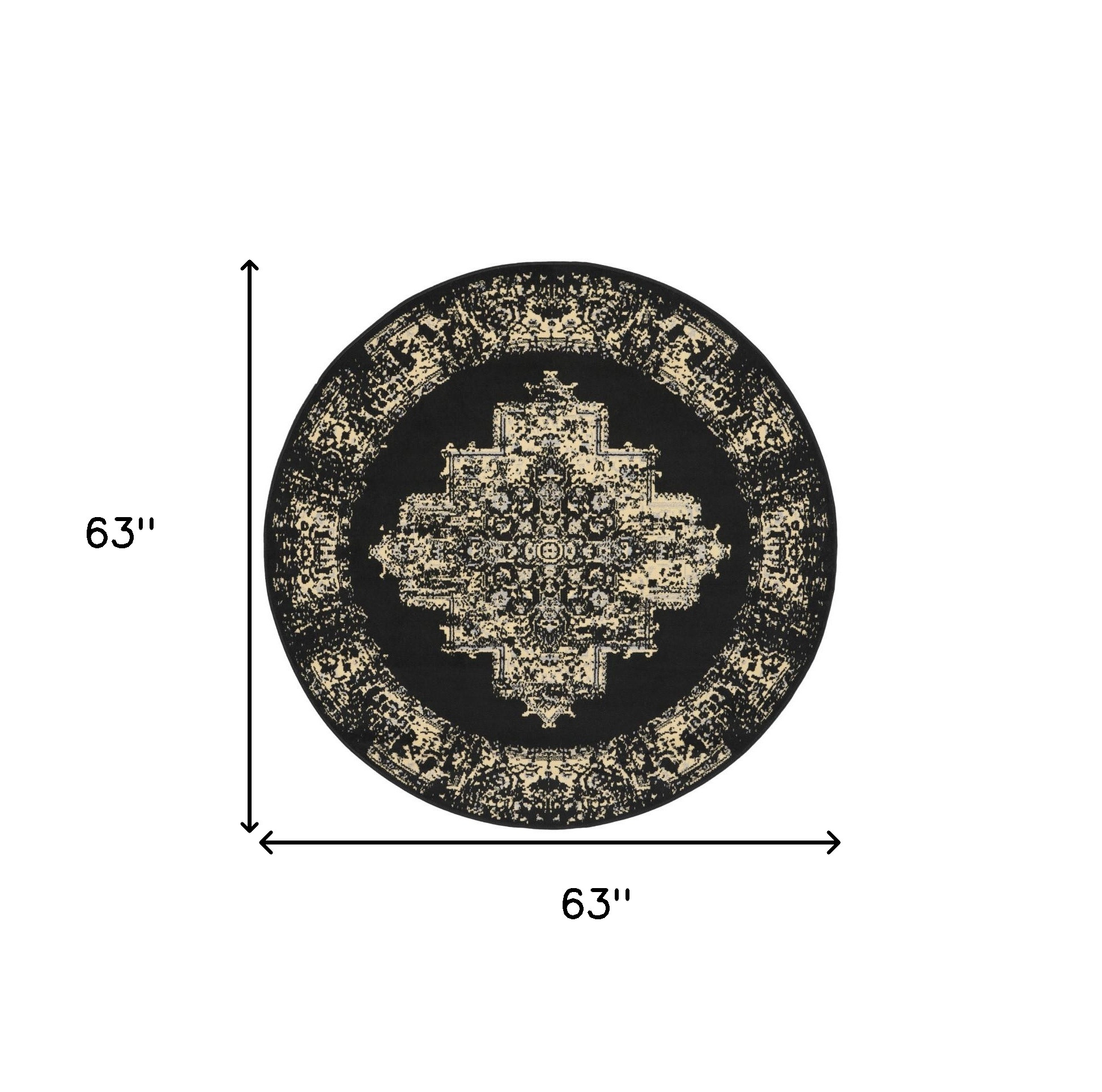 Add some artistry to your room with this 5-foot tan and black medallion distressed non skid round rug. Ideal for spaces with kids and pets, this rug is stain resistant to help repel dirt and spilled liquids. Built to last, this rug crafted from polypropylene fibers is known for its durability and long lasting appeal. Rugs are a great way to showcase your style, hide imperfections, warm your home and reduce noise. This geometric round shaped rug features a medallion pattern in tan that combines a good looking print with a unique and updated shape. The mix of shape, color, and design gives this rug refreshing visual interest. This larger sized, transitional styled rug is ready to create a focal point or statement piece in your room. 63-inch h x 63-inch w x 0.5-inch d