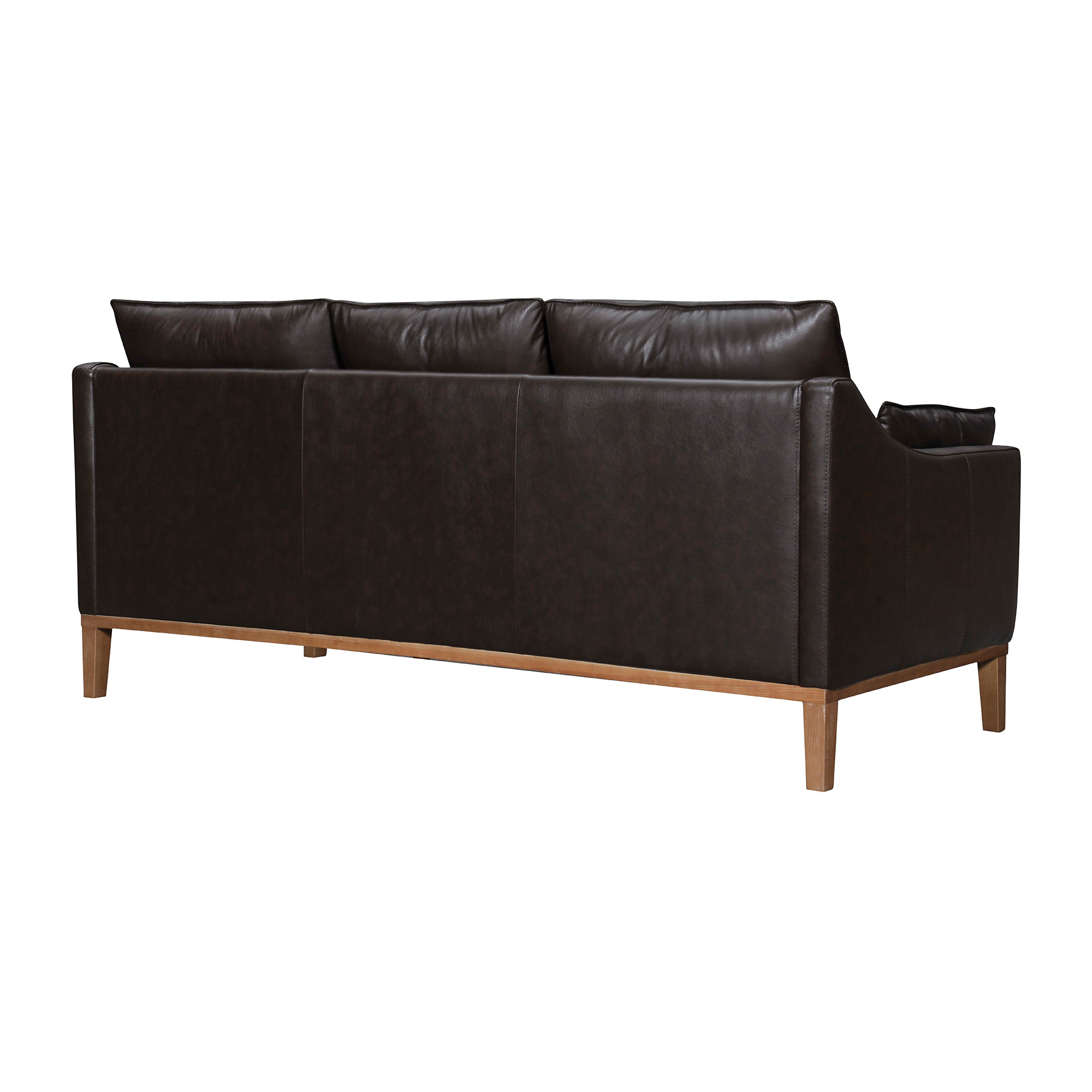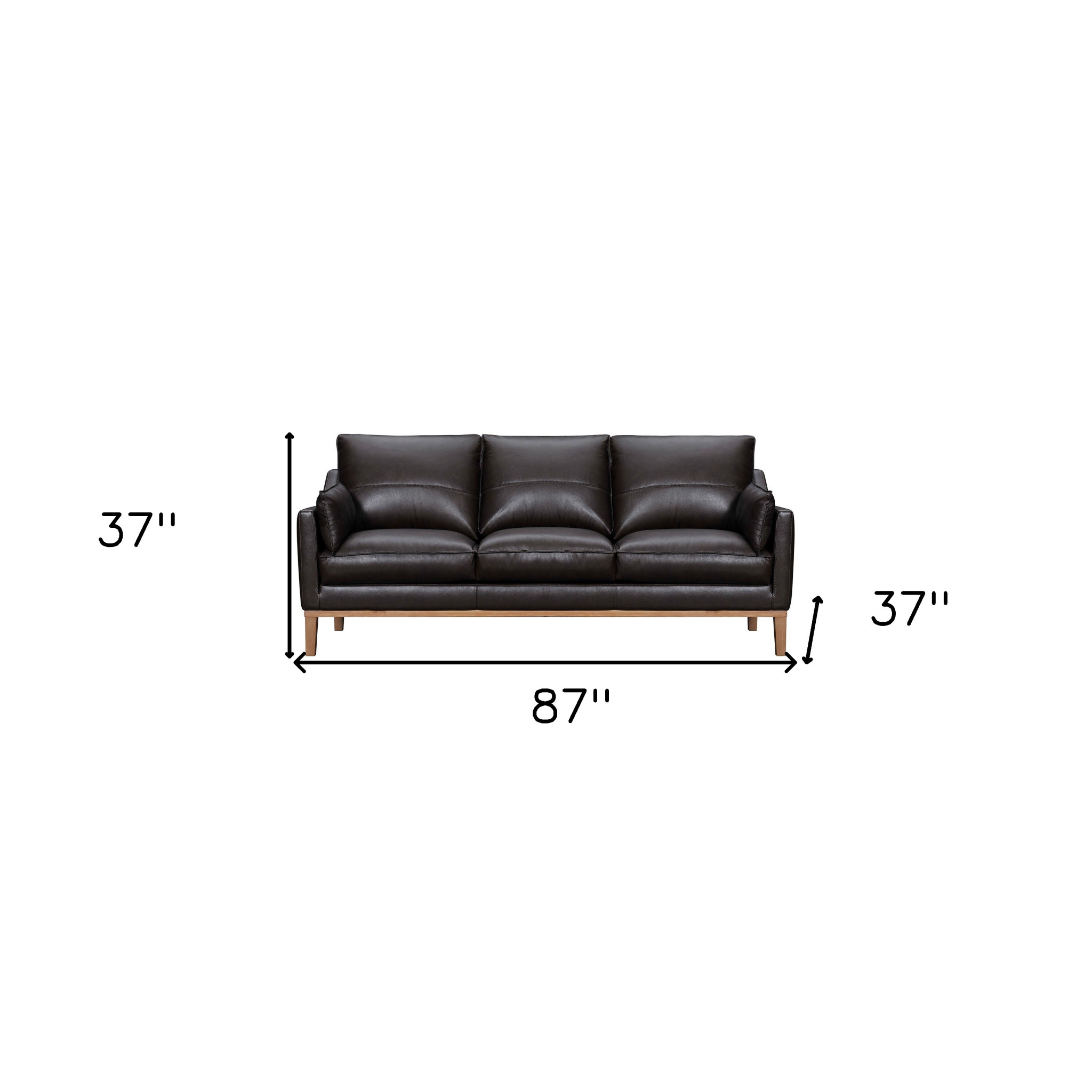 Superior construction from fabulously soft and high grade leather gives this 87-inch dark brown leather sofa and toss pillows with brown legs a leg up on the competition. The premium leather used makes your lounging luxuriously comfortable and adds an elegant appeal to your space. Solid colors give you lots of decorative options and are easy to work into your decor scheme. Web suspension construction gives this piece strong support and makes it comfortable to sit even for long periods of time. Removable seat cushions make this sofa easy to manage. Track arms offer a comfy place to rest. Built to last, this sofa will be a great centerpiece for your room. 37-inch H x 87-inch W x 37-inch D