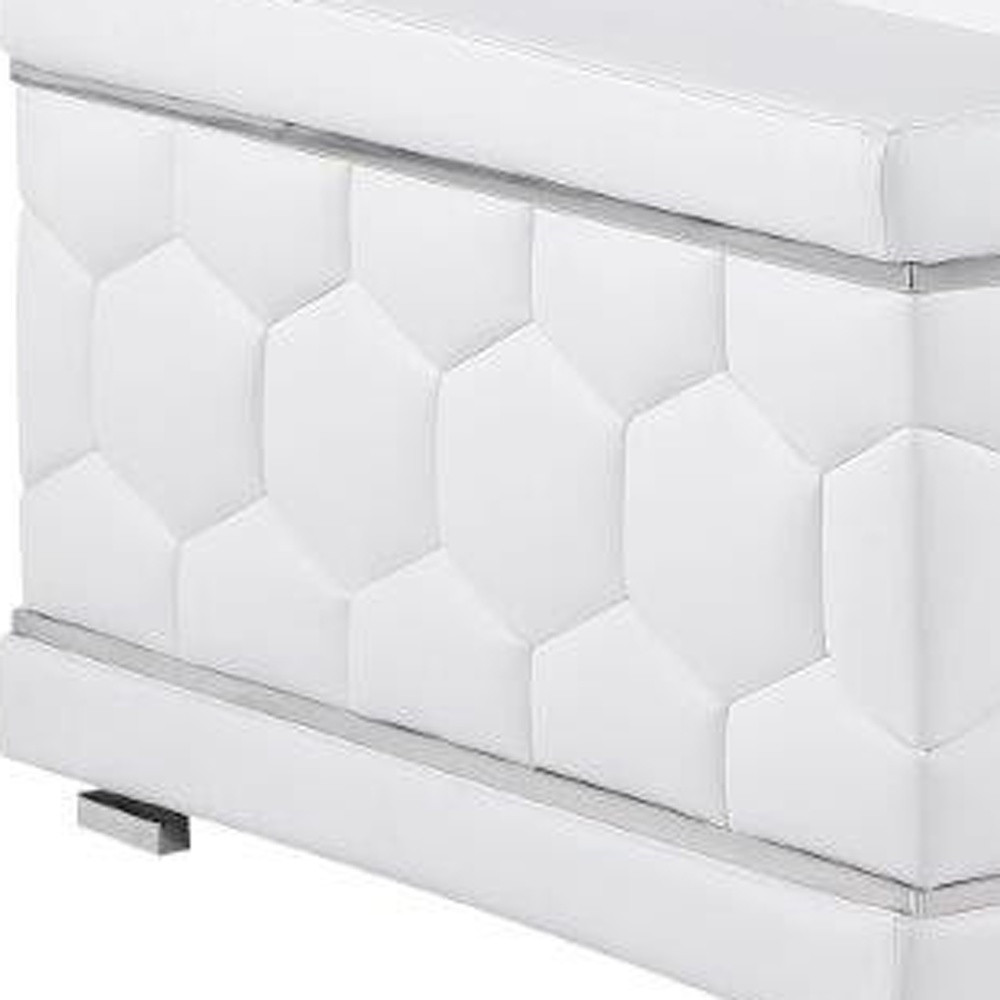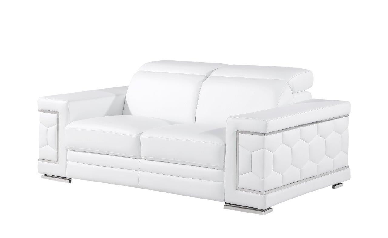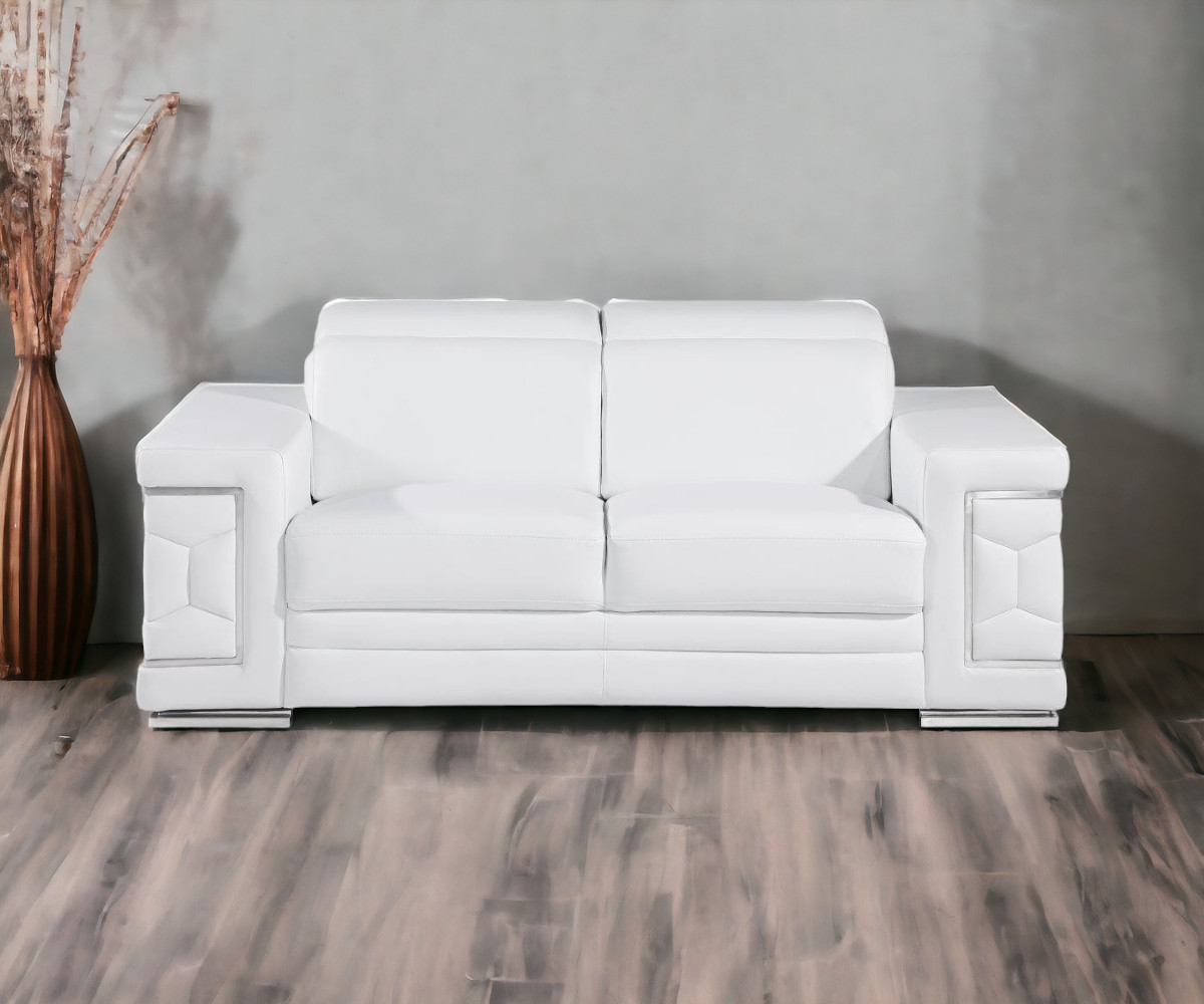Superior construction from fabulously soft and high grade leather gives this 71-inch white and silver genuine leather love seat a leg up on the competition. The premier grade Italian leather used makes your lounging luxuriously comfortable and adds an elegant appeal to your space. Square arms offer a comfy place to rest and give this piece some interest and shape. Silver steel legs effortlessly elevate the room and add a touch of contemporary design. A great showpiece for your room, this sofa is a must have. 29-inch H x 71-inch W x 41-inch D