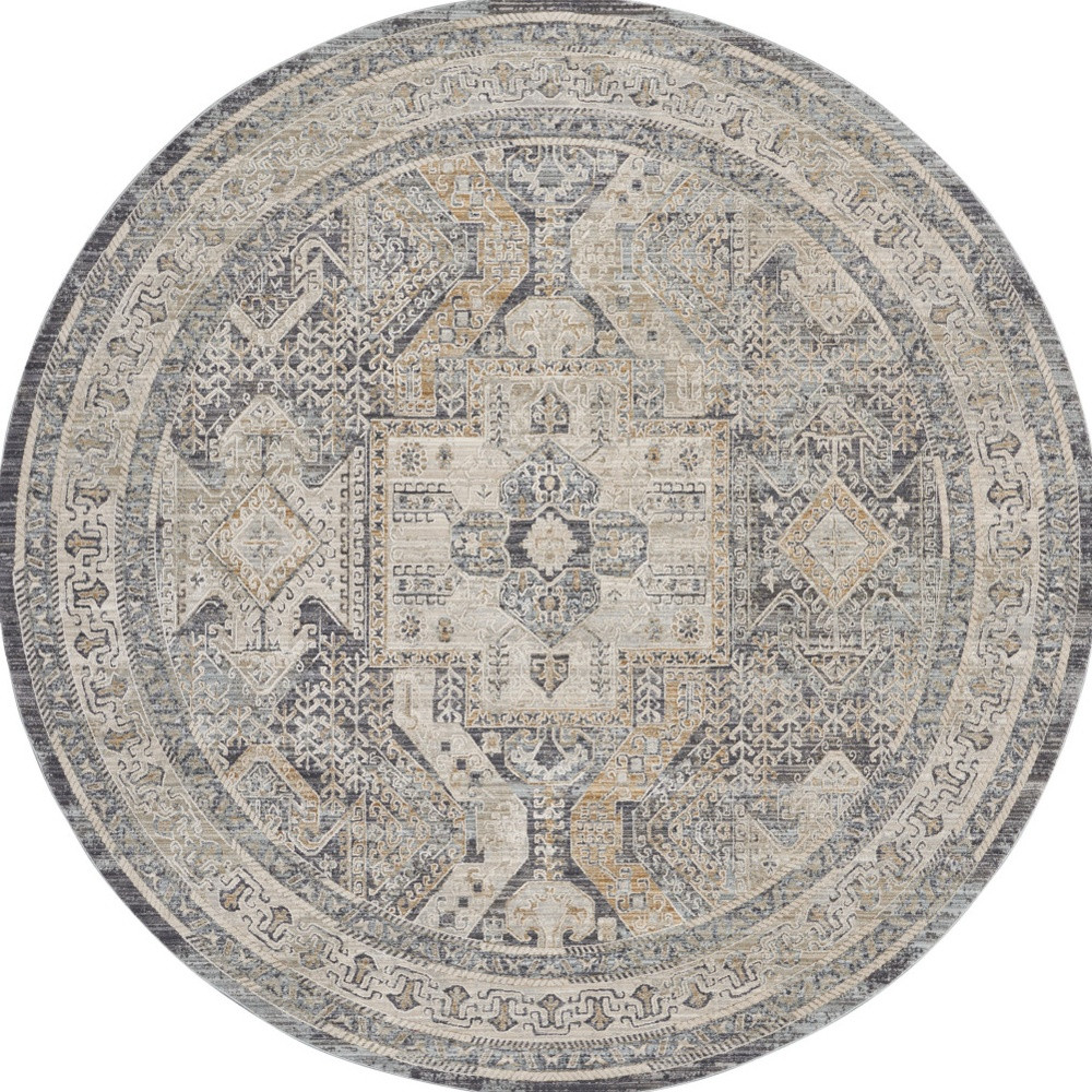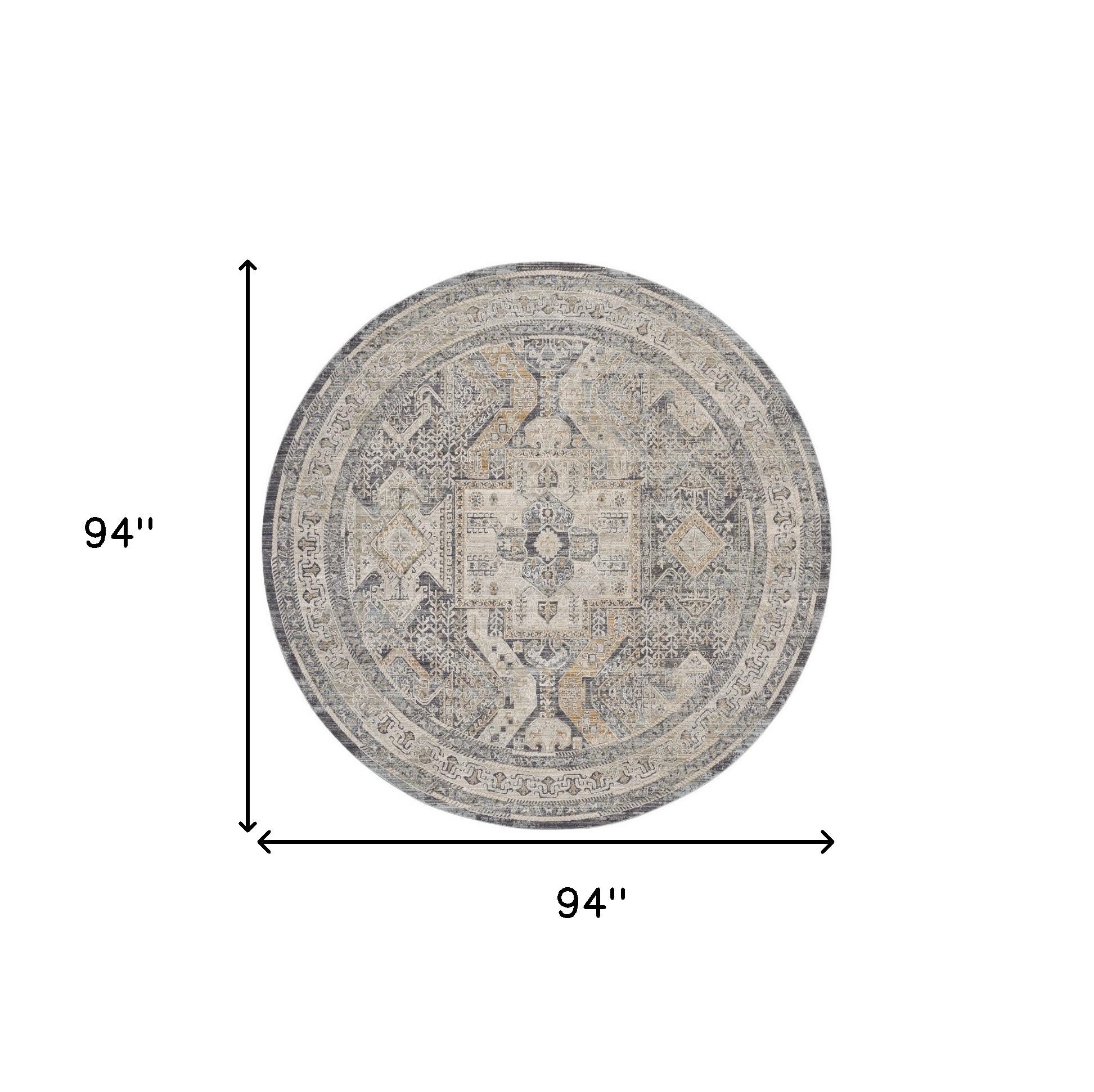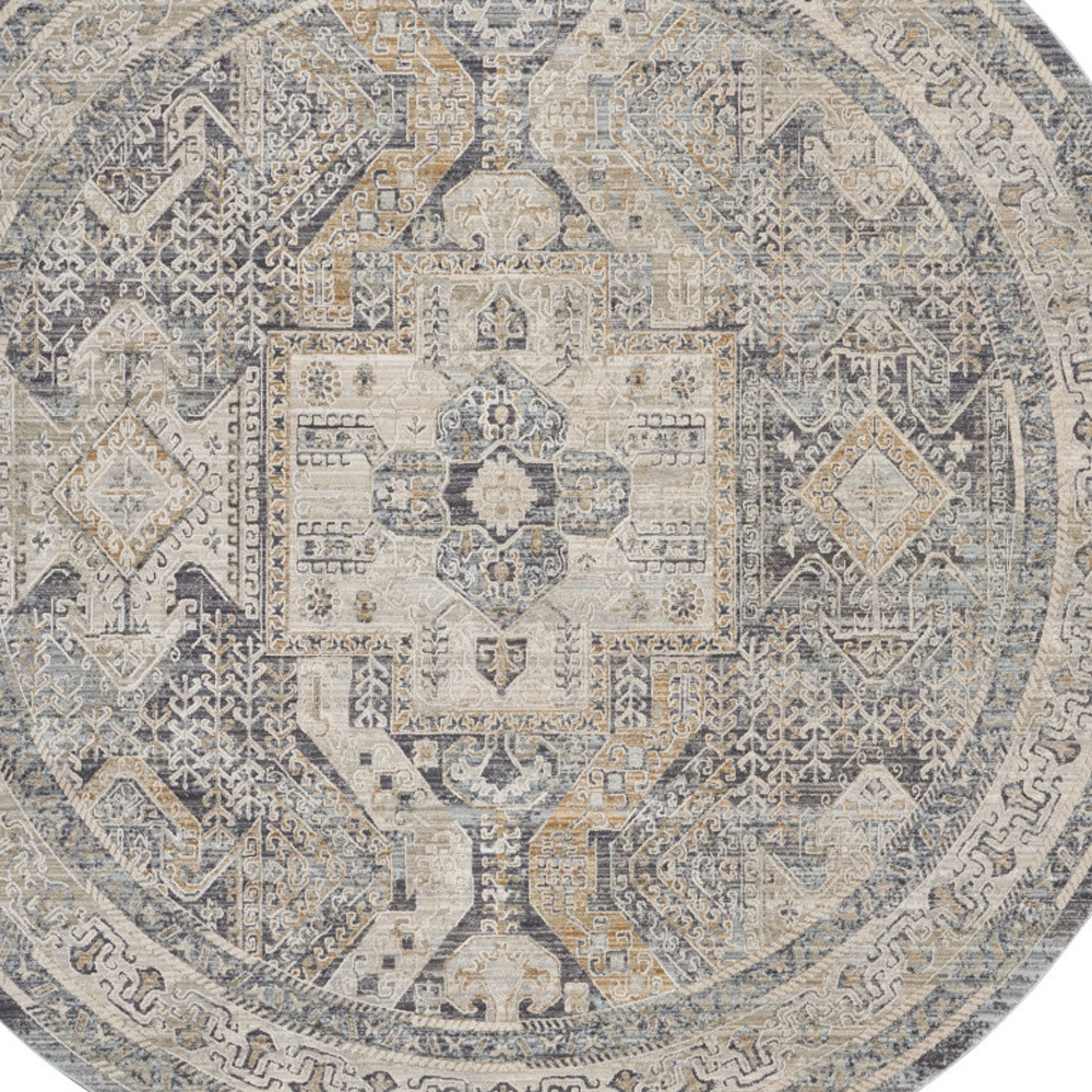 Add some artistry to your room with this 8-foot ivory and charcoal medallion distressed round rug with fringe. Built to last, this rug crafted from polyester and polypropylene fibers is known for its durability and long lasting appeal. Rugs are a great way to showcase your style, hide imperfections, warm your home and reduce noise. This geometric round shaped rug features a medallion pattern in ivory and charcoal that combines a good looking print with a unique and updated shape. The mix of shape, color, and design gives this rug refreshing visual interest. Tassel ends bring a timeless and fashionable look to your interior. This larger sized, bohemian styled rug is ready to create a focal point or statement piece in your room. 94-inch h x 94-inch w x 0.25-inch d.