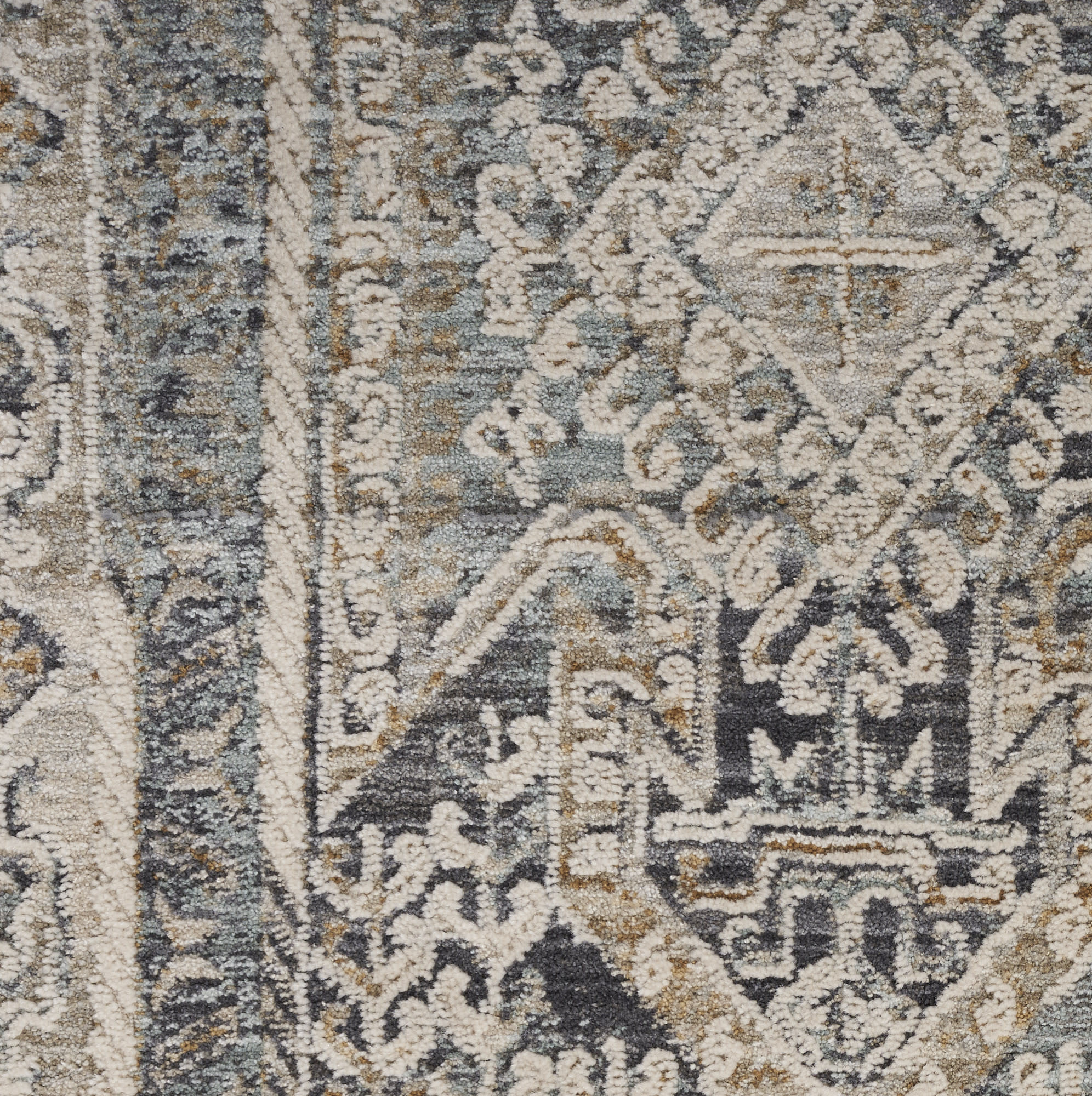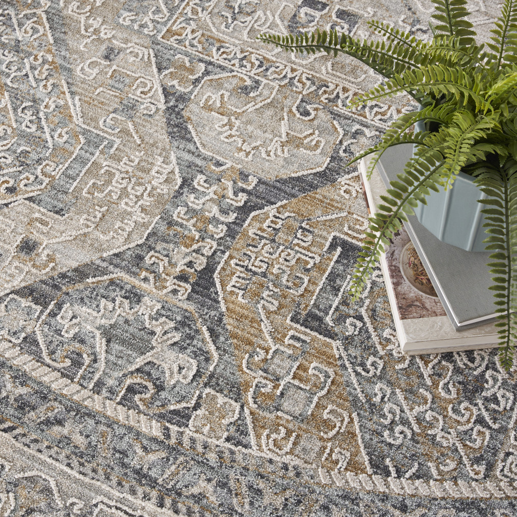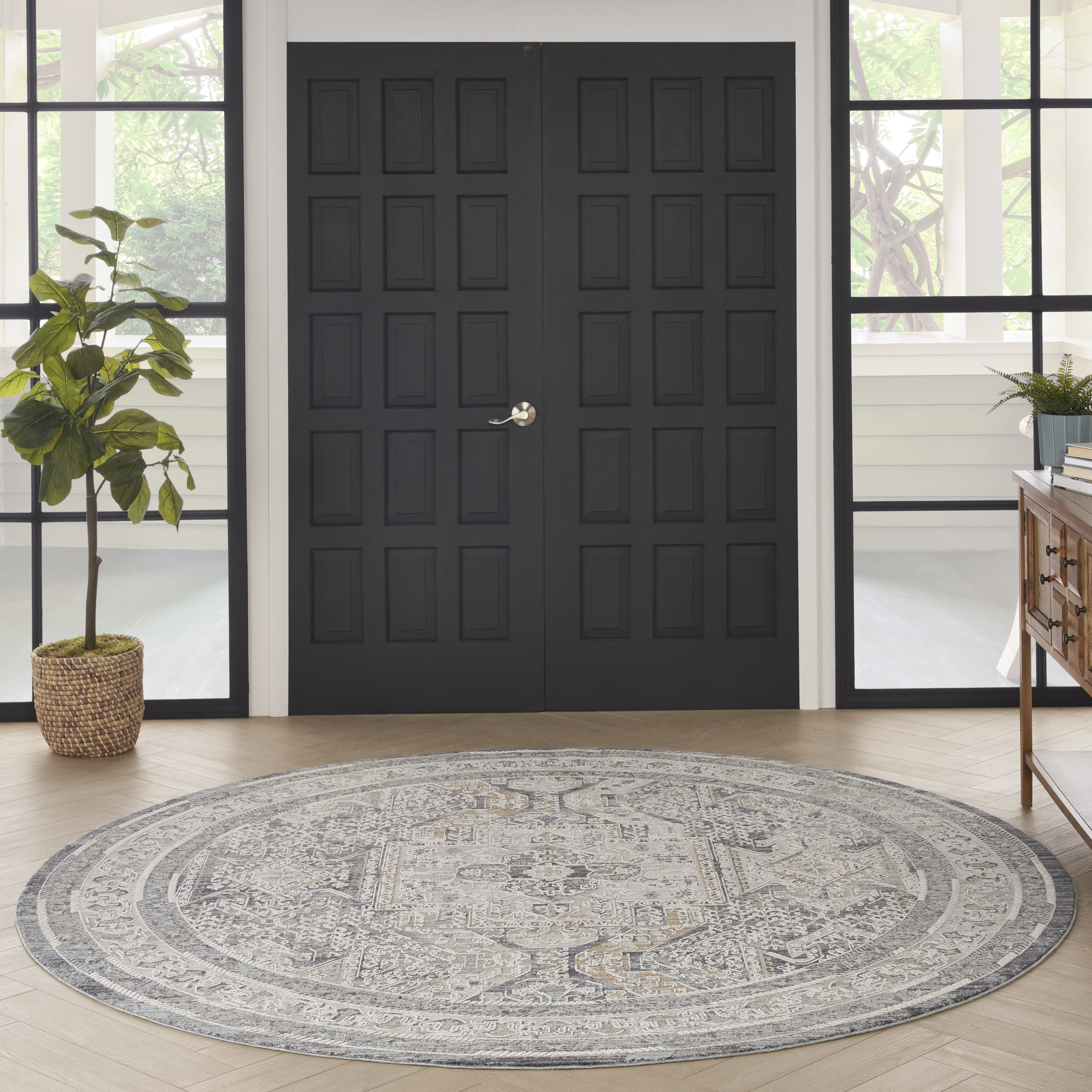 Add some artistry to your room with this 8-foot ivory and charcoal medallion distressed round rug with fringe. Built to last, this rug crafted from polyester and polypropylene fibers is known for its durability and long lasting appeal. Rugs are a great way to showcase your style, hide imperfections, warm your home and reduce noise. This geometric round shaped rug features a medallion pattern in ivory and charcoal that combines a good looking print with a unique and updated shape. The mix of shape, color, and design gives this rug refreshing visual interest. Tassel ends bring a timeless and fashionable look to your interior. This larger sized, bohemian styled rug is ready to create a focal point or statement piece in your room. 94-inch h x 94-inch w x 0.25-inch d.