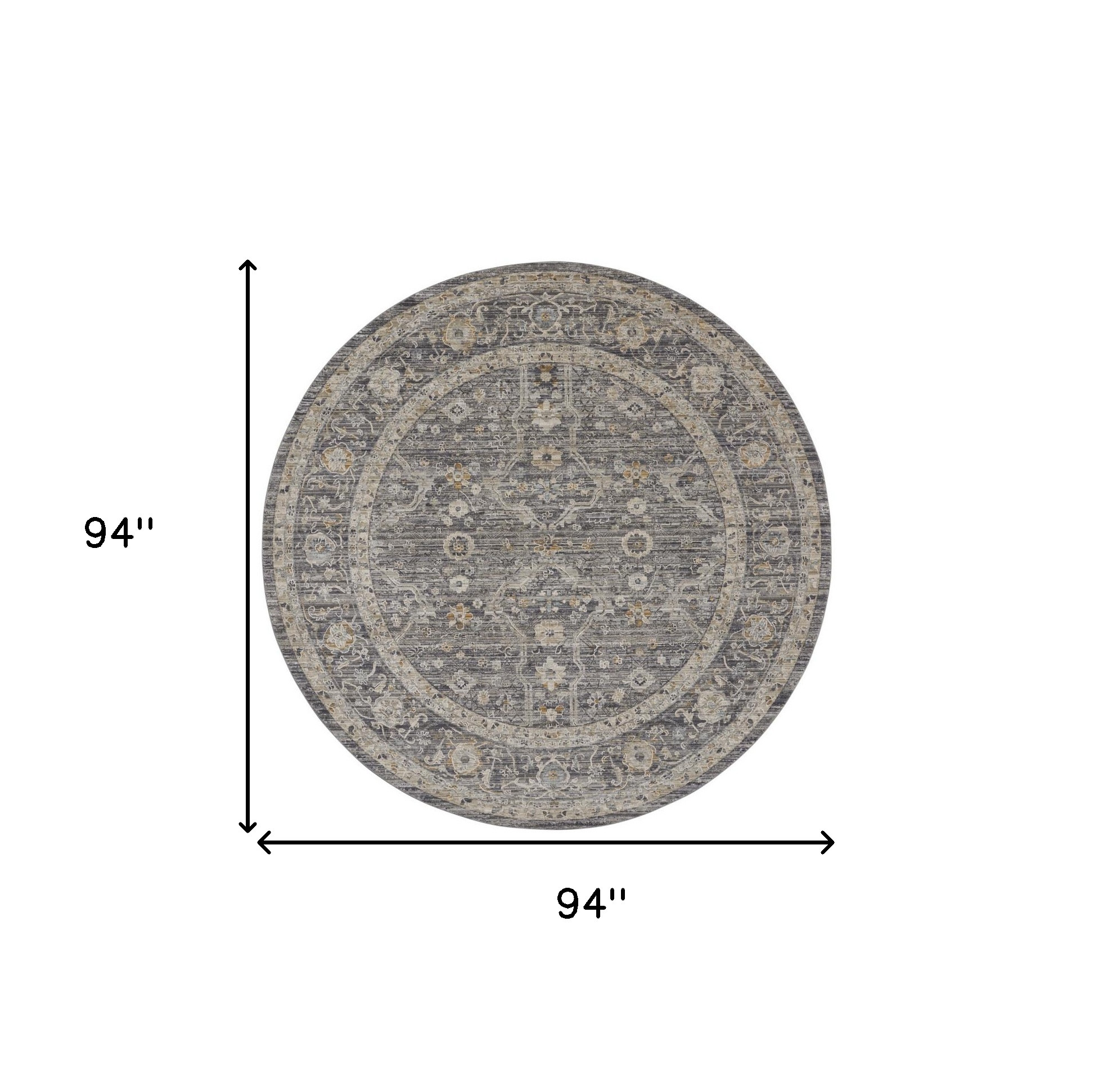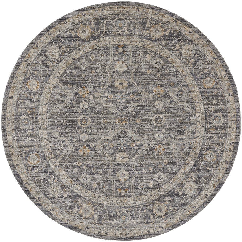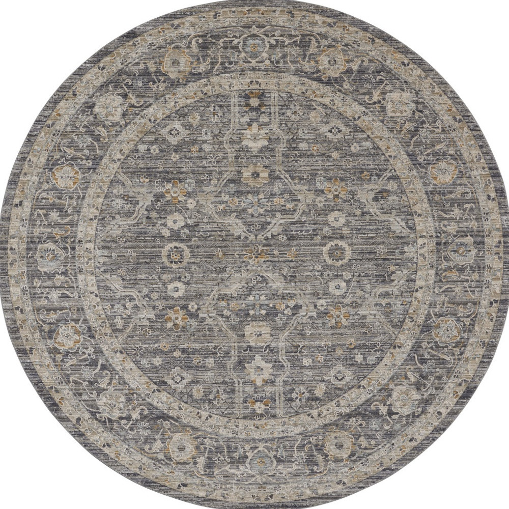 Add great coloration and comfortable texture to your space with this 8-foot slate gray brown and ivory floral distressed round rug with fringe. Built to last, this rug crafted from polyester and polypropylene fibers is known for its durability and long lasting appeal. Rugs are a great way to showcase your style, hide imperfections, warm your home and reduce noise. This geometric round shaped rug features a floral pattern in slate gray, brown, and ivory that combines a good looking print with a unique and updated shape. The mix of shape, color, and design gives this rug refreshing visual interest. Tassel ends bring a timeless and fashionable look to your interior. This larger sized, transitional styled rug is ready to create a focal point or statement piece in your room. 94-inch h x 94-inch w x 0.25-inch d.