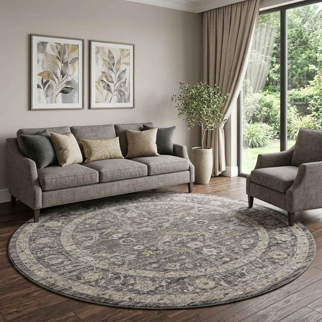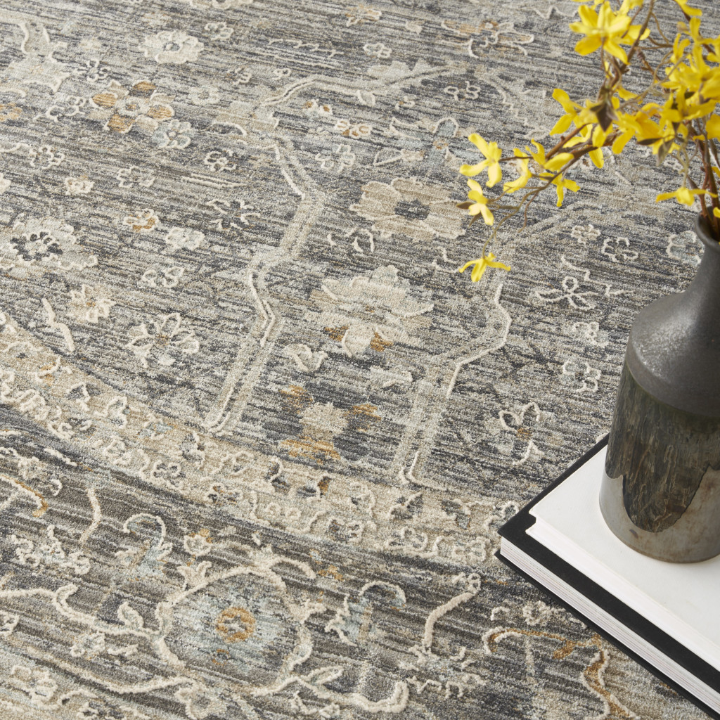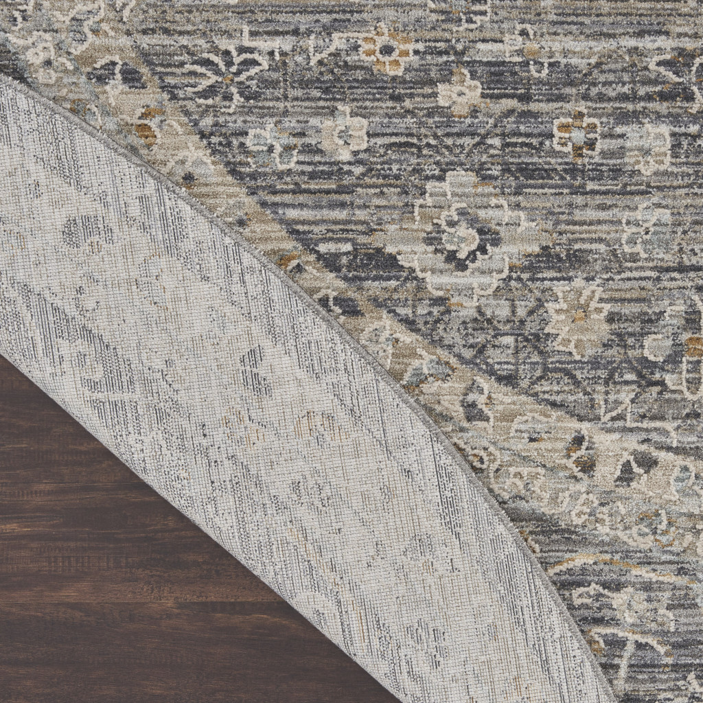 Add great coloration and comfortable texture to your space with this 8-foot slate gray brown and ivory floral distressed round rug with fringe. Built to last, this rug crafted from polyester and polypropylene fibers is known for its durability and long lasting appeal. Rugs are a great way to showcase your style, hide imperfections, warm your home and reduce noise. This geometric round shaped rug features a floral pattern in slate gray, brown, and ivory that combines a good looking print with a unique and updated shape. The mix of shape, color, and design gives this rug refreshing visual interest. Tassel ends bring a timeless and fashionable look to your interior. This larger sized, transitional styled rug is ready to create a focal point or statement piece in your room. 94-inch h x 94-inch w x 0.25-inch d.