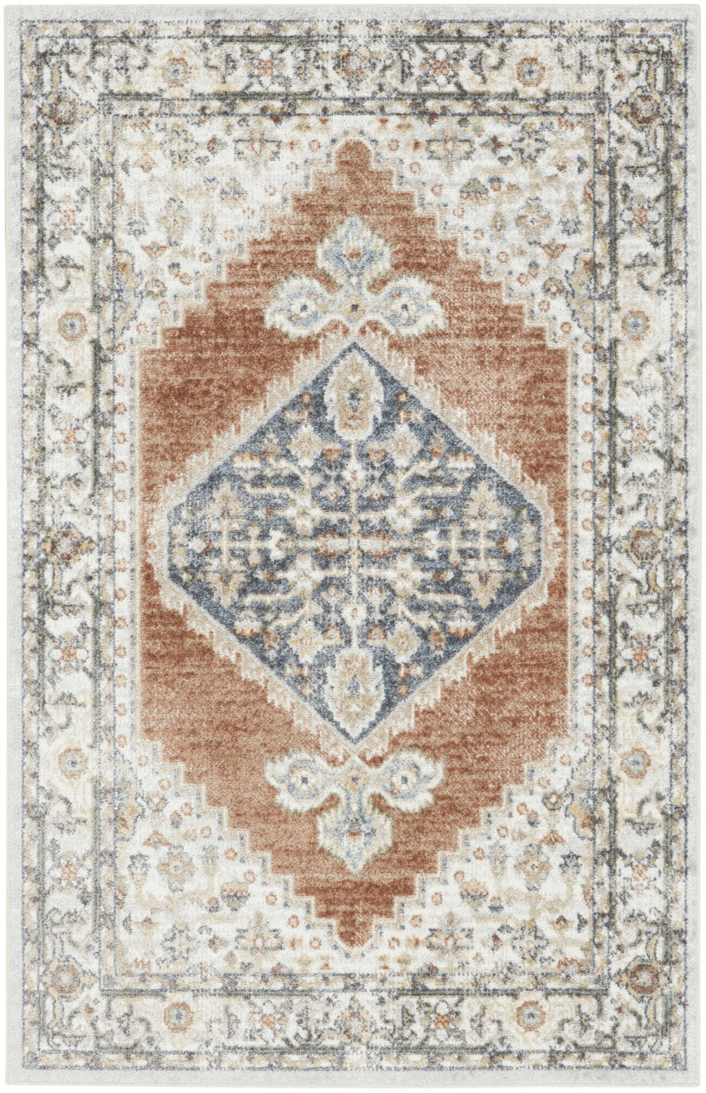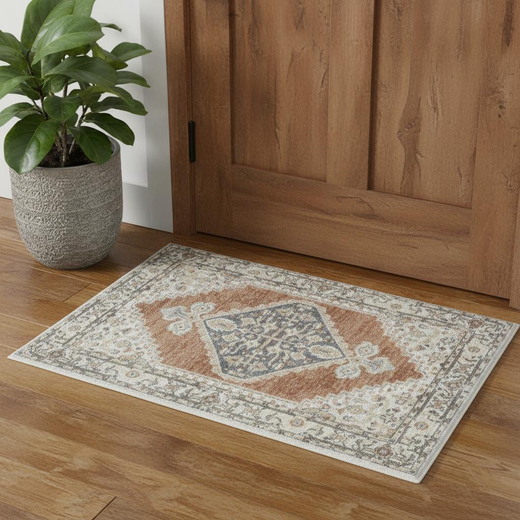 Add some artistry to your room with this 2-foot x 4-foot gray and orange floral medallion distressed washable area rug. Built to last, this rug crafted from polyester fibers is known for its durability and long lasting appeal. Rugs are a great way to showcase your style, hide imperfections, warm your home and reduce noise. This smaller sized, transitional styled rug is just what you need for your walkway, bedside, in front of door, cabinet, refrigerator, or chair. 26-inch h x 48-inch w x 0.25-inch d.