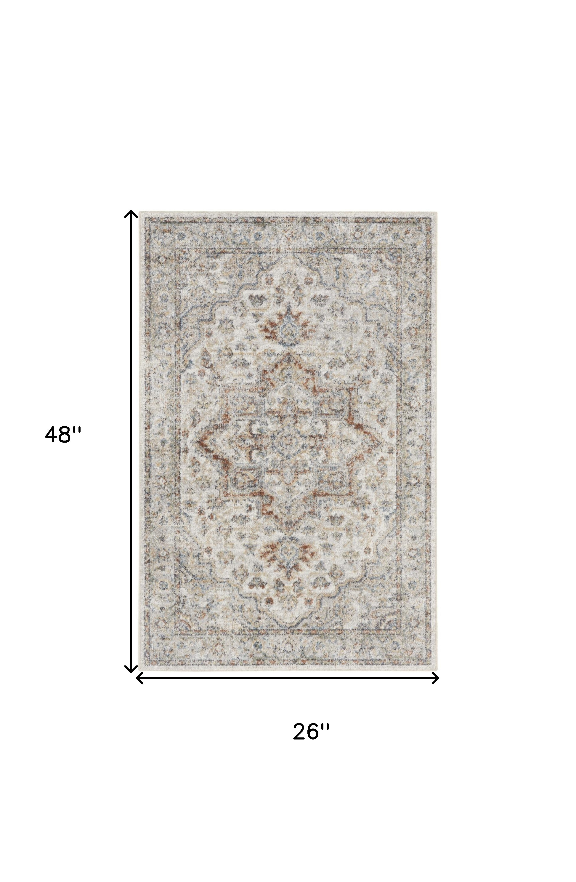 Add great coloration and comfortable texture to your space with this 2-foot x 4-foot gray and ivory floral medallion washable area rug. Built to last, this rug crafted from polyester fibers is known for its durability and long lasting appeal. Rugs are a great way to showcase your style, hide imperfections, warm your home and reduce noise. This smaller sized, bohemian styled rug is just what you need for your walkway, bedside, in front of door, cabinet, refrigerator, or chair. 26-inch h x 48-inch w x 0.25-inch d.
