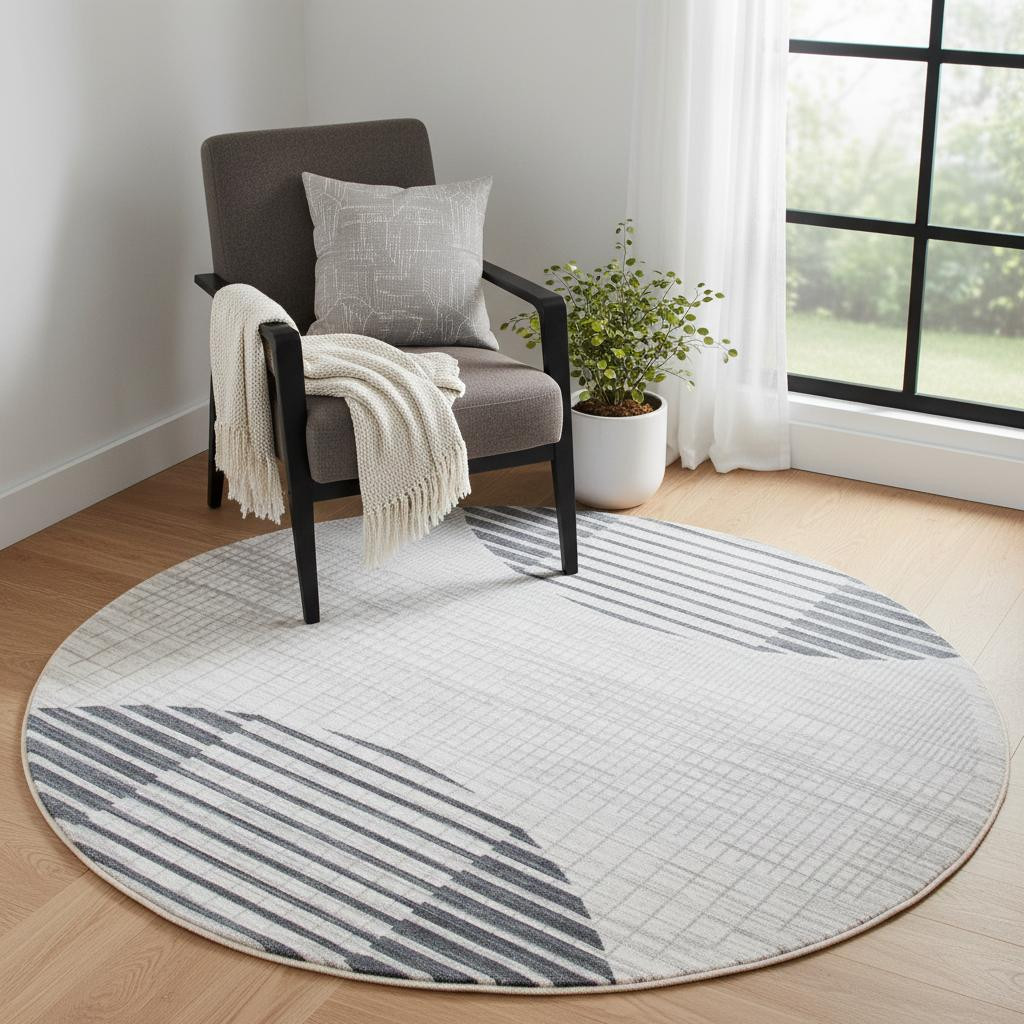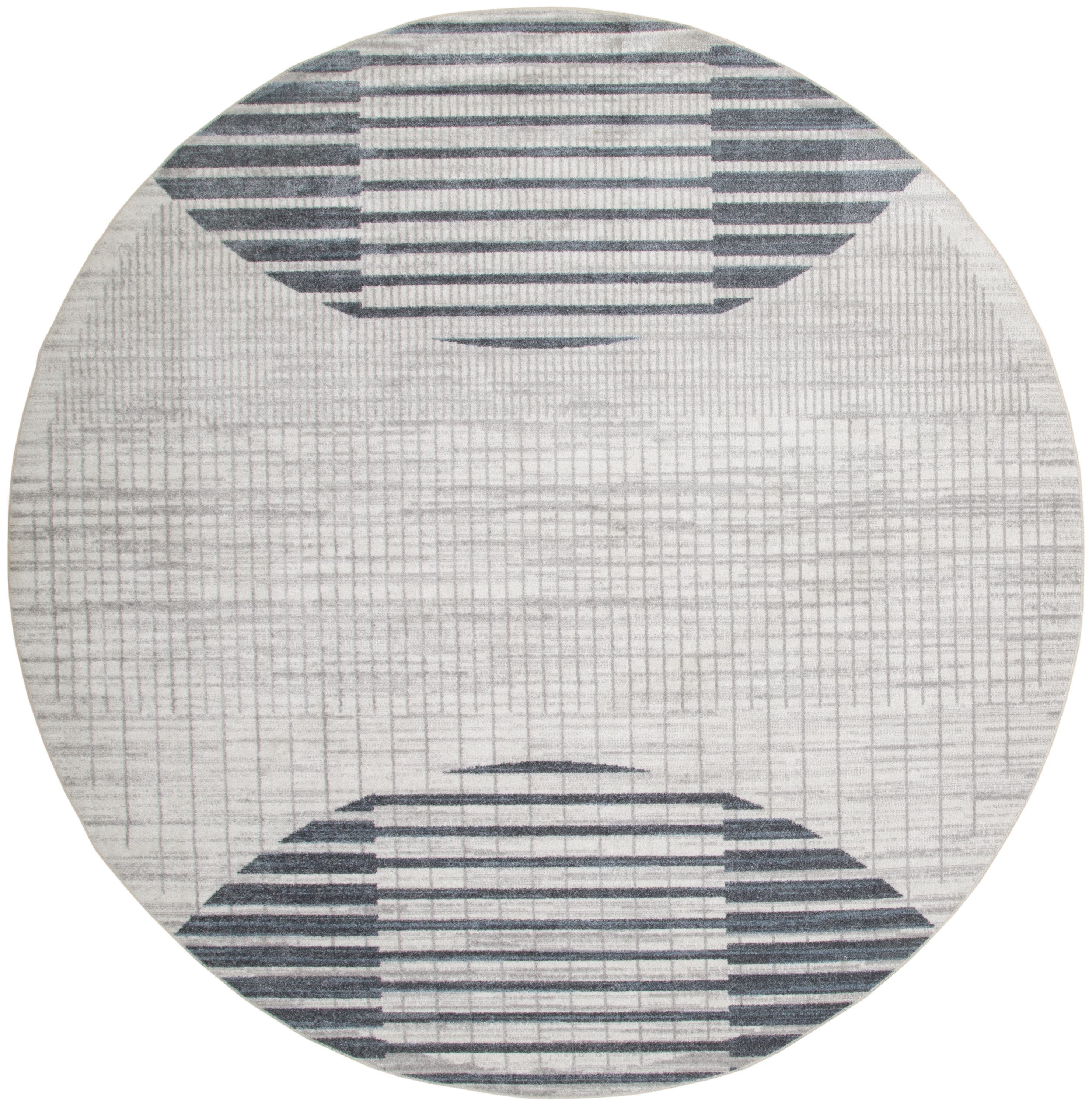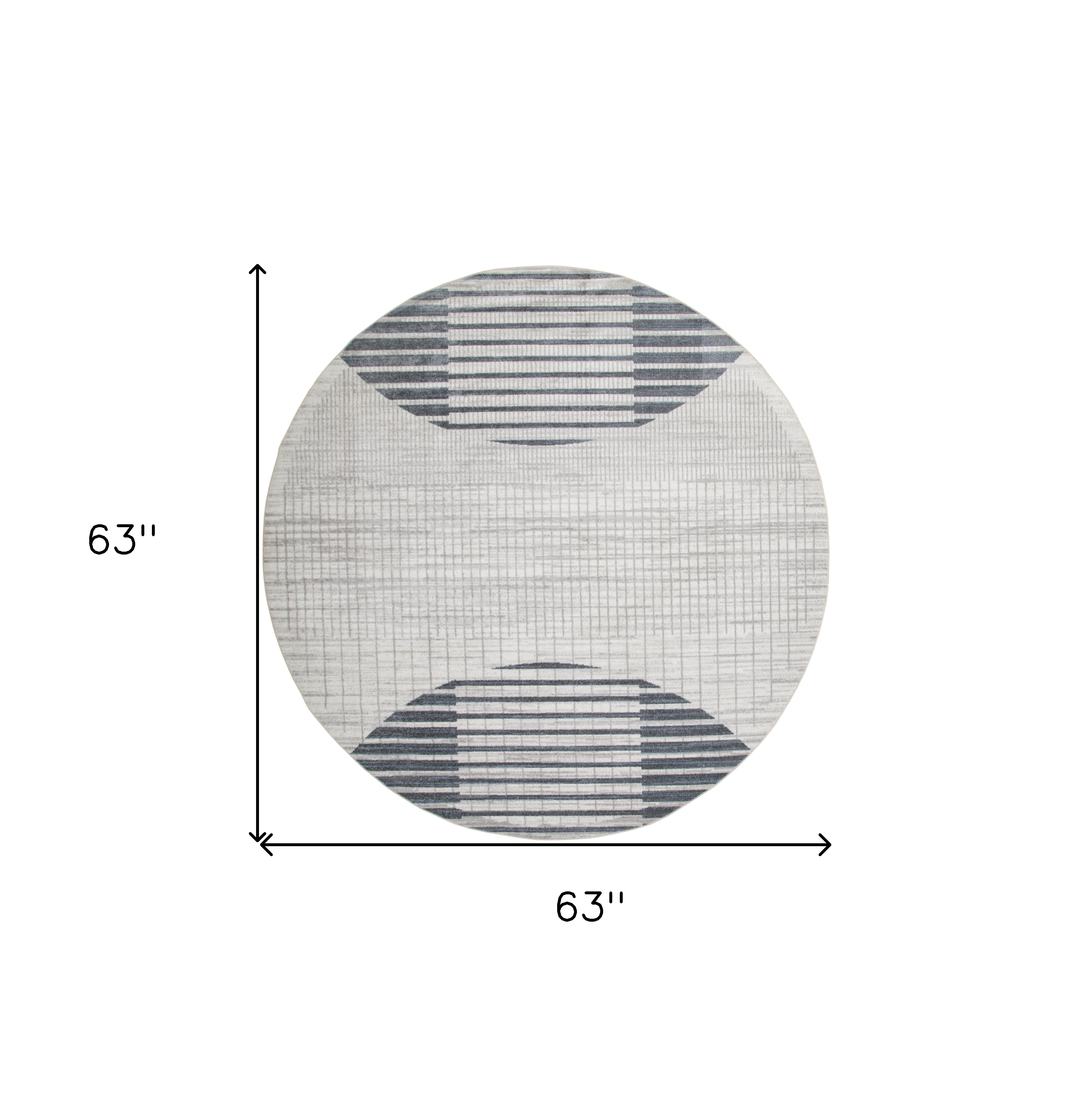 This 5-foot ivory and blue geometric washable round rug, is a great way to add warmth to a room. Ideal for spaces with kids and pets, this rug is stain resistant to help repel dirt and spilled liquids. Built to last, this rug crafted from polyester fibers is known for its durability and long lasting appeal. Rugs are a great way to showcase your style, hide imperfections, warm your home and reduce noise. This geometric round shaped rug features a geometric pattern in ivory and blue that combines a good looking print with a unique and updated shape. The mix of shape, color, and design gives this rug refreshing visual interest. This larger sized, modern styled rug is ready to create a focal point or statement piece in your room. 63-inch h x 63-inch w x 0.25-inch d.