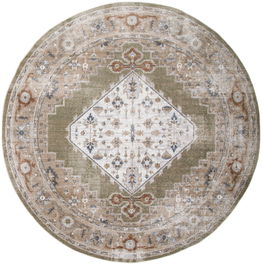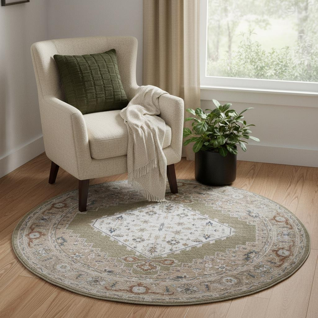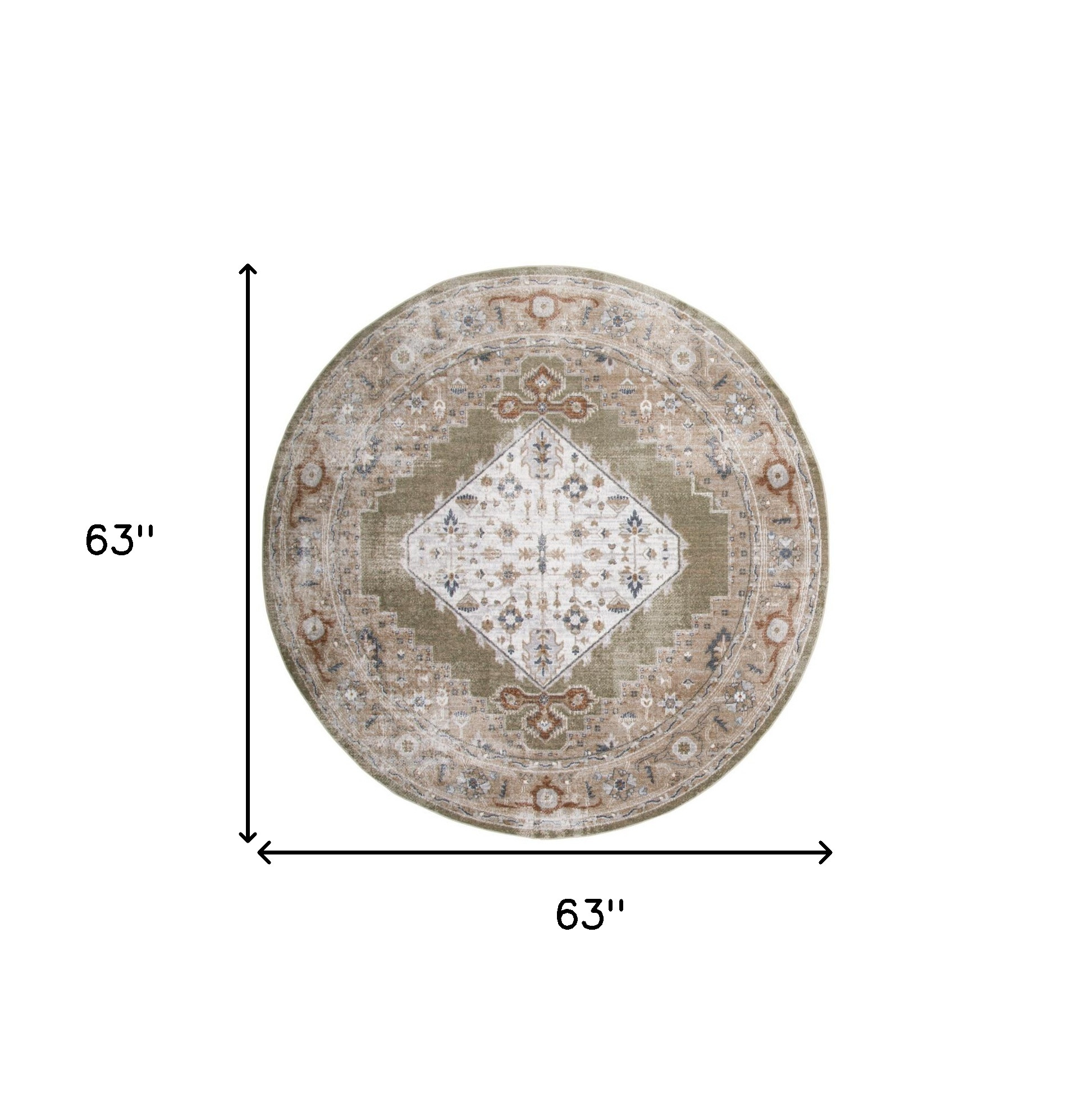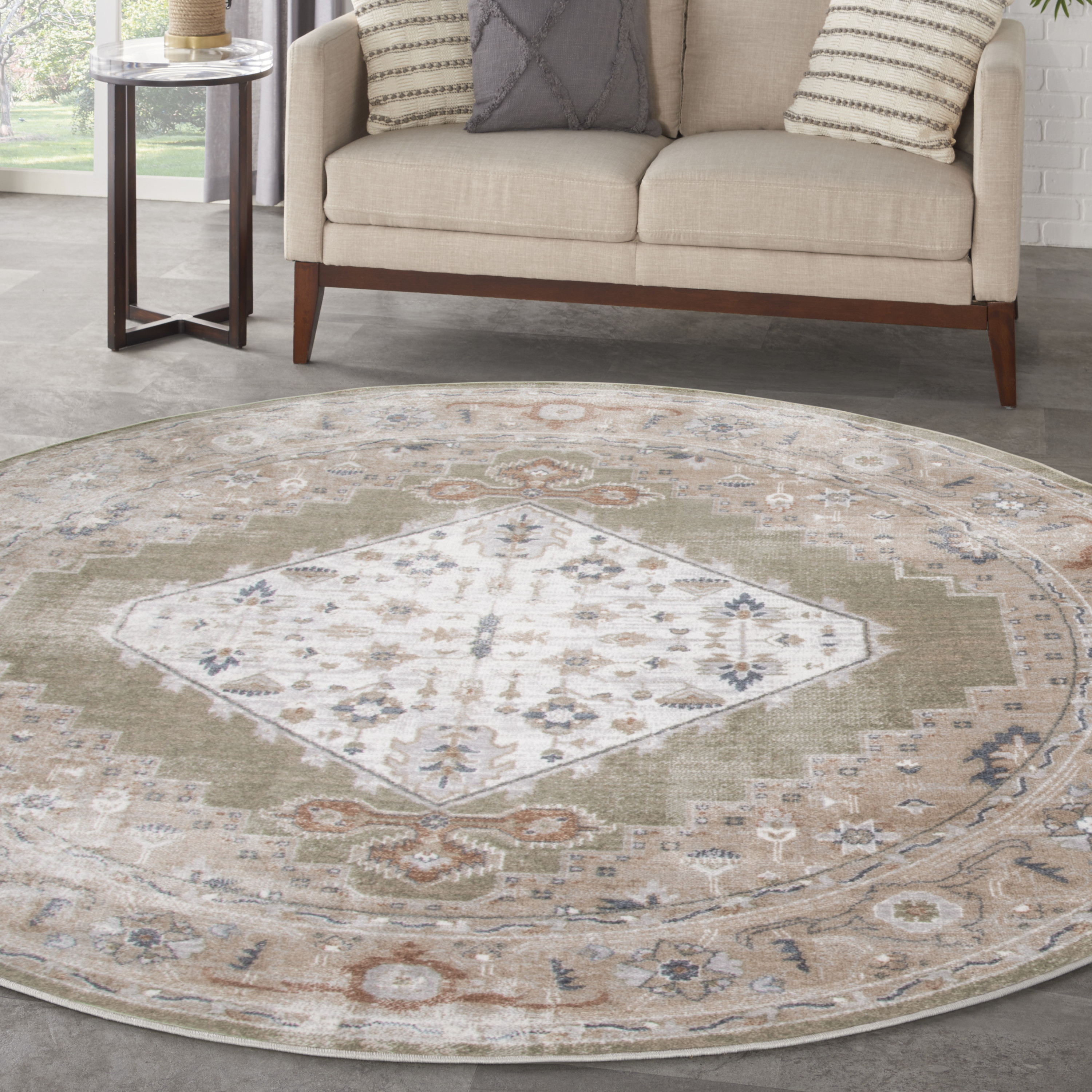 Add great coloration and comfortable texture to your space with this 5-foot off white and brown floral distressed round rug. Built to last, this rug crafted from polyester fibers is known for its durability and long lasting appeal. Rugs are a great way to showcase your style, hide imperfections, warm your home and reduce noise. This geometric round shaped rug features a floral pattern in off white and brown that combines a good looking print with a unique and updated shape. The mix of shape, color, and design gives this rug refreshing visual interest. This larger sized, transitional styled rug is ready to create a focal point or statement piece in your room. 63-inch h x 63-inch w x 0.25-inch d.