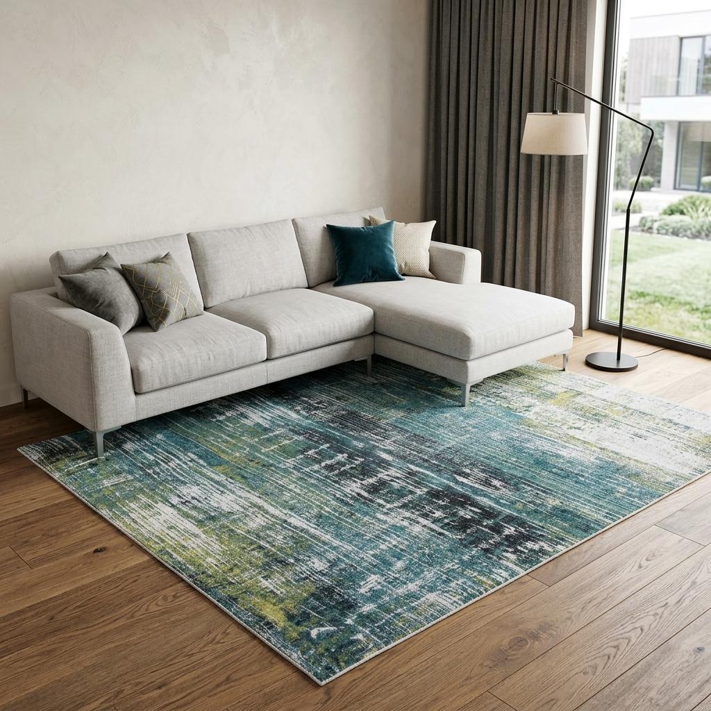 This 8-foot x 11-foot blue and green abstract non skid area rug, is a great way to add warmth to a room. This rectangle shaped rug features a abstract design that will add a functional and decorative accent to your space. This larger sized rug is ideal to create a focal point or statement piece in your room. 84-inch h x 132-inch w x 0.12-inch d